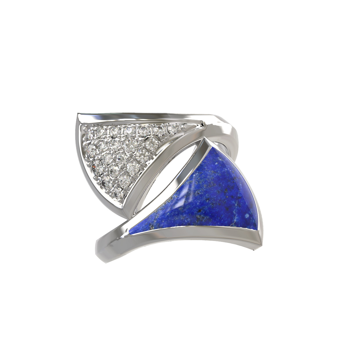 Центральный элемент композиции — сочетание глубокого синего оттенка лазурита и ослепительного сияния вставок. На изделии расположено 22 драгоценных камня круглой формы: прозрачные бриллианты создают яркую игру света, контрастируя с насыщенным цветом лазурита. Холодный оттенок металла идеально дополняет палитру вставок, придавая украшению благородный и завершенный вид.