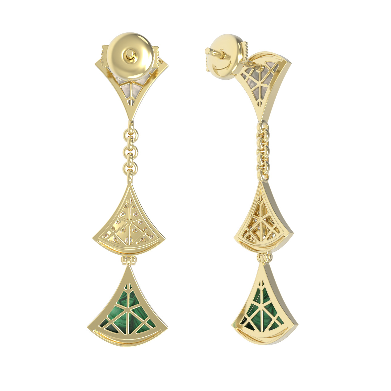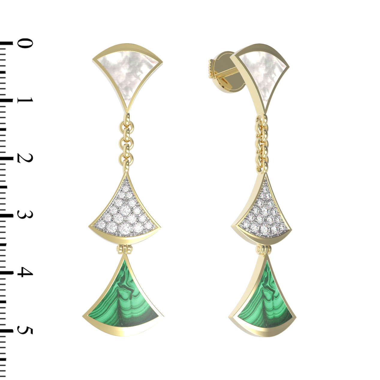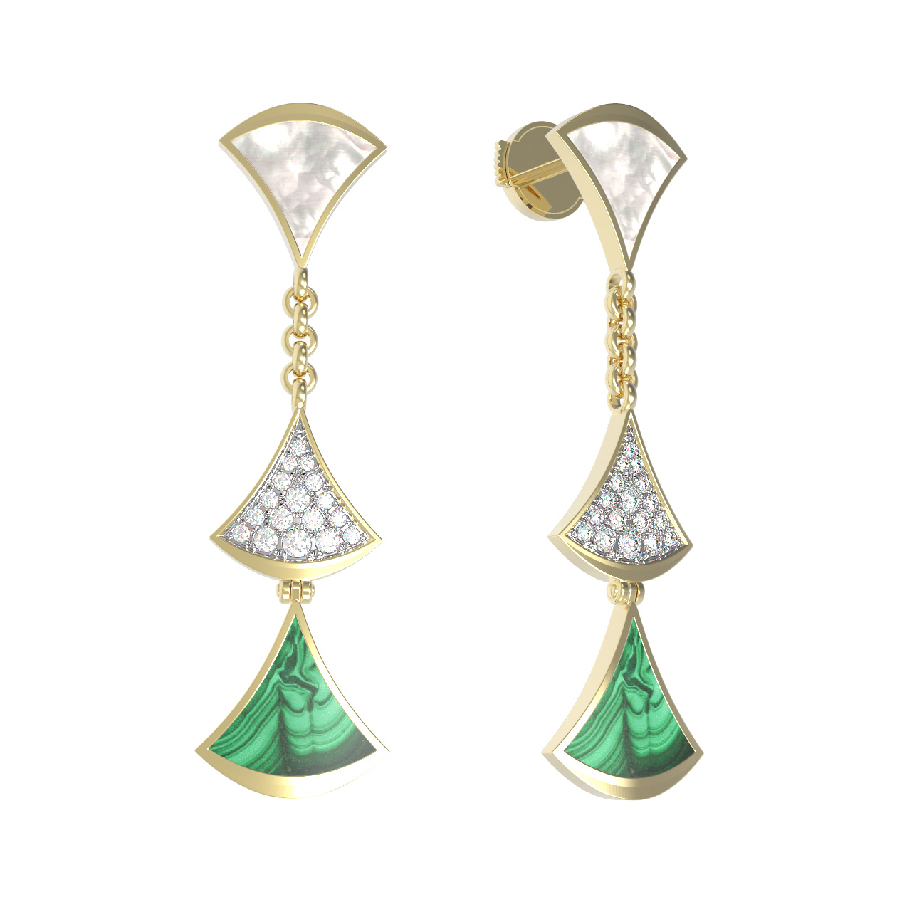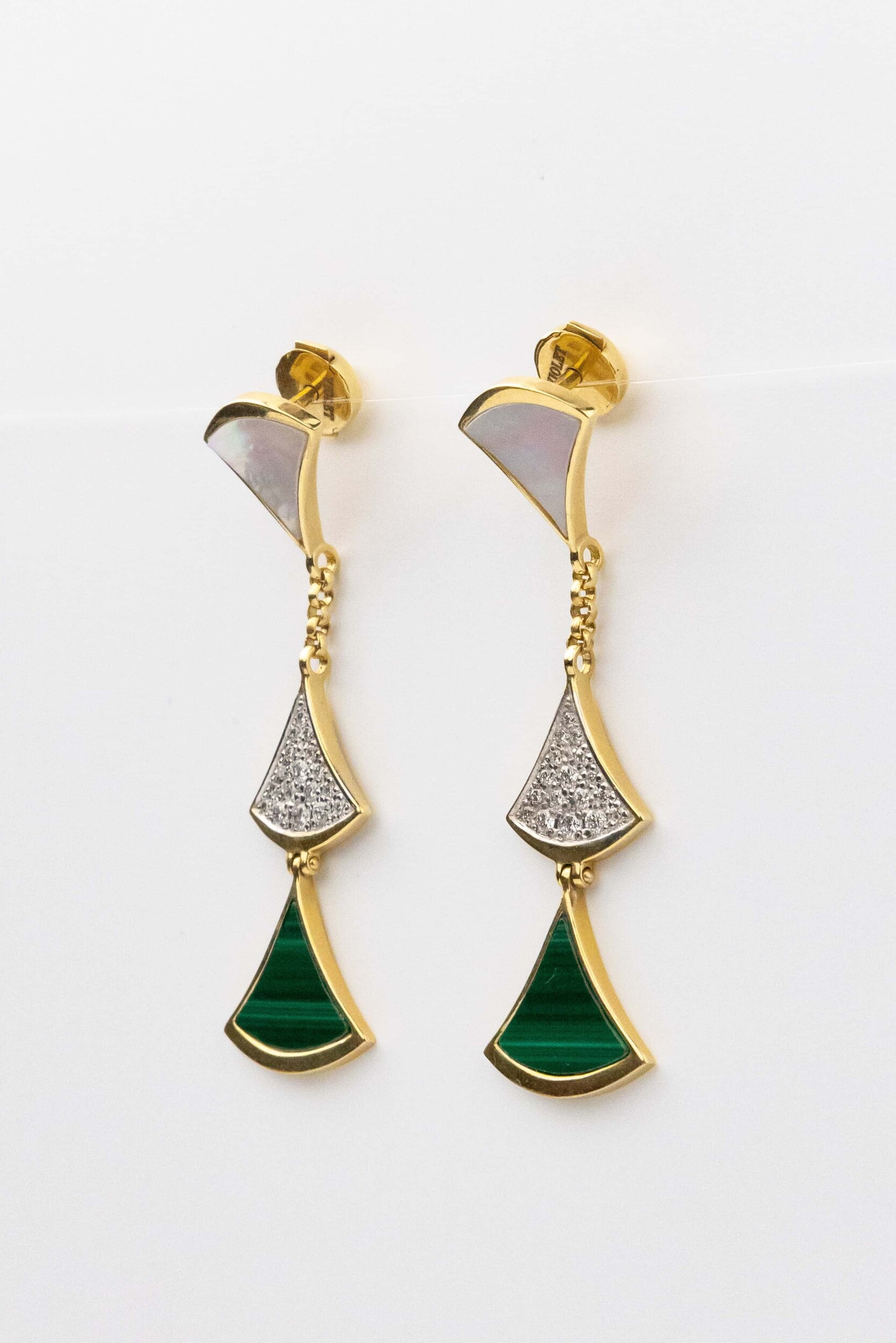 Эффектные серьги из коллекции De Luxe — Веер — это воплощение утонченной эстетики и высокого ювелирного искусства. Украшение выполнено из благородного лимонного золота 585 пробы, которое подчеркивает глубину и насыщенность использованных материалов. Дизайн изделия напоминает изящный веер, символизирующий грацию и движение. В центре композиции — гармоничное сочетание природных вставок: глубокого зеленого малахита, нежного перламутра и сияющих бриллиантов белого цвета.