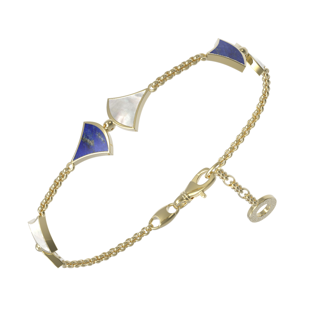 Изысканный браслет из лимонного золота 585 пробы из коллекции De Luxe — Веер станет стильным акцентом вашего образа. Дизайн изделия вдохновлен формой веера, что придает украшению особую эстетику и утонченность. Центральными элементами композиции выступают три контрастные вставки: благородный синий лазурит и нежный перламутр, которые гармонично сочетаются с теплым блеском лимонного металла.