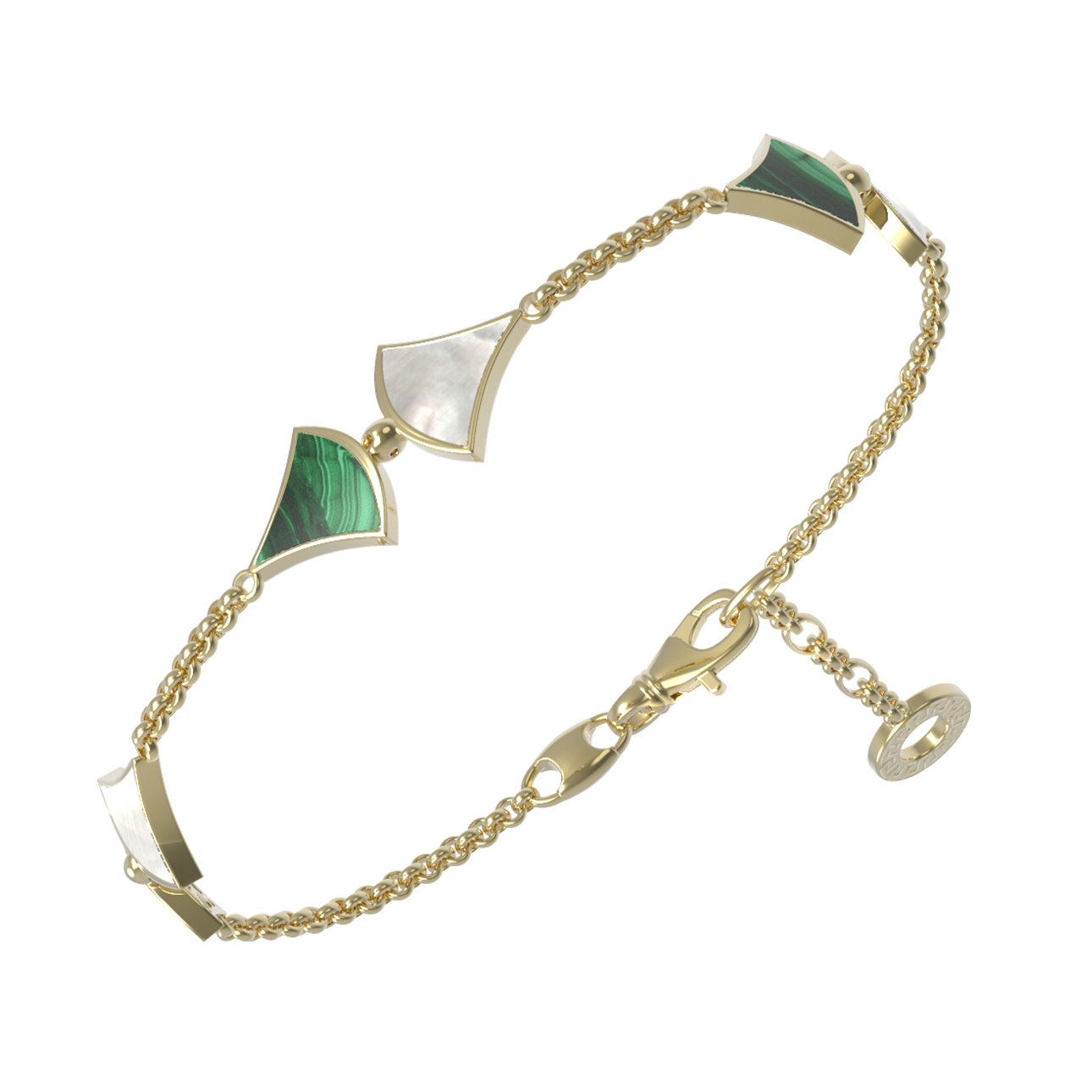 Центральным элементом композиции выступают три эффектные вставки из малахита и перламутра. Насыщенный зеленый цвет малахита с его неповторимым природным узором идеально сочетается с нежным, переливающимся перламутром. Контраст между теплым лимонным металлом и холодными, глубокими оттенками камней делает этот браслет по-настоящему выразительным аксессуаром.