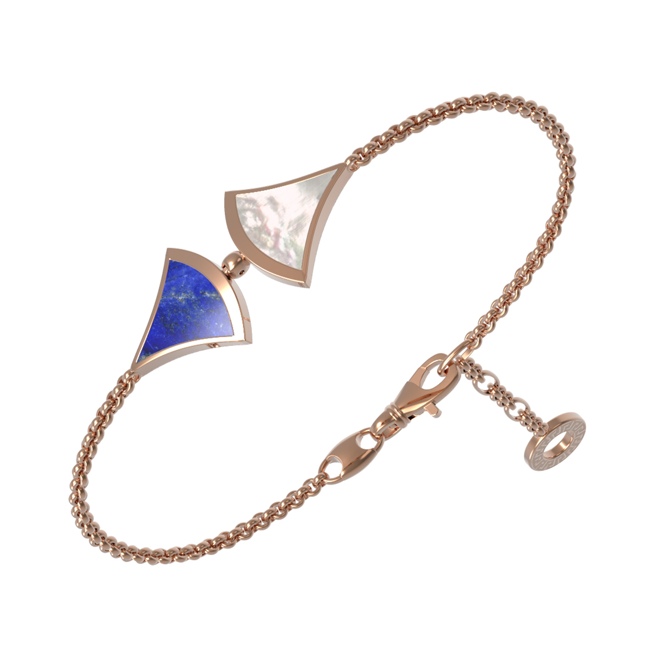 Элегантный браслет из коллекции De Luxe — Веер станет безупречным акцентом вашего образа, подчеркивая утонченный вкус и внимание к деталям. Это украшение выполнено из красного золота 585 пробы, чей теплый оттенок гармонично сочетается с уникальным дизайном, вдохновленным формой веера. В центре композиции расположены две изысканные вставки: насыщенный синий лазурит и нежный перламутр, контраст которых придает изделию особую выразительность и глубину.