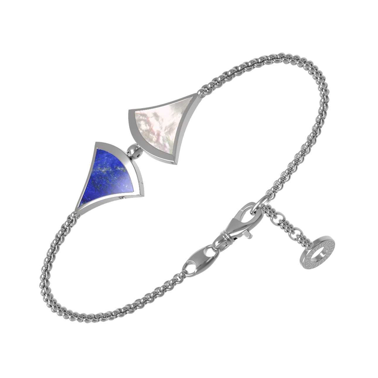 В украшении сочетаются две контрастные вставки: насыщенный синий лазурит и нежный перламутр. Такое сочетание делает аксессуар универсальным дополнением к повседневному или вечернему образу. Браслет обладает лаконичной формой, которая одинаково органично смотрится как на женском, так и на мужском запястье, подчеркивая индивидуальность владельца. Тонкая, но прочная цепочка обеспечивает комфортное прилегание, а надежный замок гарантирует безопасность при ежедневном ношении.