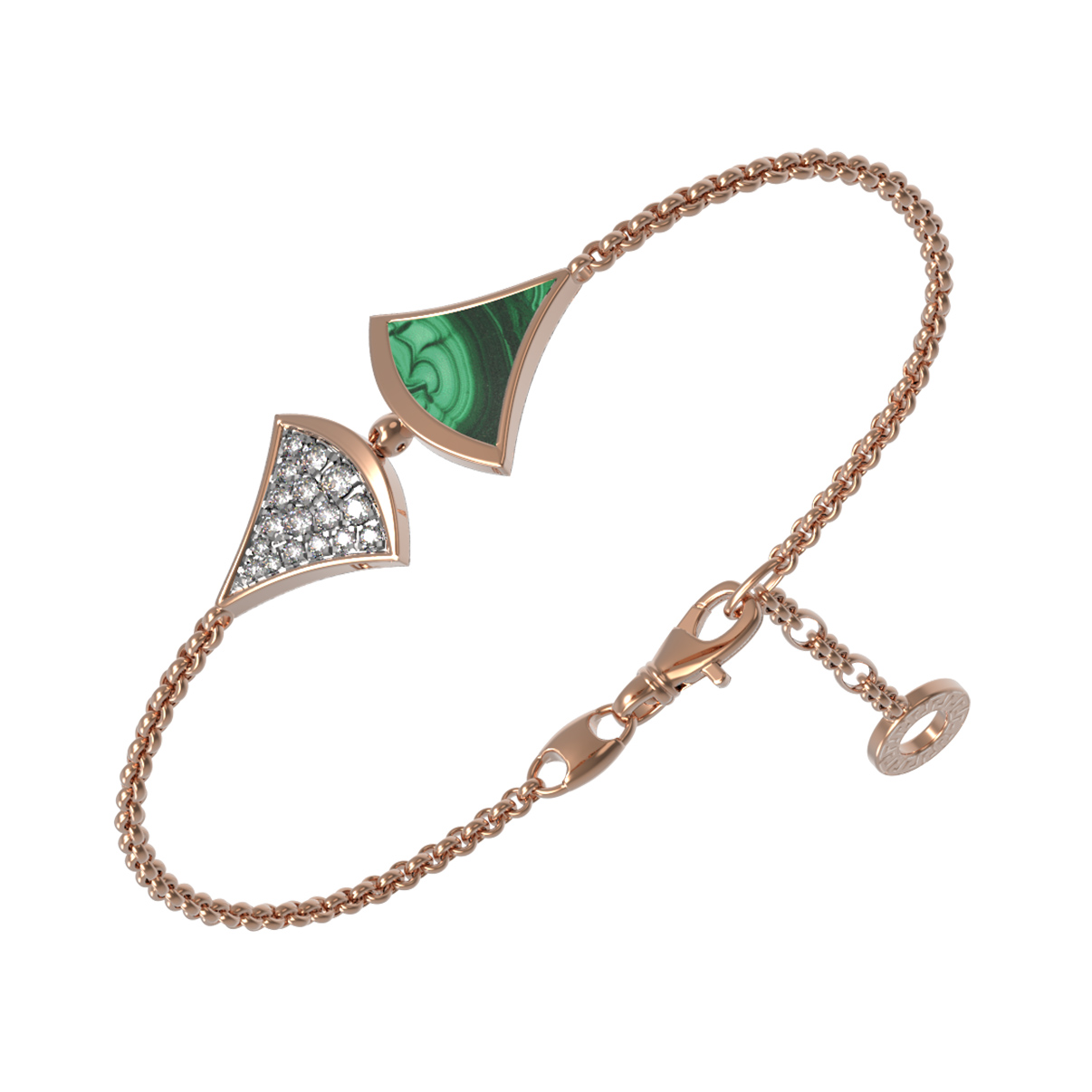 Центральную композицию браслета дополняют 18 вставок круглой формы, создающих гармоничный контраст. Глубокий зеленый оттенок натурального малахита эффектно сочетается с ослепительным блеском белых бриллиантов. Благородный красный цвет золота подчеркивает природную красоту камней и добавляет украшению теплого сияния. Конструкция браслета выполнена с вниманием к деталям, обеспечивая комфорт при ношении и надежную фиксацию на запястье.