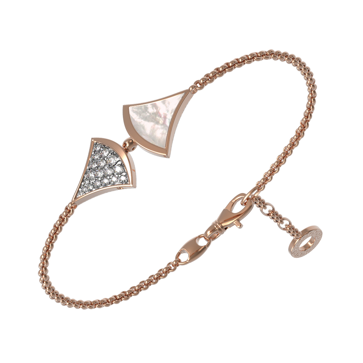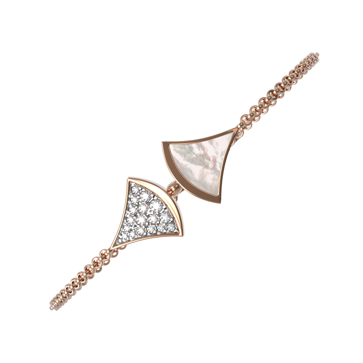 Элегантный браслет из красного золота 585 пробы станет утонченным дополнением вашего образа, подчеркивая безупречный вкус и статус. Это ювелирное изделие, представленное в коллекции De Luxe — Веер, выполнено в оригинальном дизайне Веер, сочетающем классическую роскошь драгоценных камней и природное очарование перламутра. Центральный элемент украшения искусно обыгрывает игру света: одна часть декора инкрустирована 17 бриллиантами круглой формы, создающими ослепительный блеск, а вторая дополнена нежной вставкой из светлого перламутра.