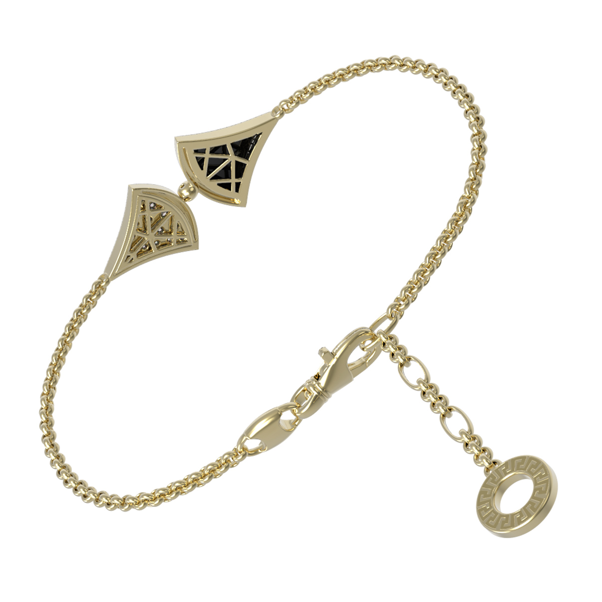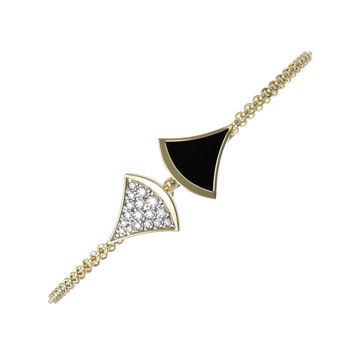 Этот утонченный браслет из лимонного золота 585 пробы — гармоничное сочетание классической роскоши и современного дизайна. Центральным элементом композиции является выразительный дизайн в форме веера, который придает изделию динамику и особый эстетический шарм. В декоре украшения виртуозно обыграно контрастное сочетание цветов: глубокого черного оникса и сверкающих белых бриллиантов. Всего в браслете использовано 18 вставок классической круглой формы, благодаря чему аксессуар выглядит эффектно и притягательно.