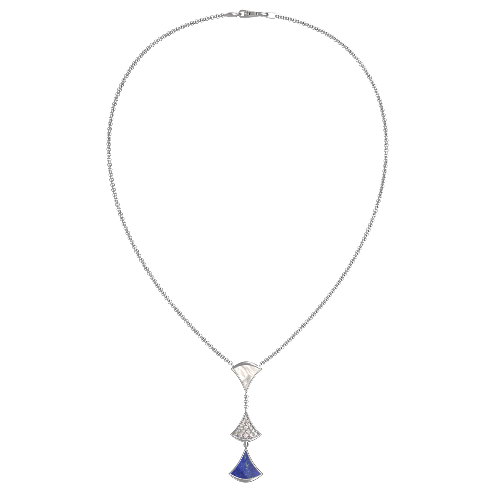 Особую выразительность колье придают 36 вставок круглой формы, которые создают неповторимую игру света и цвета. Россыпь сверкающих бриллиантов соседствует с глубоким, насыщенным синим лазуритом и нежным перламутром, создавая роскошный контраст. Белое золото идеально обрамляет эту композицию, добавляя изделию благородный холодный блеск.