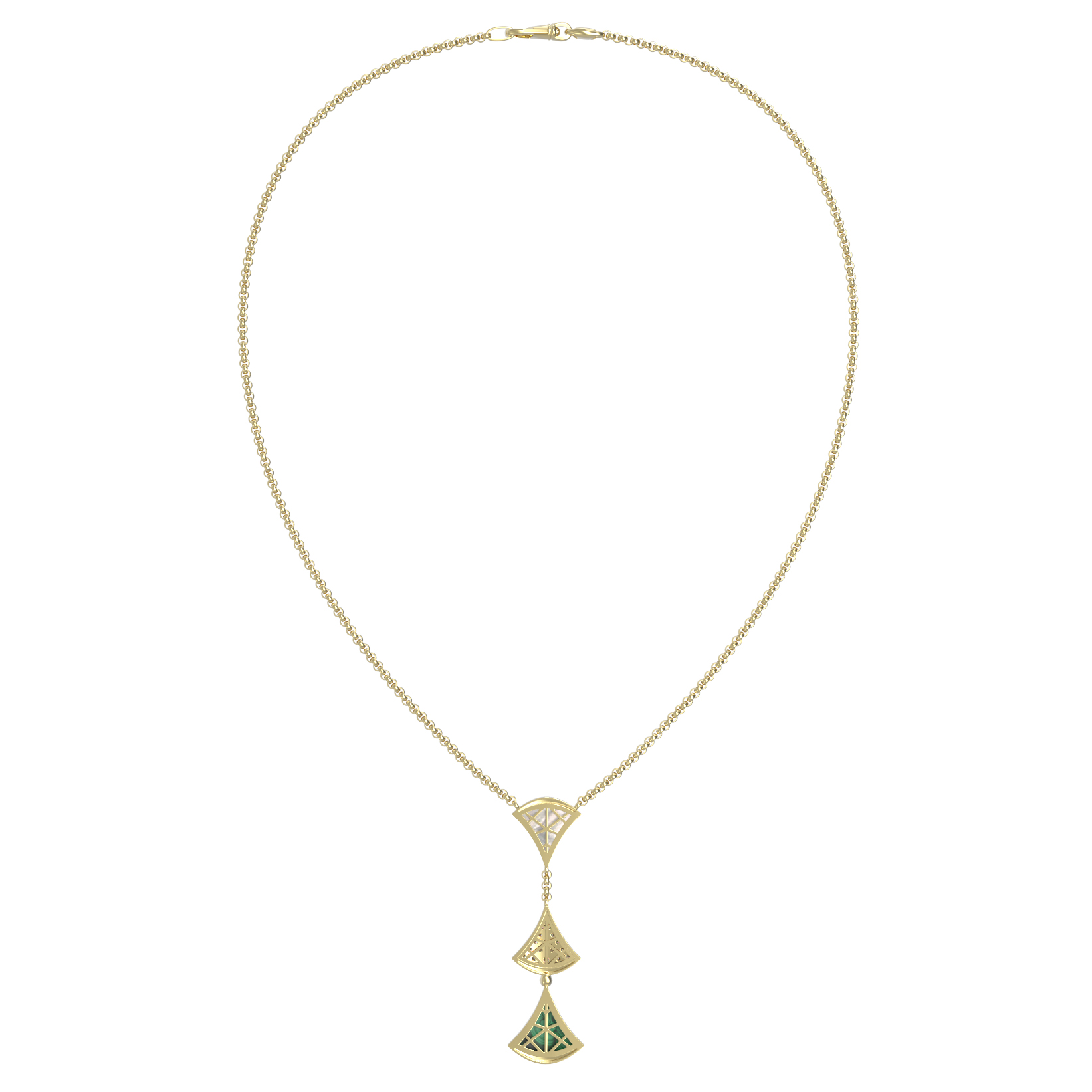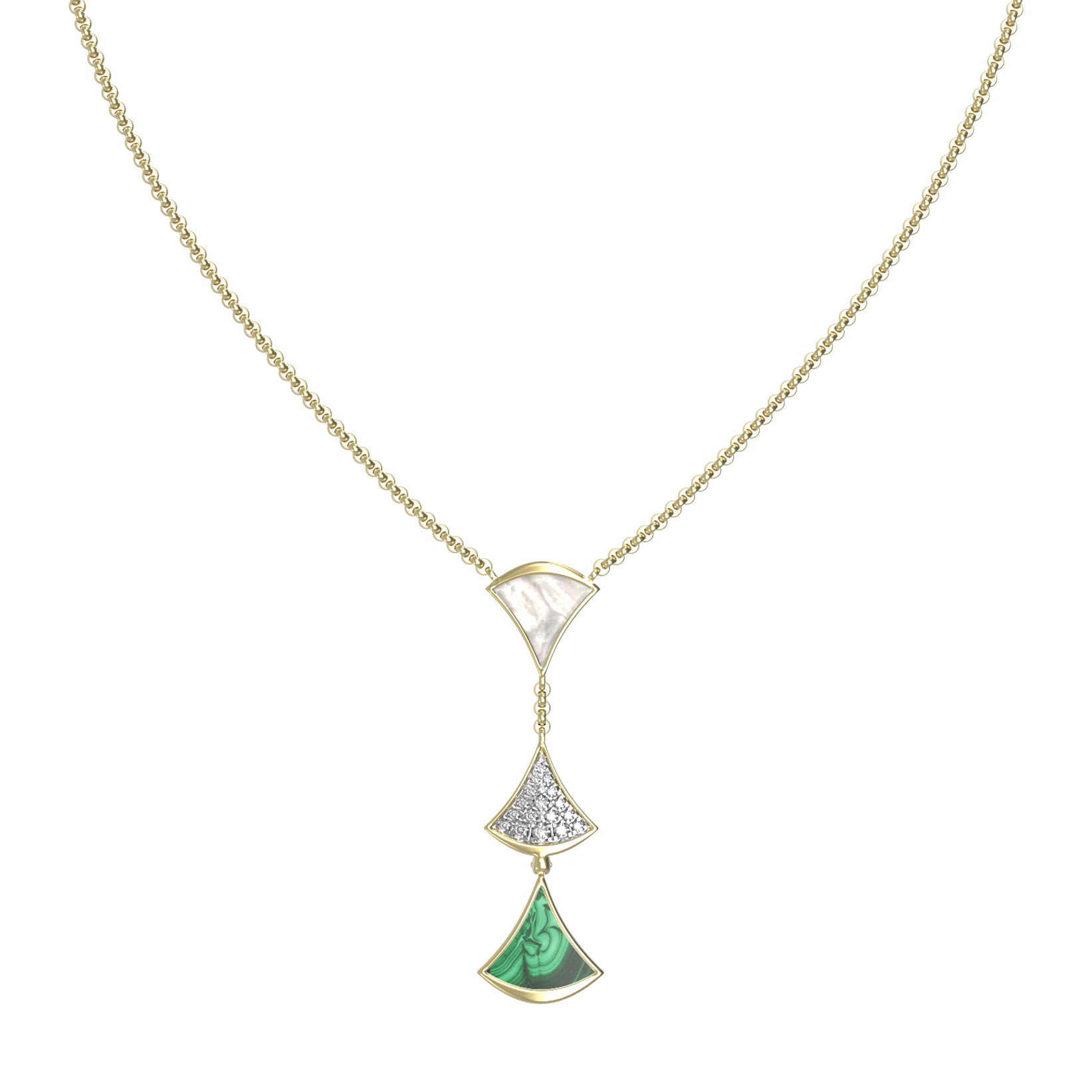 Особую выразительность колье придают вставки: глубокий зеленый малахит, нежный перламутр и россыпь из 36 круглых бриллиантов. Контраст благородного лимонного золота с белыми бриллиантами, переливающимся перламутром и природным рисунком малахита делает это изделие центральным элементом любого образа. Тщательно продуманная композиция в форме веера выглядит статусно и современно.