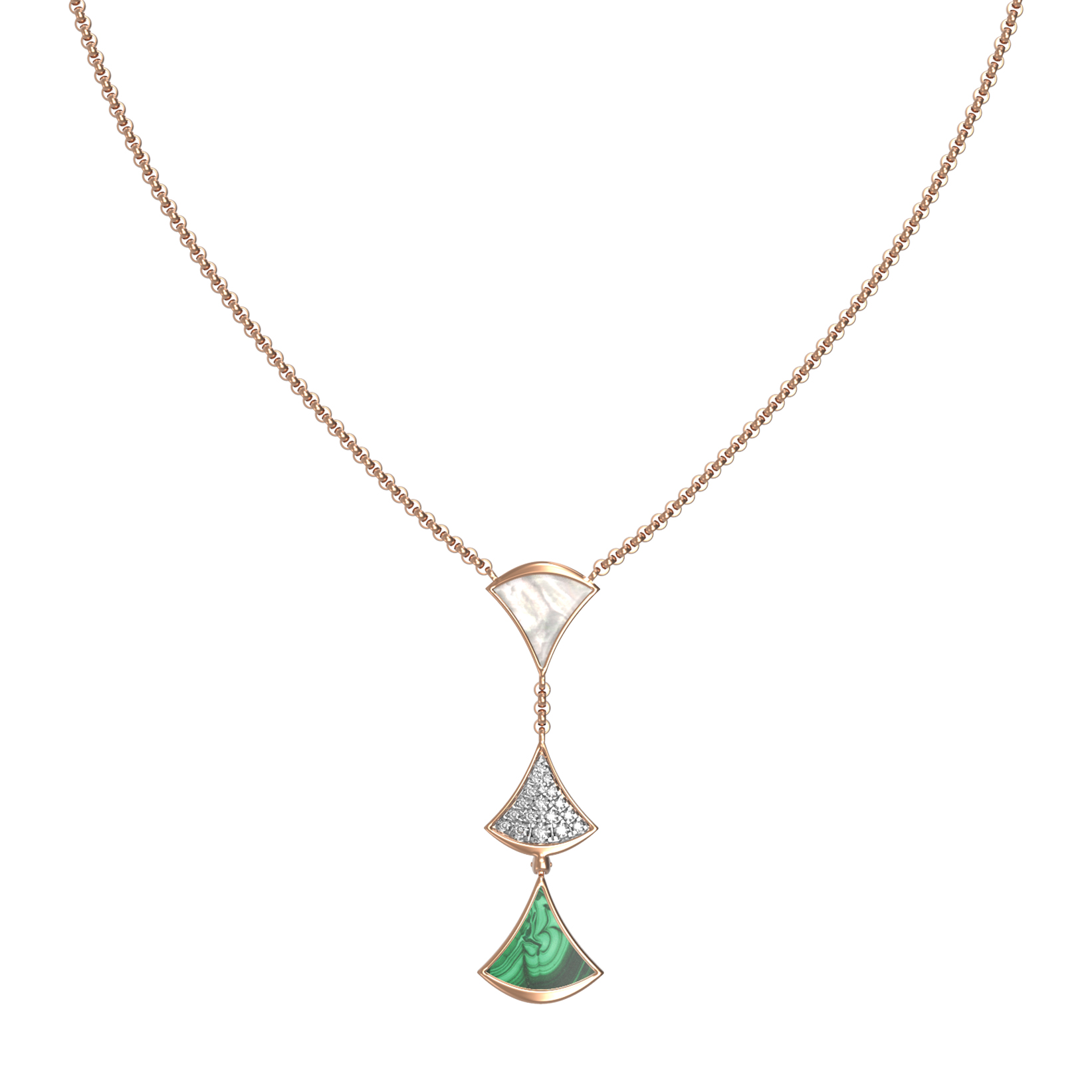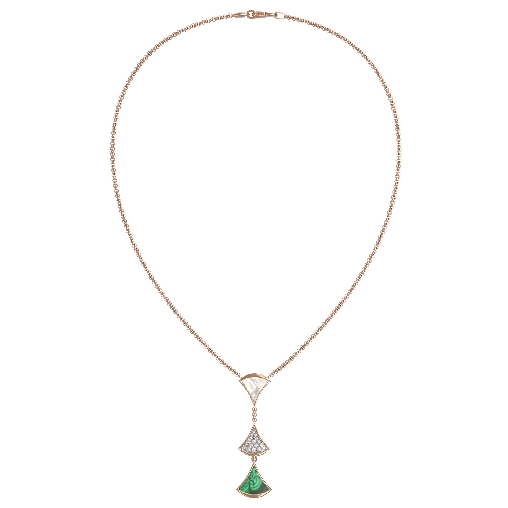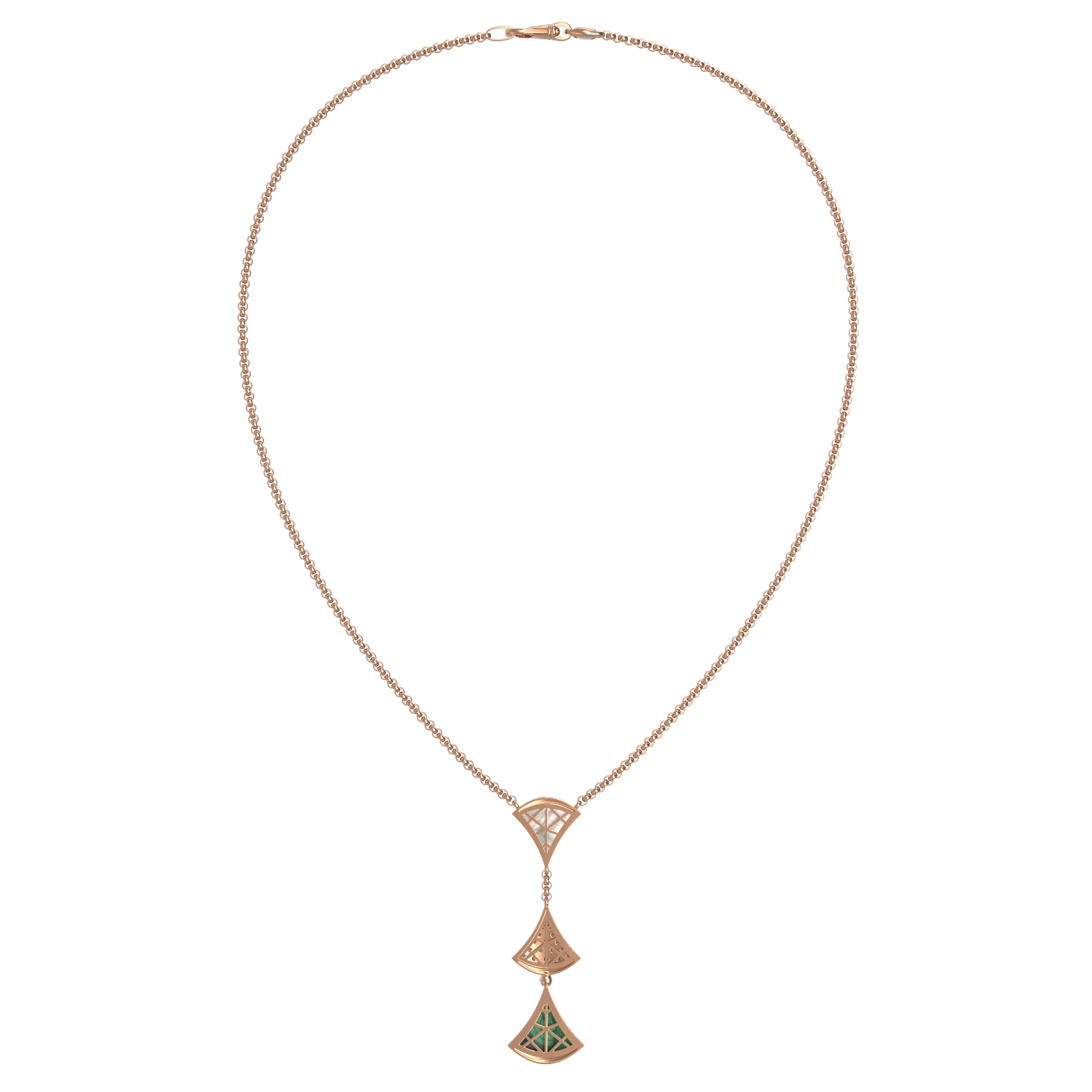 Центральная часть колье инкрустирована 36 бриллиантами круглой формы, которые создают завораживающее сияние. Их блеск эффектно дополняют вставки из натурального перламутра с нежным переливом и насыщенного зеленого малахита с уникальным природным рисунком. Контраст белого перламутра, зеленого малахита и сверкающих бриллиантов на фоне теплого красного золота делает это изделие настоящим произведением искусства.