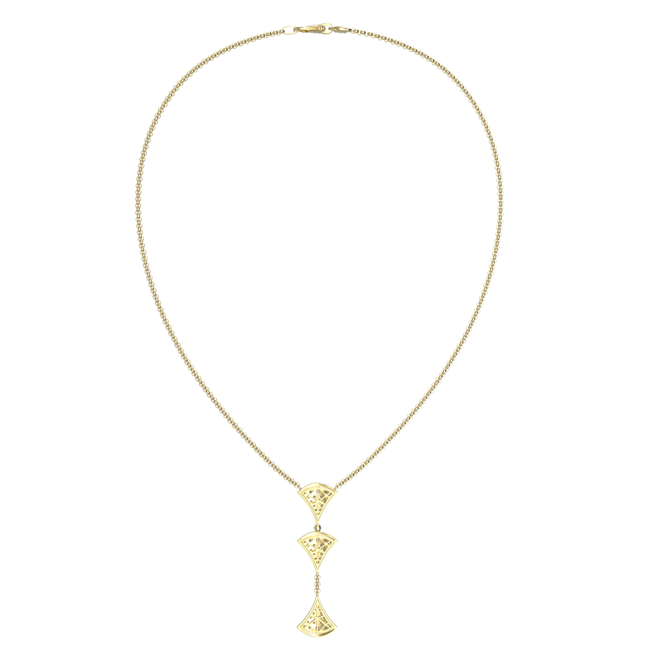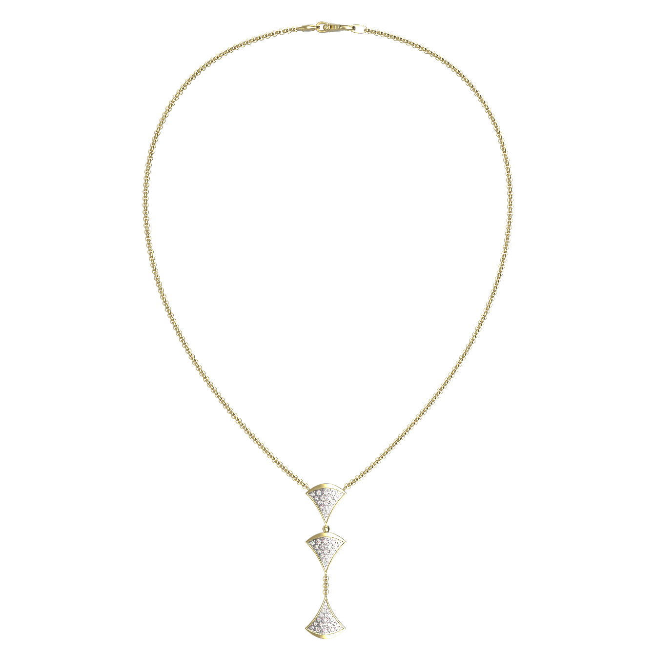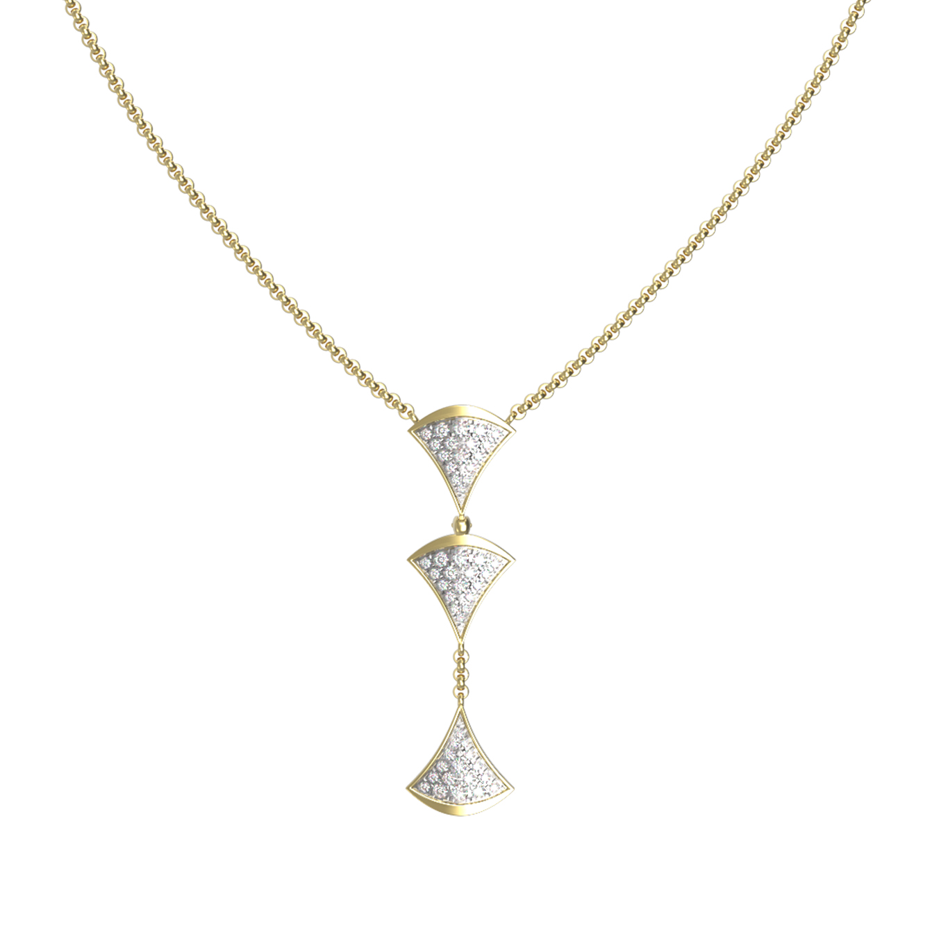 Изысканное колье из лимонного золота 585 пробы станет центральным акцентом вашего образа, подчеркивая статус и безупречный вкус. Дизайн изделия, вдохновленный грациозной формой веера, воплощает в себе гармонию строгих линий и роскошного блеска драгоценных камней. Центральным элементом украшения выступают три декоративных детали, инкрустированные 102 бриллиантами круглой огранки. Белоснежный цвет вставок эффектно контрастирует с теплым оттенком благородного металла, создавая притягательную игру света при каждом движении.
