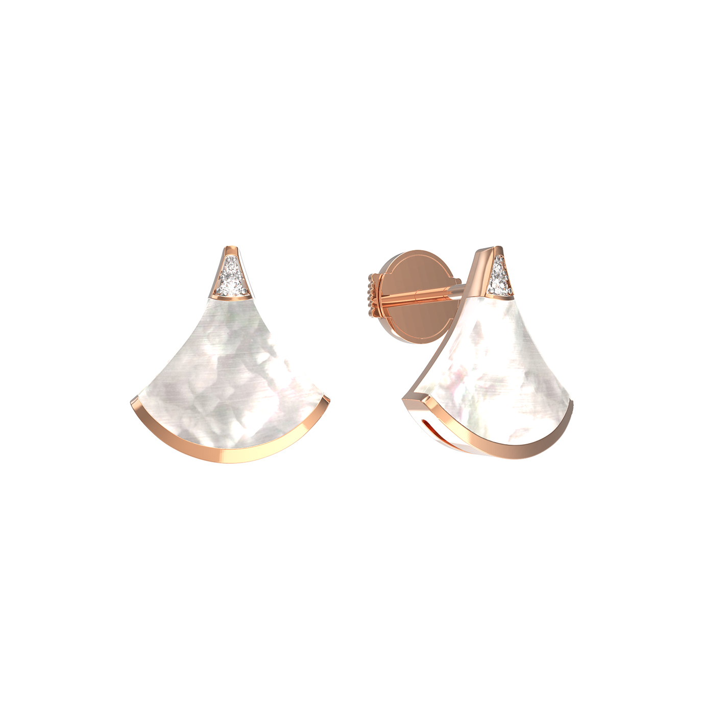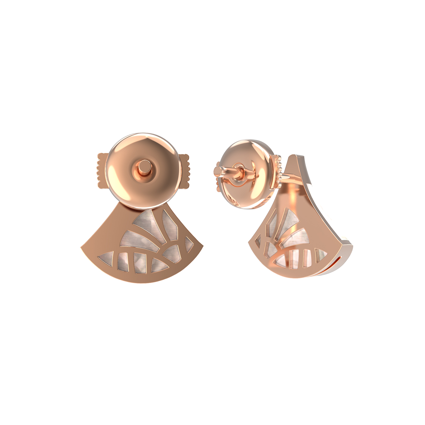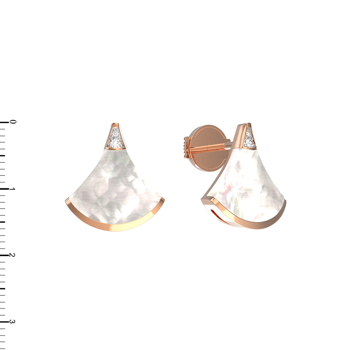 Центральным элементом композиции выступает перламутр с его мягким, переливающимся белым сиянием, который подчеркивает нежность и глубину оттенка красного золота. Вставки из бриллиантов круглой формы добавляют изделию необходимого блеска и аристократичного лоска. В общей сложности в серьгах использовано 4 вставки, которые грамотно расставляют акценты и притягивают внимание к лицу.