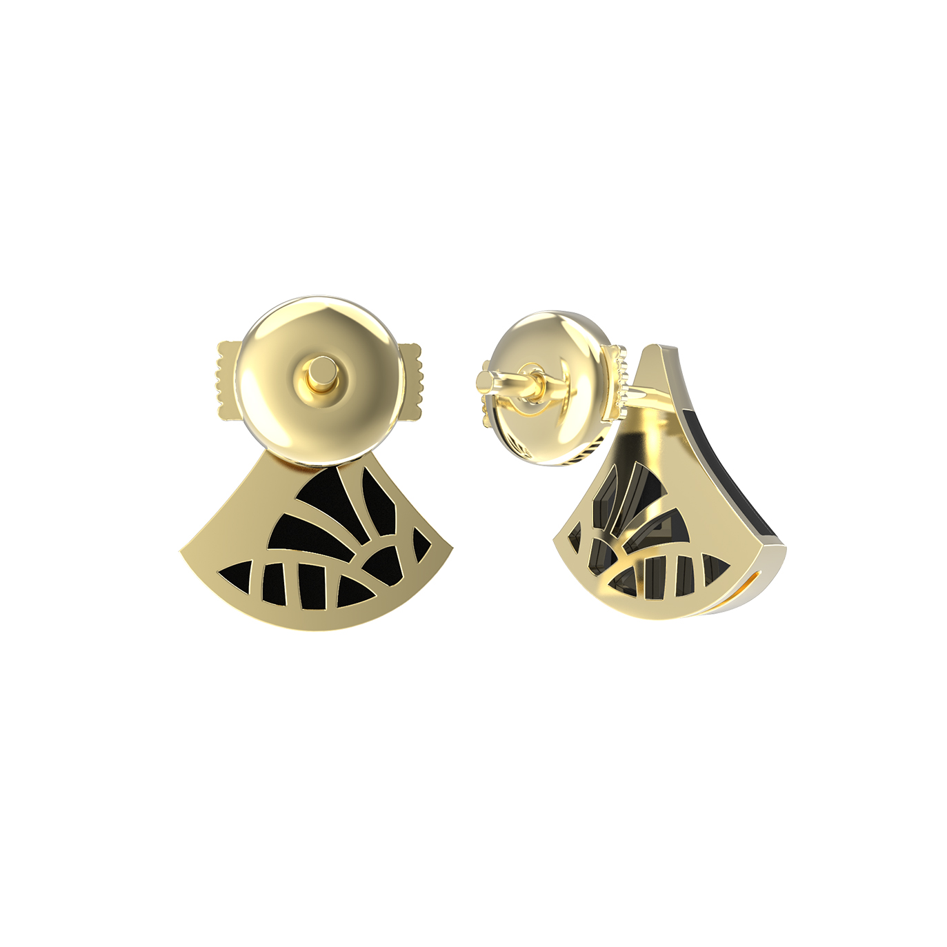 Серьги из лимонного золота 585 пробы из коллекции De Luxe — Веер представляют собой гармоничное сочетание классической элегантности и смелого геометрического дизайна. Форма веер придает изделию динамичный и современный облик, делая его выразительным акцентом вашего образа. Лимонный оттенок золота благородно обрамляет вставки, создавая стильный контраст с глубоким черным цветом оникса.