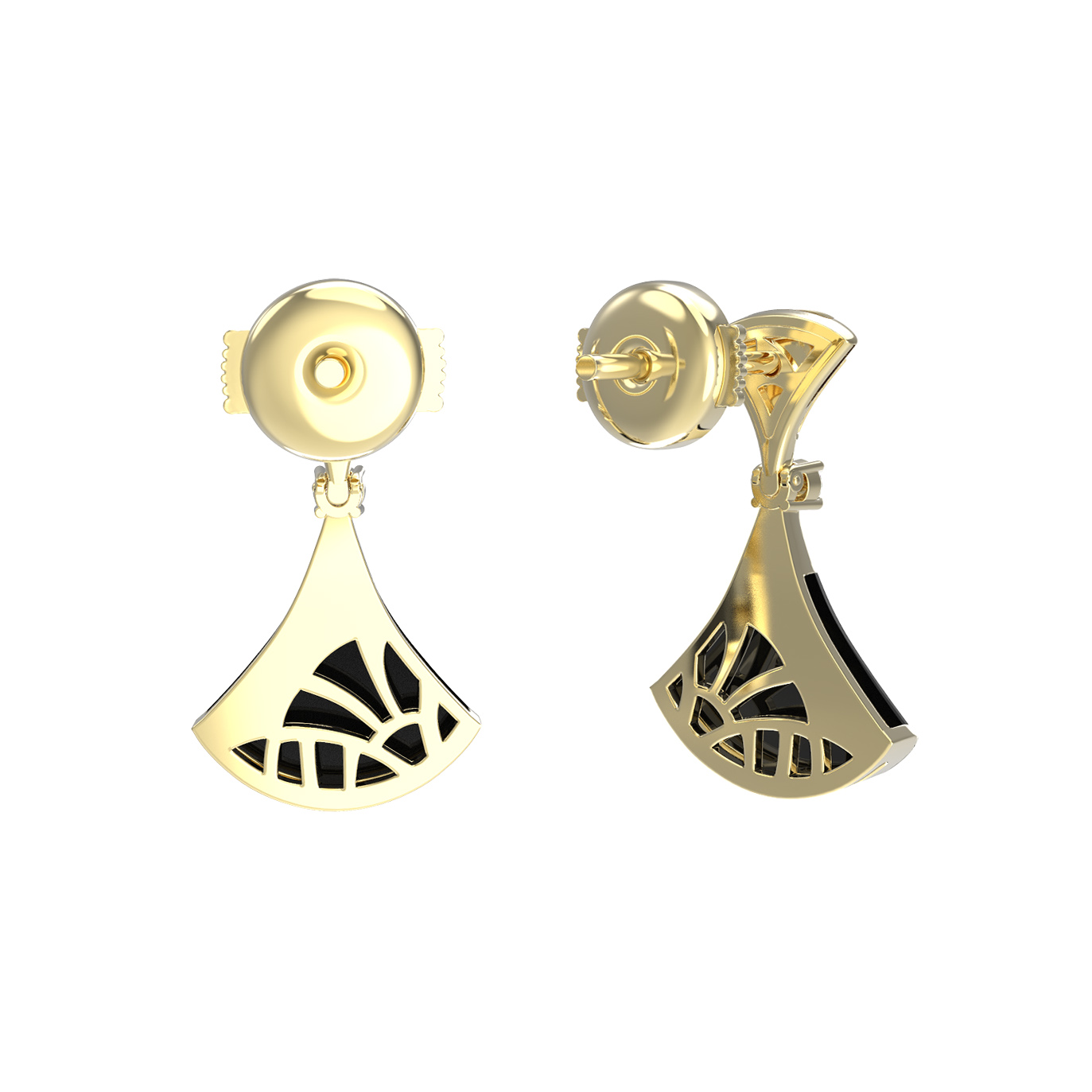 Центральным элементом композиции является искусное сочетание вставок: глубокий черный оникс гармонирует с сияющим белым бриллиантом. Всего в изделии использовано 4 вставки круглой формы, которые создают сбалансированную и притягательную игру света. Гладкие линии золота и насыщенный цвет оникса формируют лаконичный, но эффектный вид, позволяющий этим серьгам стать центром вашего ювелирного гардероба.