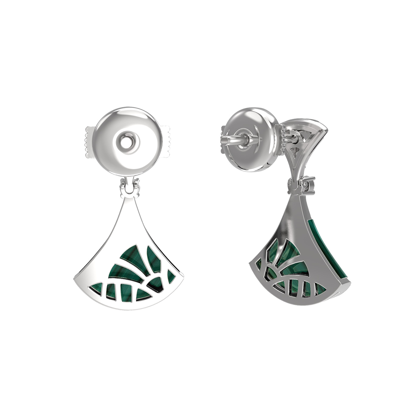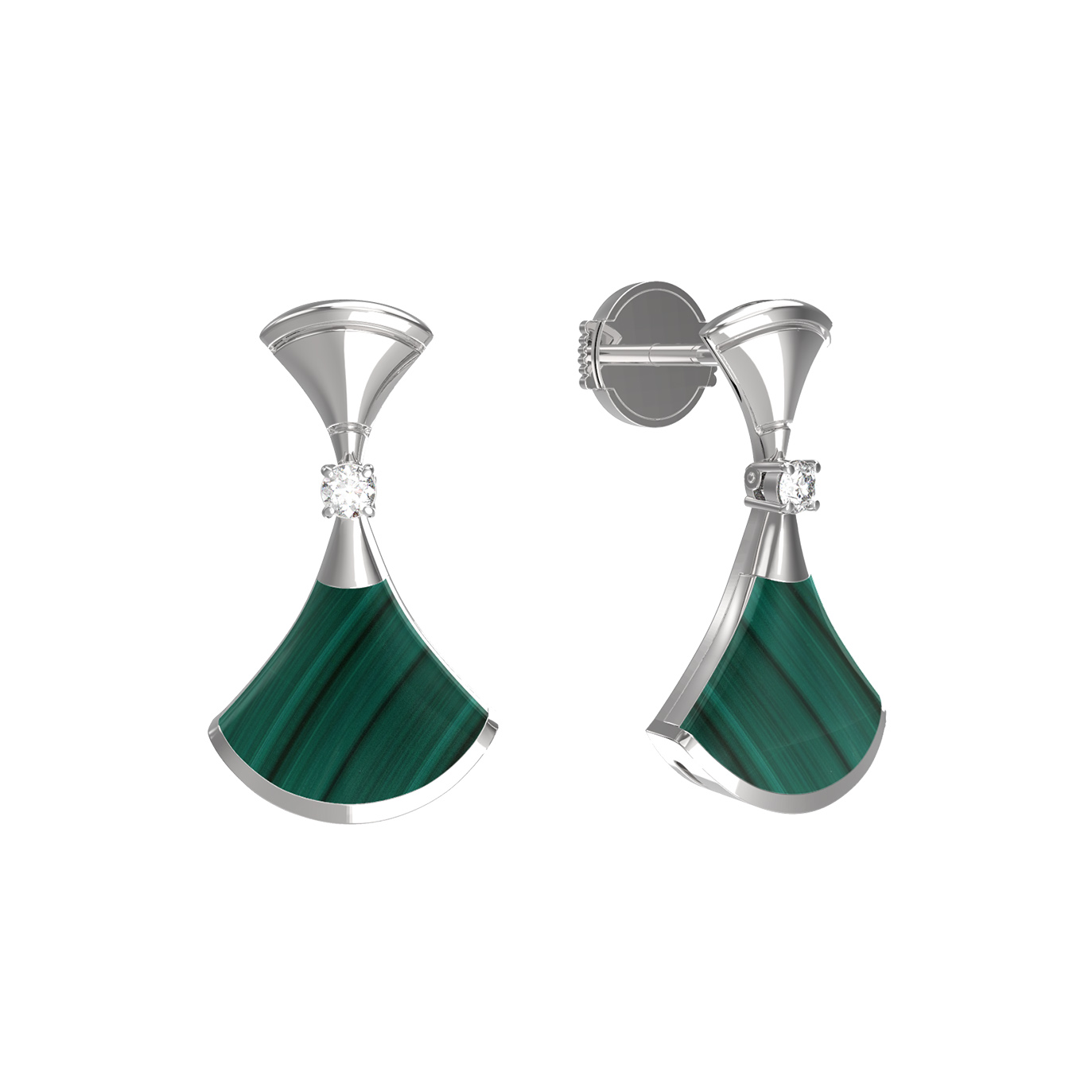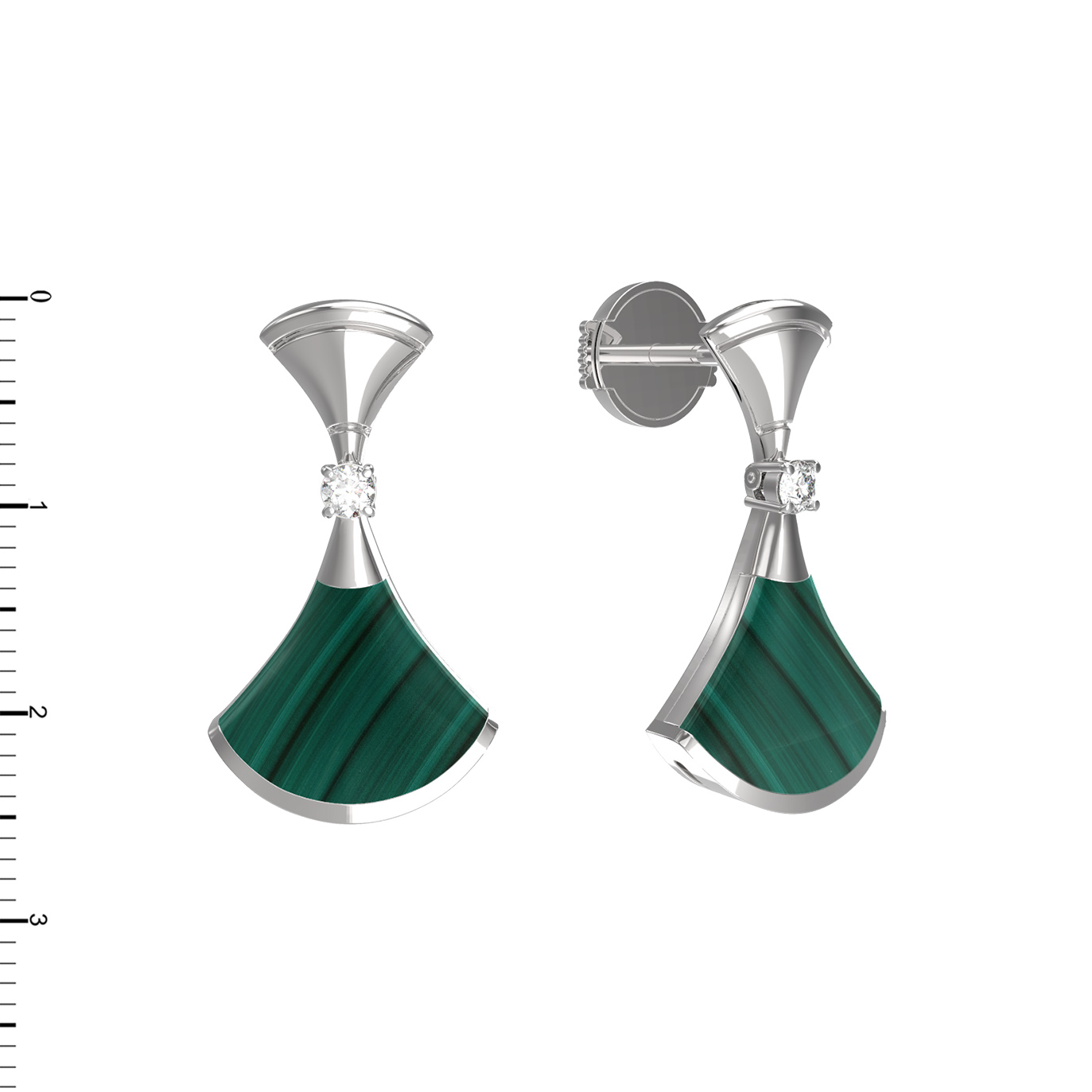 Изысканные серьги из коллекции De Luxe — Веер станут ярким акцентом вашего образа, подчеркивая безупречный вкус и статус. Это ювелирное изделие выполнено из благородного белого золота 585 пробы, чей холодный блеск идеально сочетается с глубоким зеленым оттенком малахита. Дизайн украшения в форме веера придает ему особую грацию и лаконичную эстетику, делая серьги подходящим дополнением как для вечернего выхода, так и для важной деловой встречи.