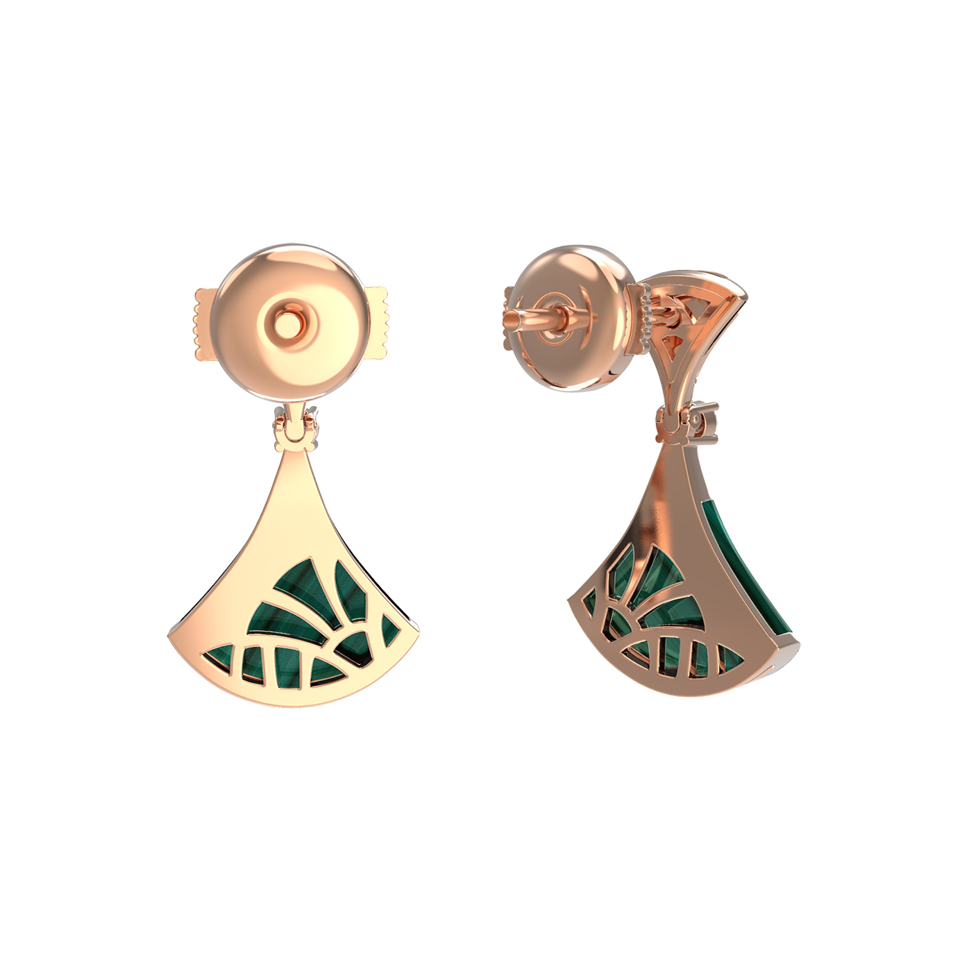 Центральным элементом композиции стали вставки из натурального малахита насыщенного зелёного цвета, которые завораживают своим природным рисунком. В качестве изысканного акцента ювелиры использовали бриллианты белого цвета. Всего в изделии предусмотрено 4 вставки круглой формы, которые мягко переливаются при каждом движении, добавляя украшению блеска и роскоши.