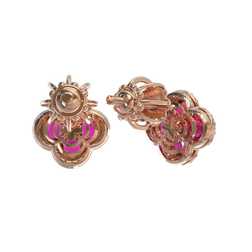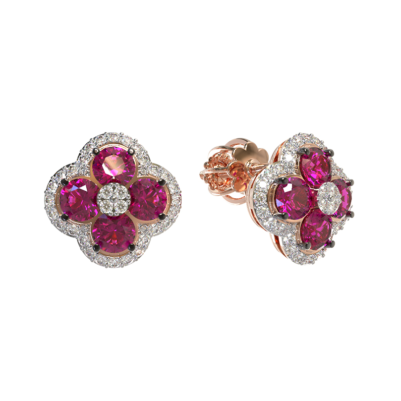 Центральным элементом композиции выступают глубокие красные рубины круглой формы, которые притягивают взгляд своим живым блеском. Их благородный цвет эффектно контрастирует с сиянием 72 вставок из белых бриллиантов, также имеющих классическую круглую форму. Детально проработанная ювелирная композиция в виде четырехлистника выглядит женственно и благородно, при этом благодаря лаконичности исполнения, серьги могут гармонично вписаться и в мужской стиль, становясь ярким акцентом.