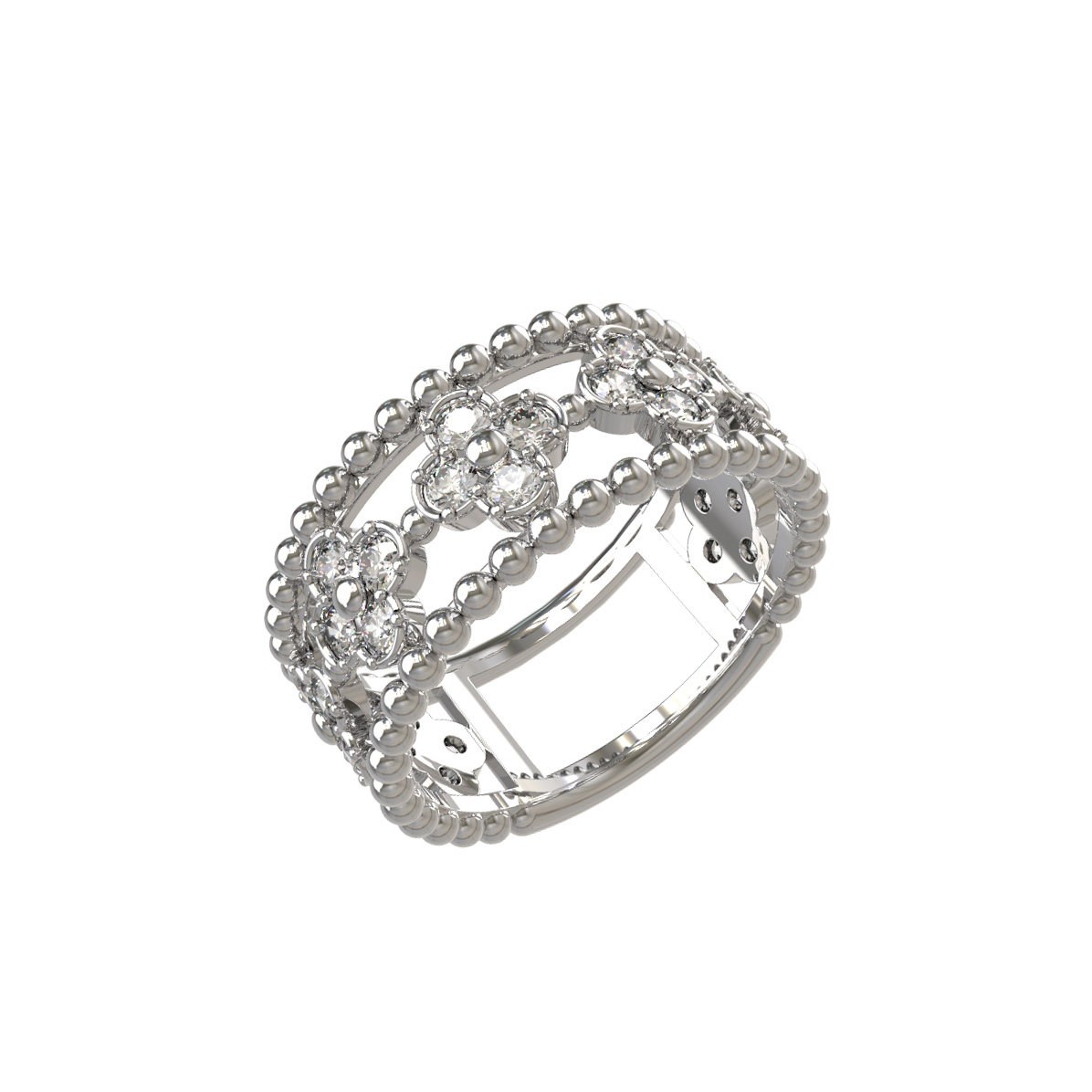 Изысканное кольцо из белого золота 585 пробы из коллекции De Luxe Бриллианты — Fiore станет воплощением вашего утонченного вкуса. Это украшение притягивает взгляд своей сложной архитектурой: два ажурных ободка, инкрустированные миниатюрными металлическими сферами, соединяются цветочными мотивами, создавая эффектный и воздушный дизайн. Холодное сияние металла идеально подчеркивает роскошь вставок — 28 белоснежных бриллиантов круглой огранки, которые переливаются при каждом движении руки.