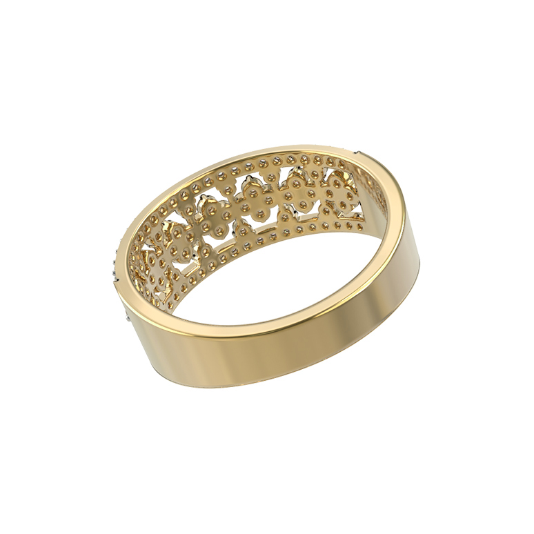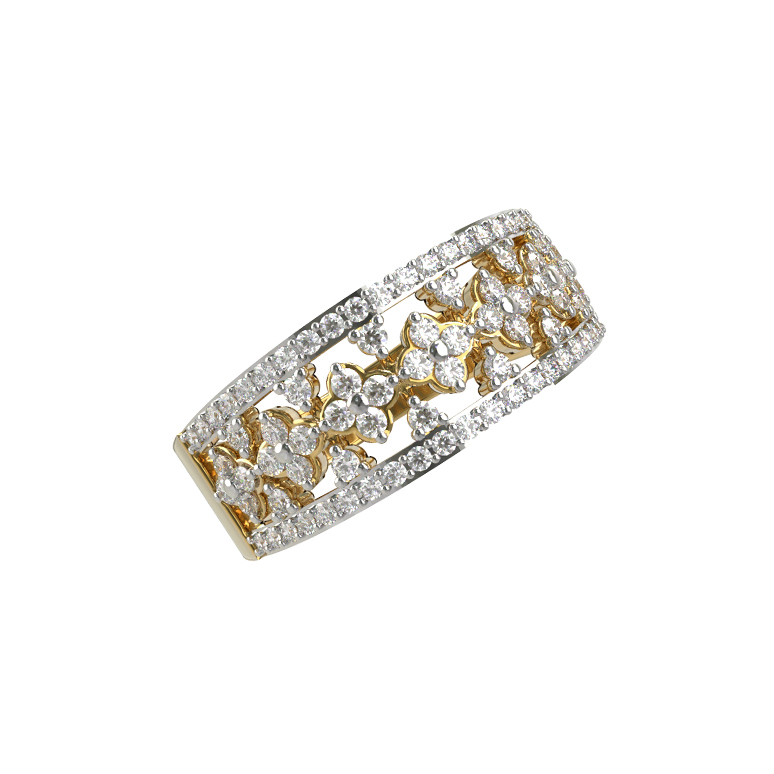 Центральным элементом композиции выступают 84 безупречных бриллианта круглой огранки. Камни обладают ослепительным белым сиянием, которое эффектно контрастирует с насыщенным цветом металла. Искусная работа мастеров позволяет бриллиантам максимально раскрыть свою игру света при каждом движении руки. Ажурный узор с цветочными мотивами придает изделию легкость и воздушность, превращая его в настоящий шедевр ювелирного искусства.