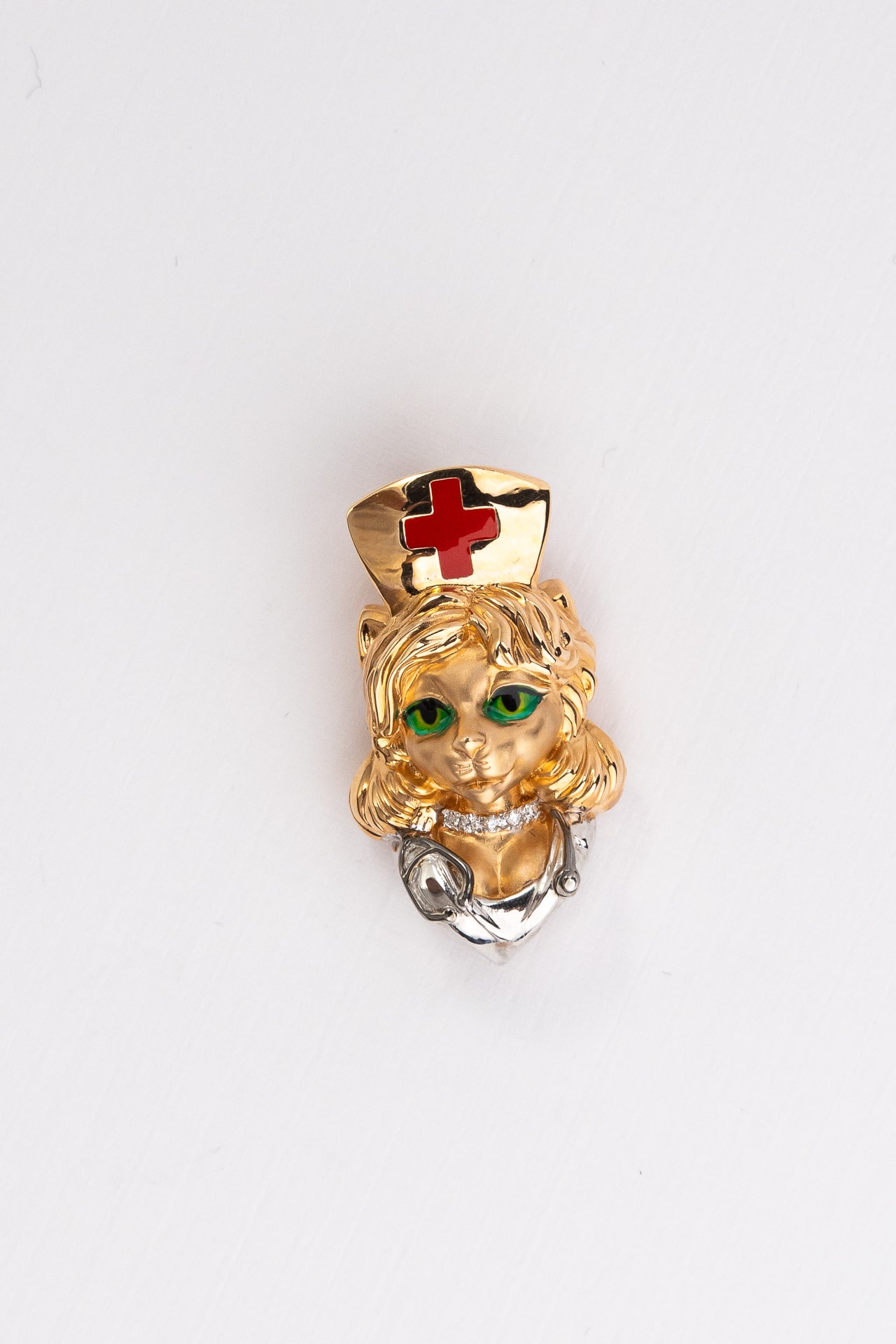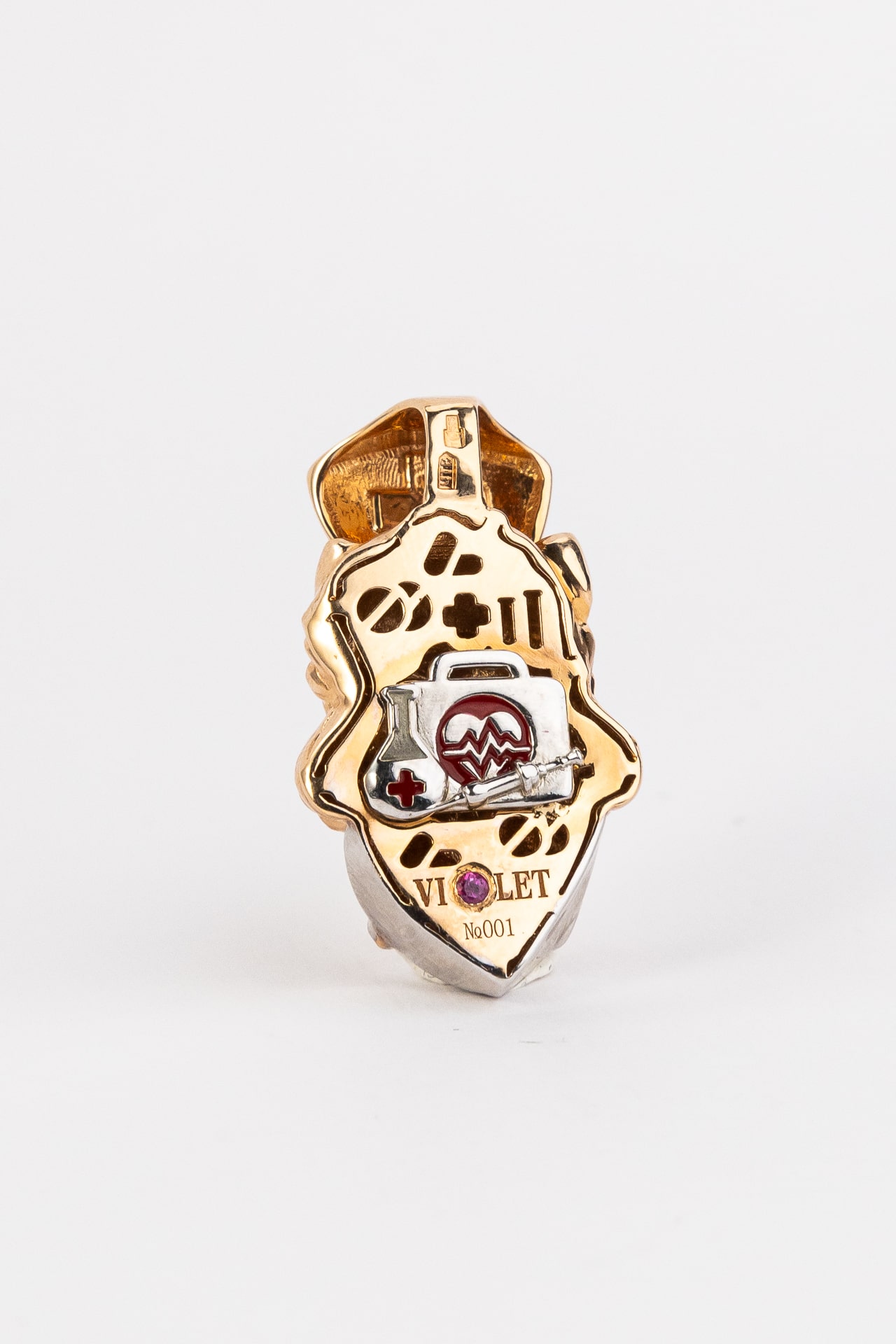 Особую художественную ценность аксессуару придает детальная проработка образа: мастерское использование эмали позволило создать яркие акценты, оживляющие дизайн. В качестве вставок использованы 6 драгоценных камней круглой формы — сверкающие бриллианты белого цвета и насыщенный рубин, который притягивает взгляд своим глубоким оттенком. Такое сочетание материалов делает украшение не только эстетически привлекательным, но и статусным аксессуаром.