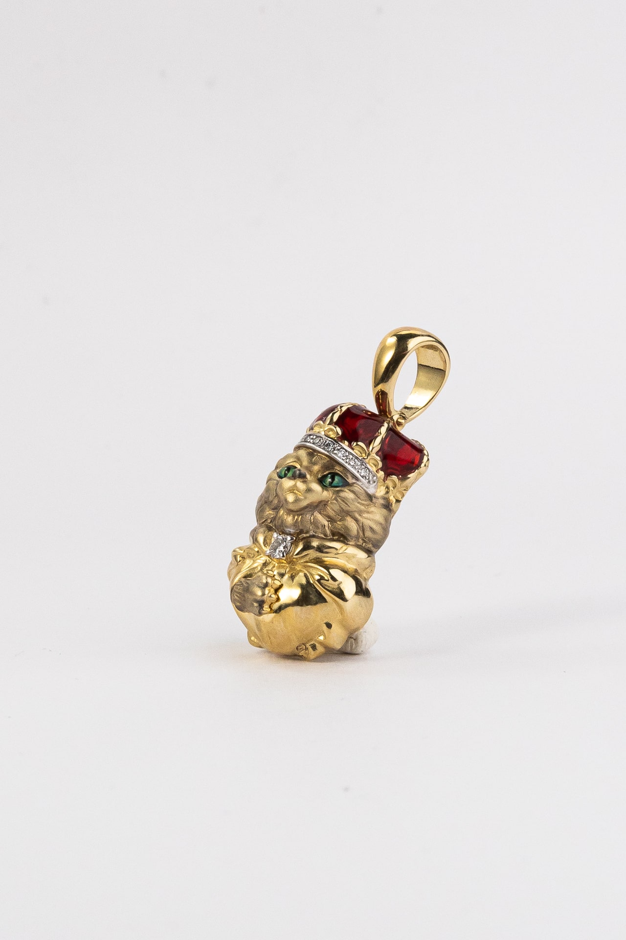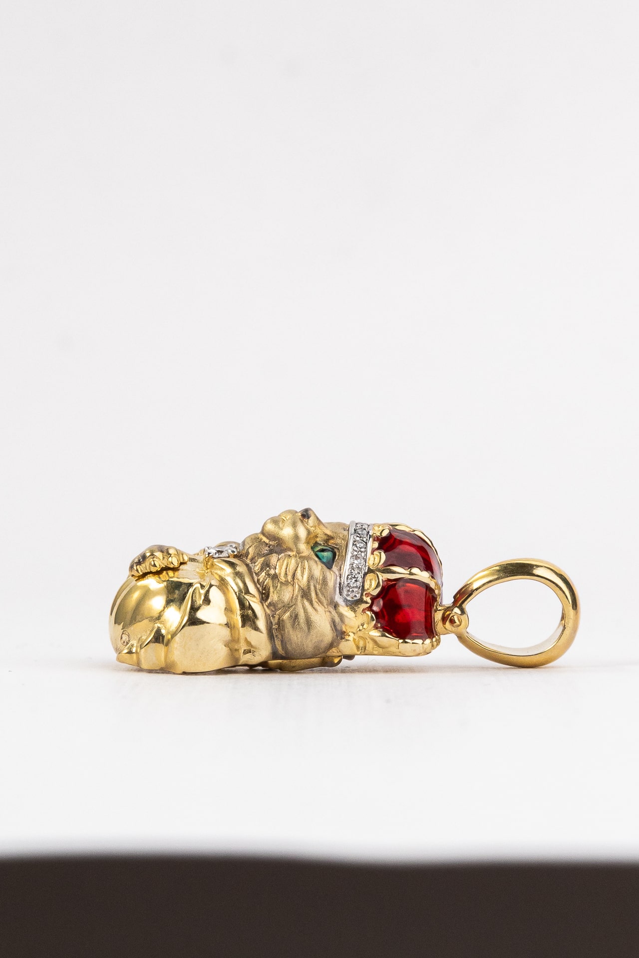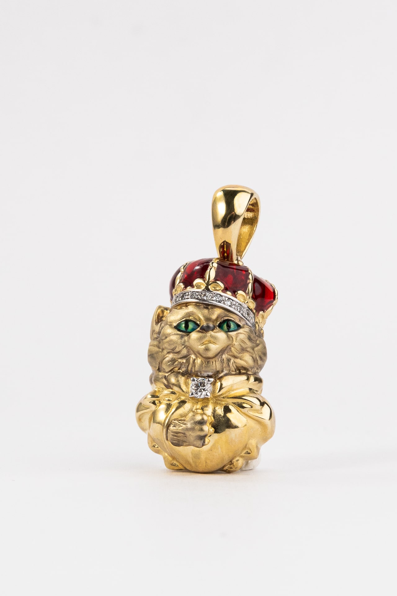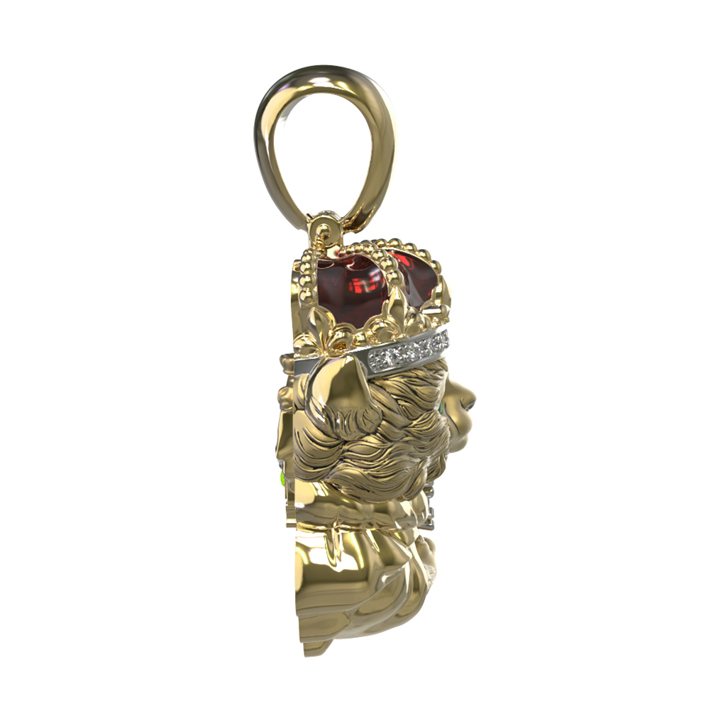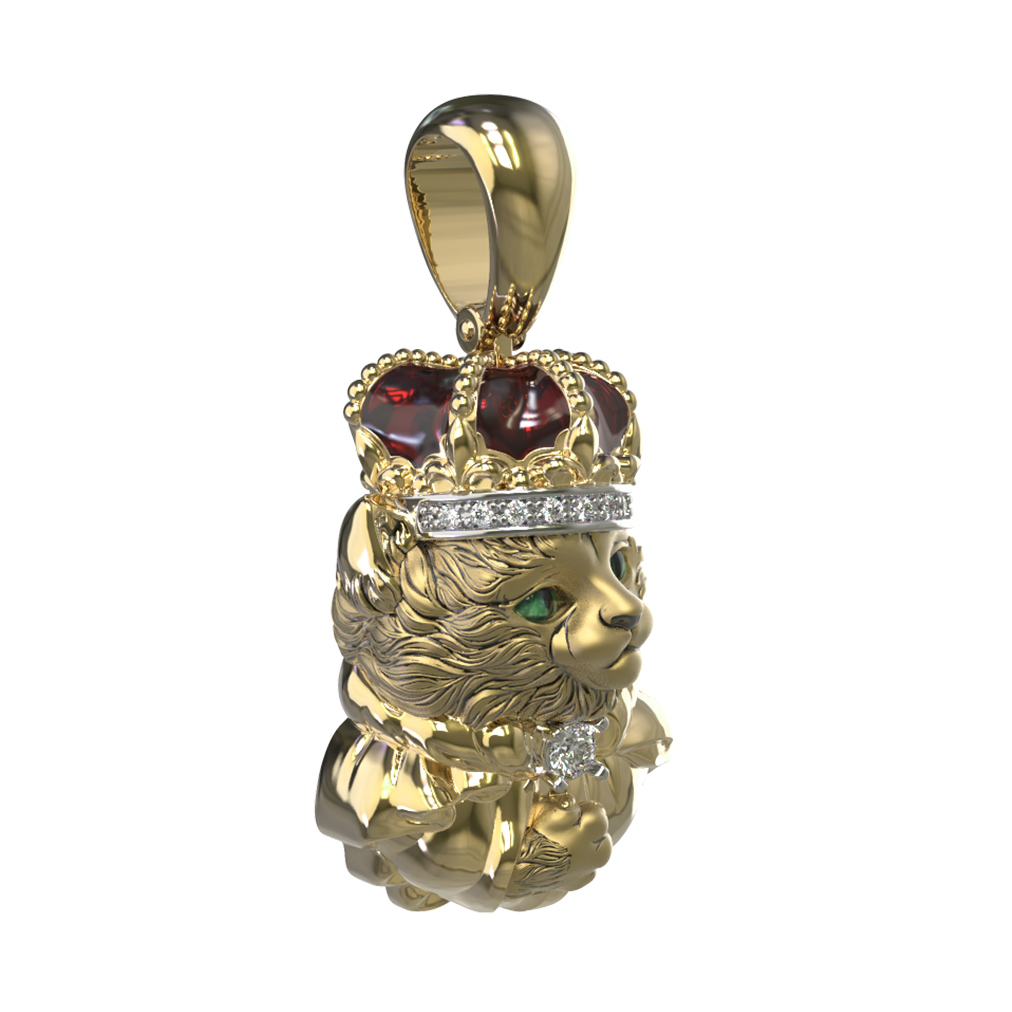 Композиция украшена 11 вставками, среди которых сияющие бриллианты белого цвета, глубокий красный рубин и изящные элементы разноцветной эмали. Сочетание драгоценных камней круглой формы создает великолепную игру света, добавляя изделию яркости и выразительности. Использование эмали придает дизайну глубину и законченность, делая образ персонажа живым и узнаваемым. Такая подвеска станет прекрасным подарком как для женщин, так и для мужчин, которые ценят необычные украшения с характером.