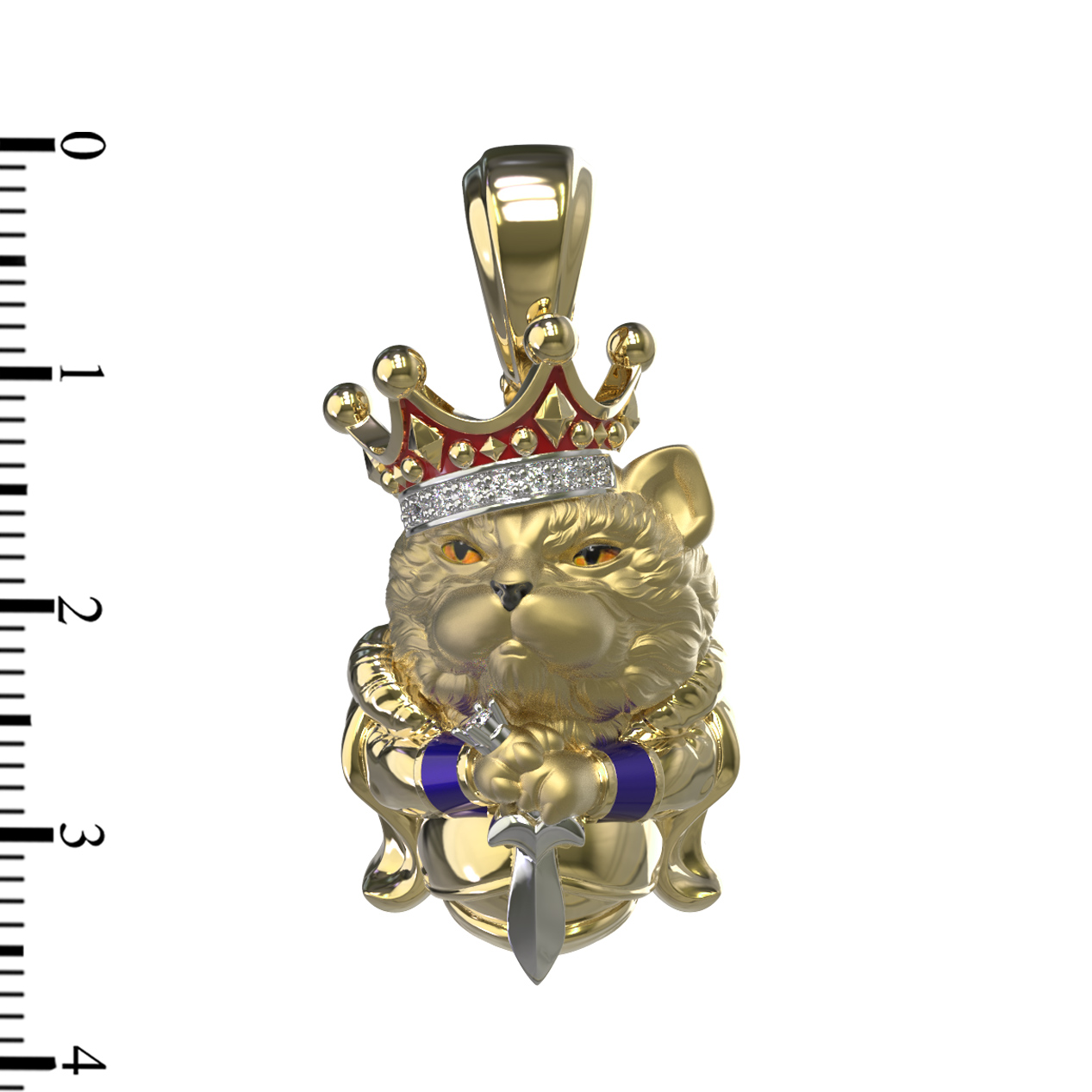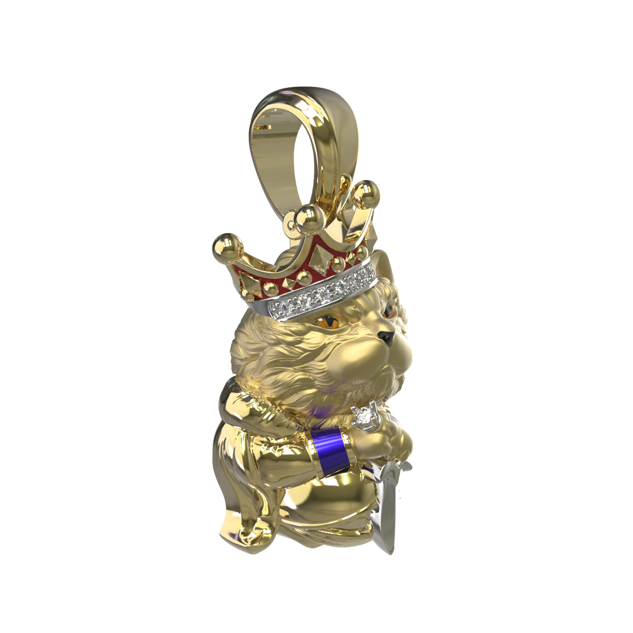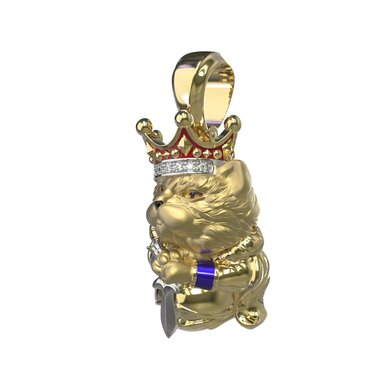 Композицию дополняют яркие вставки: глубокий красный цвет рубина эффектно сочетается с сиянием белых бриллиантов, украшающих корону персонажа. Ювелирная эмаль разноцветных оттенков придает изделию выразительность и глубину. Всего в модели использовано 10 вставок круглой формы, каждая из которых тщательно отобрана для создания гармоничного образа.