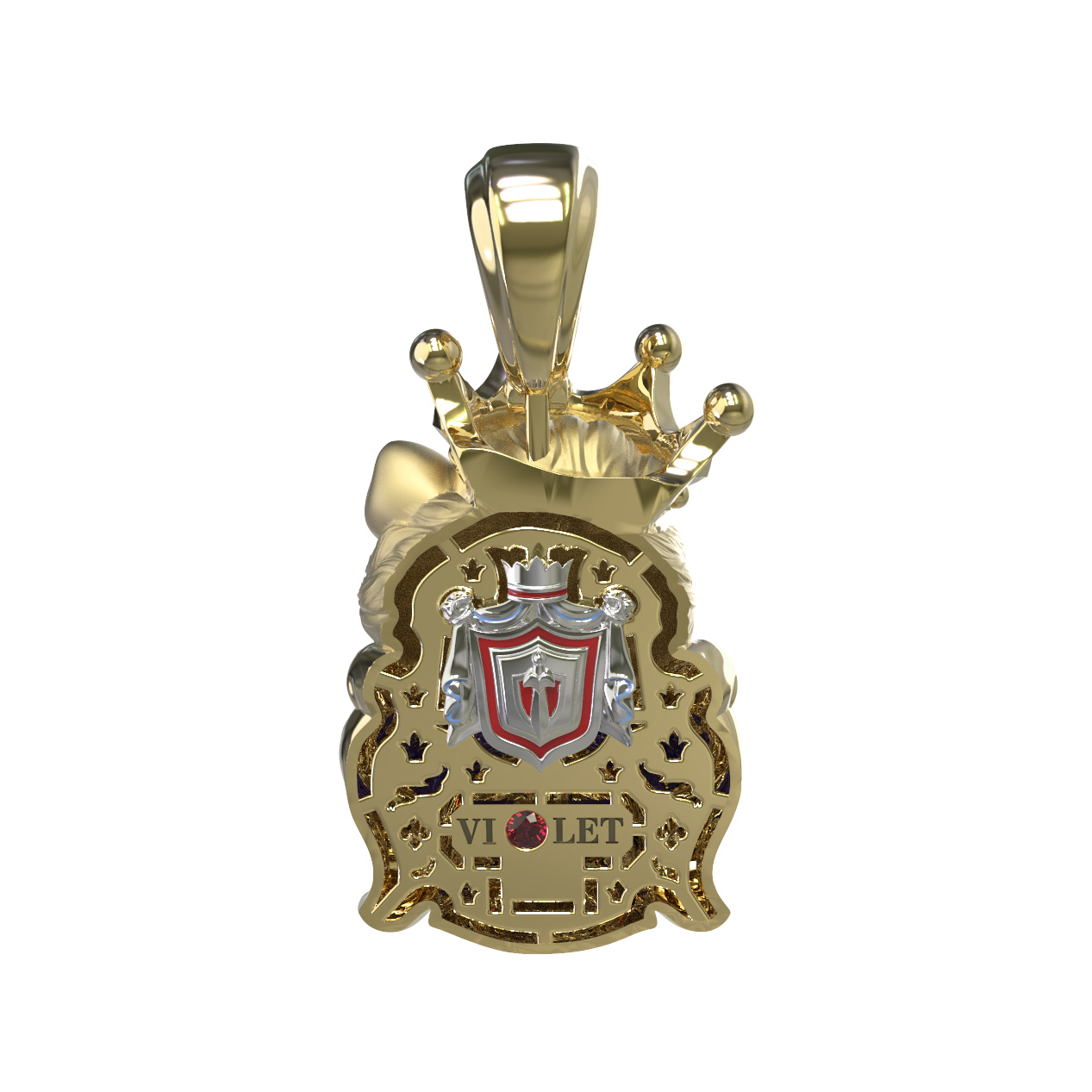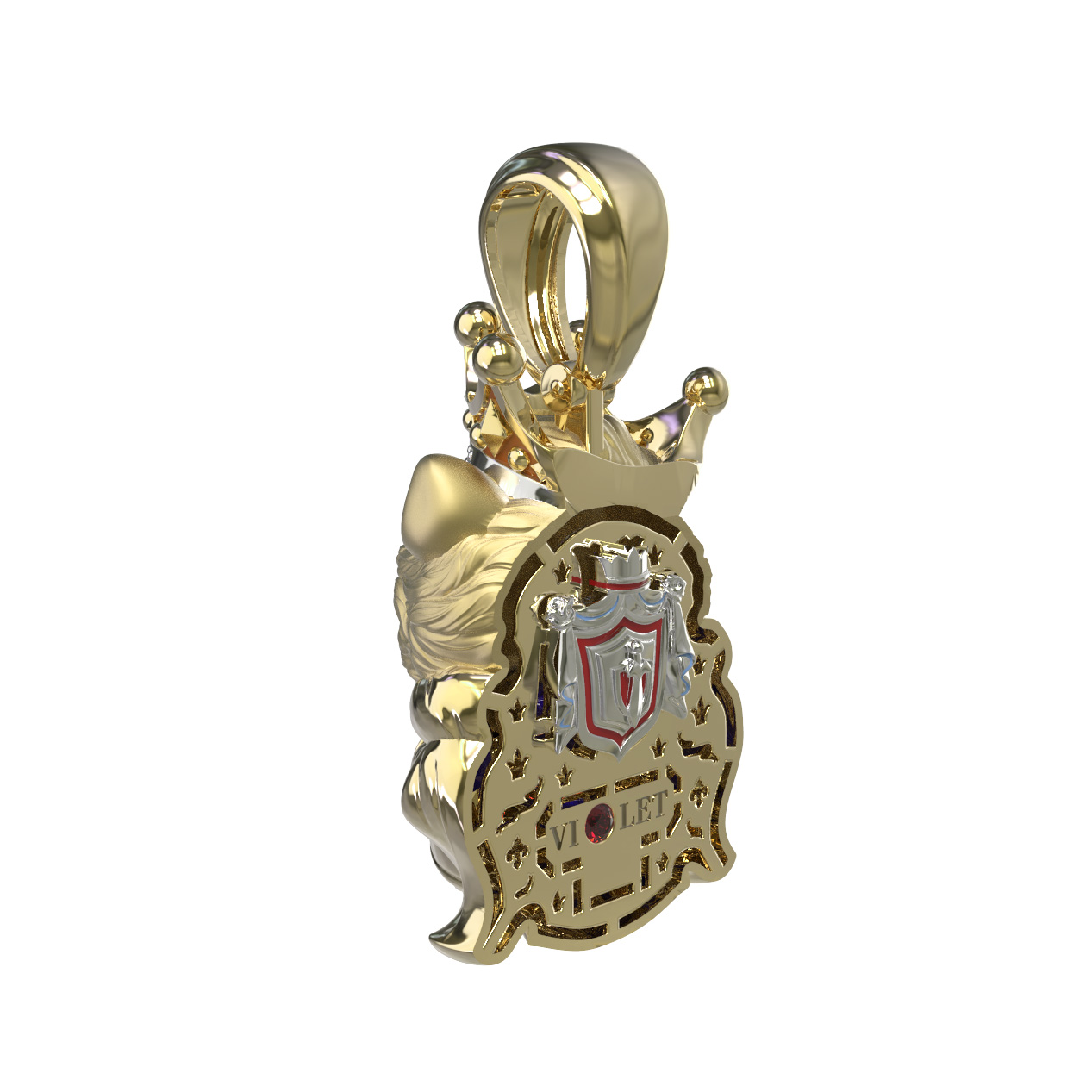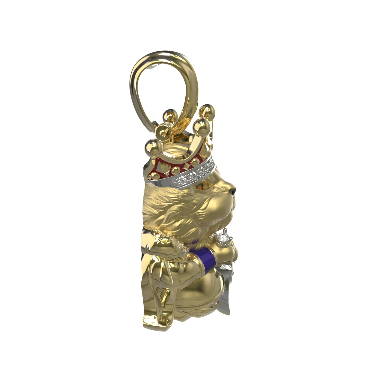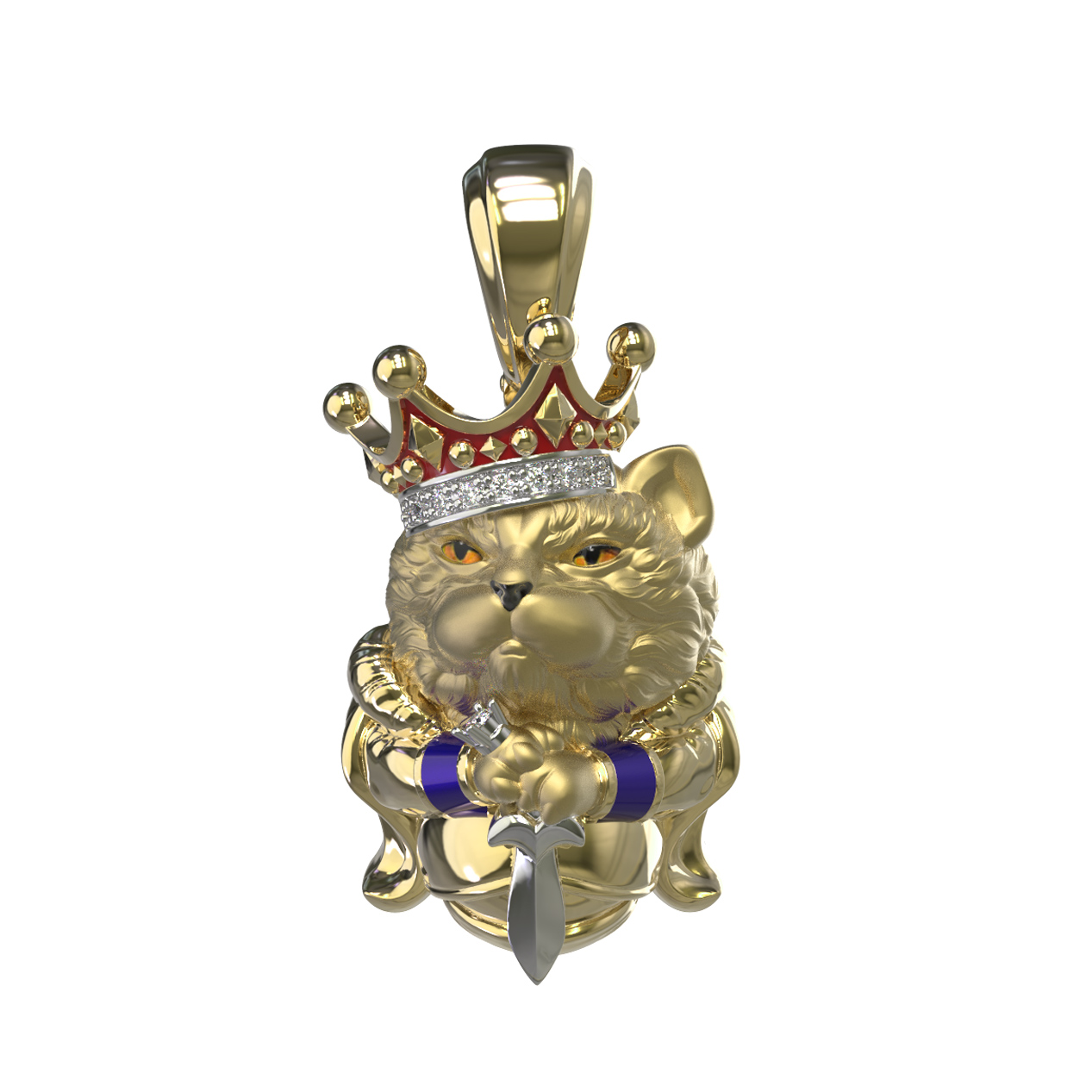 Композицию дополняют яркие вставки: глубокий красный цвет рубина эффектно сочетается с сиянием белых бриллиантов, украшающих корону персонажа. Ювелирная эмаль разноцветных оттенков придает изделию выразительность и глубину. Всего в модели использовано 10 вставок круглой формы, каждая из которых тщательно отобрана для создания гармоничного образа.