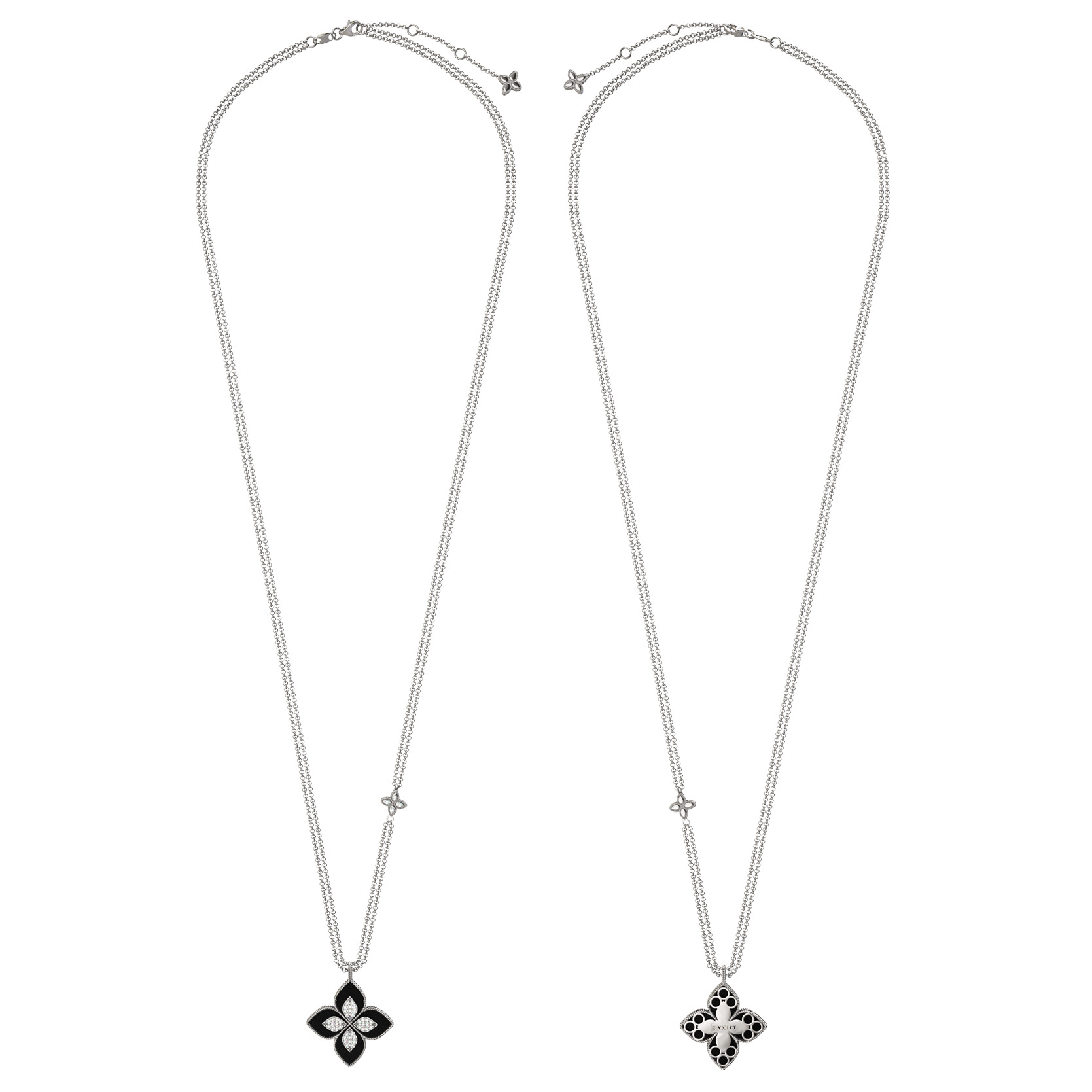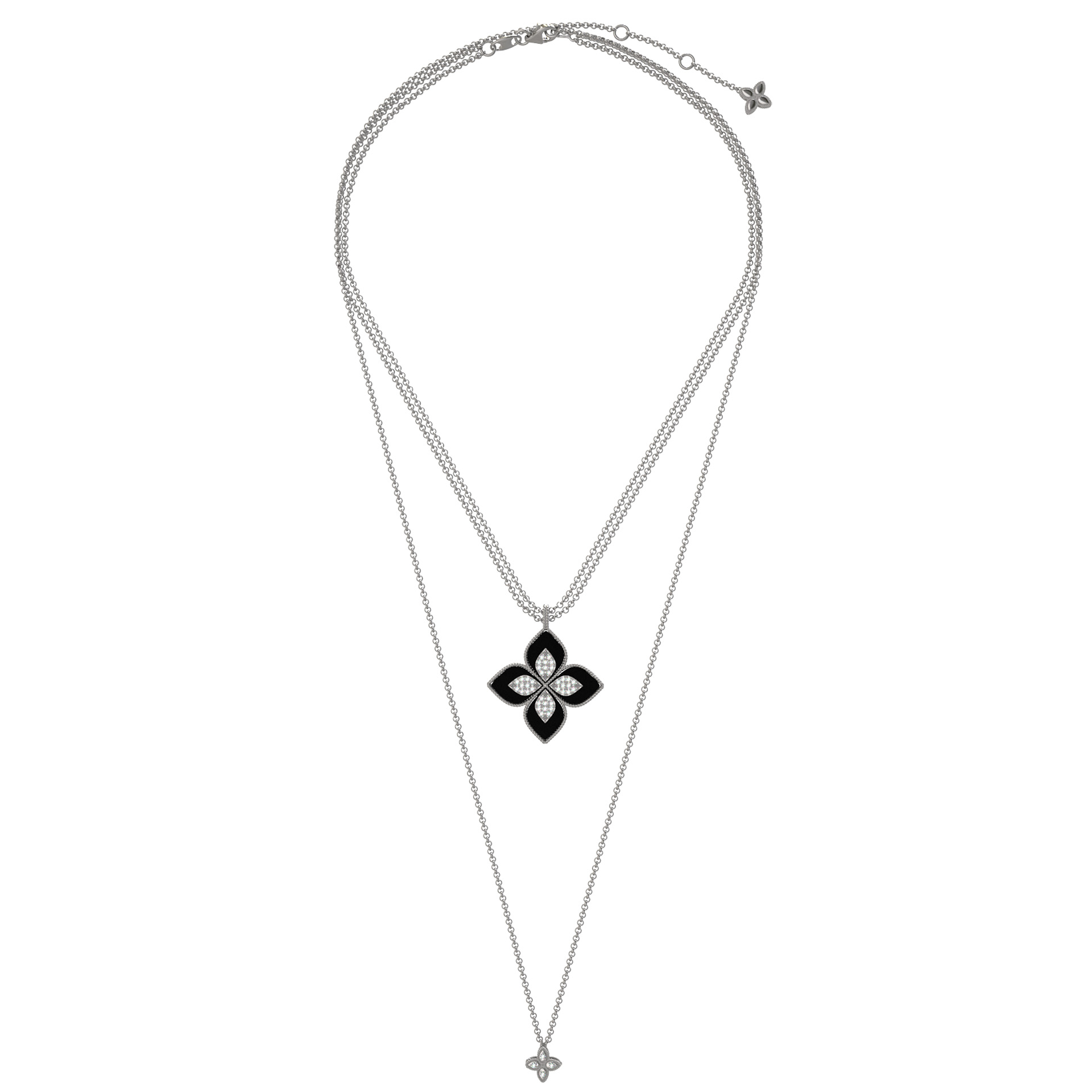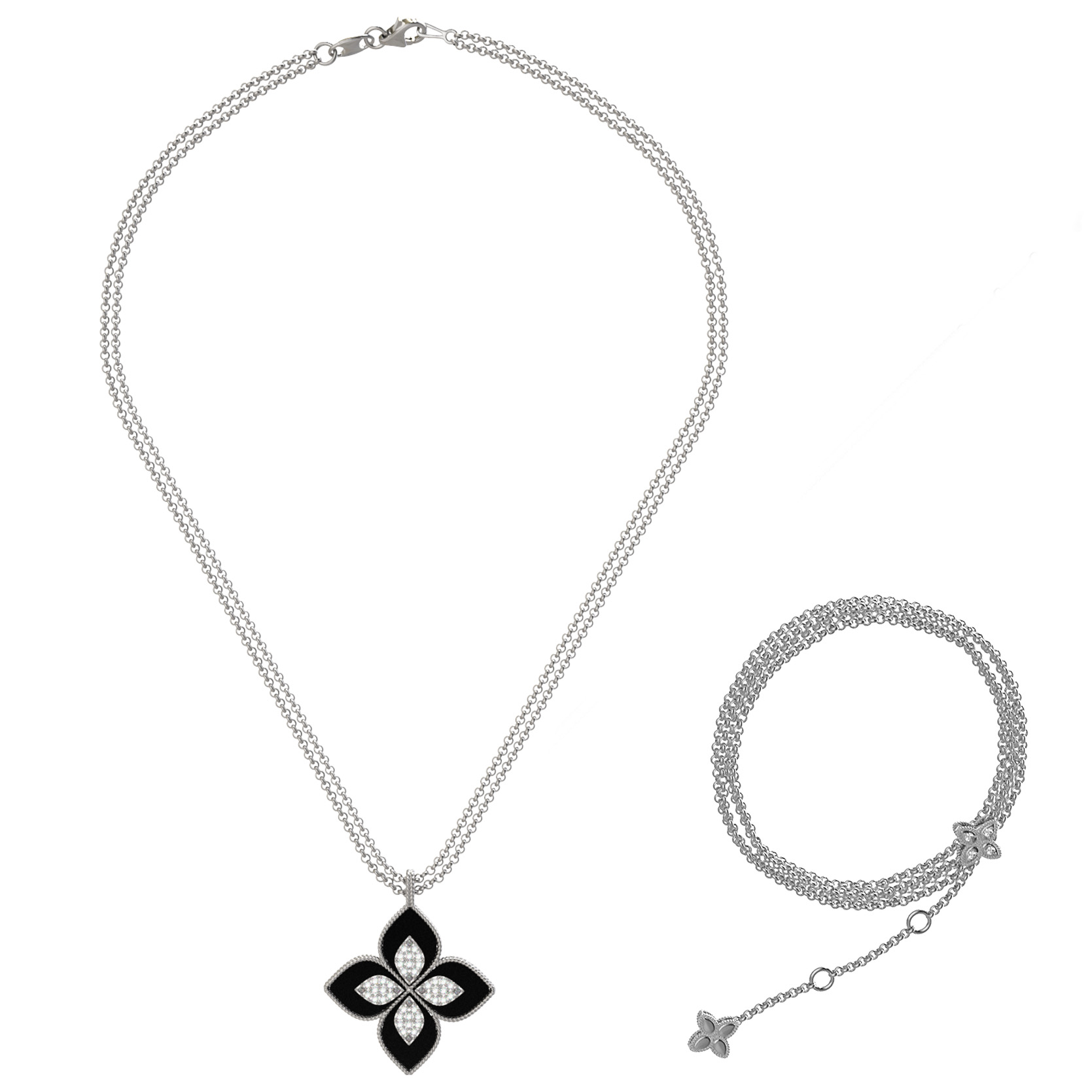 Центральный элемент композиции декорирован вставками в форме лепестка, которые дополнены 56 драгоценными камнями круглой огранки. Гармоничная игра белых бриллиантов и черного оникса придает изделию особое благородство. Это универсальное колье разработано как для женщин, так и для мужчин, предпочитающих статусные аксессуары с глубоким эстетическим смыслом.