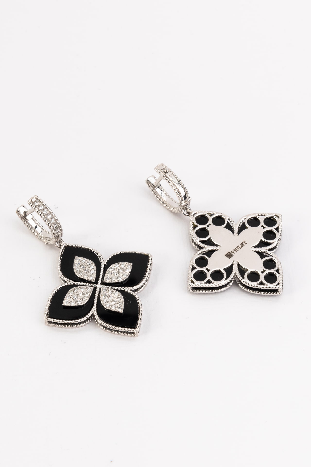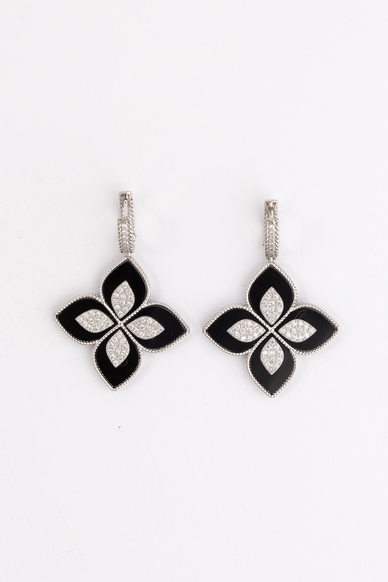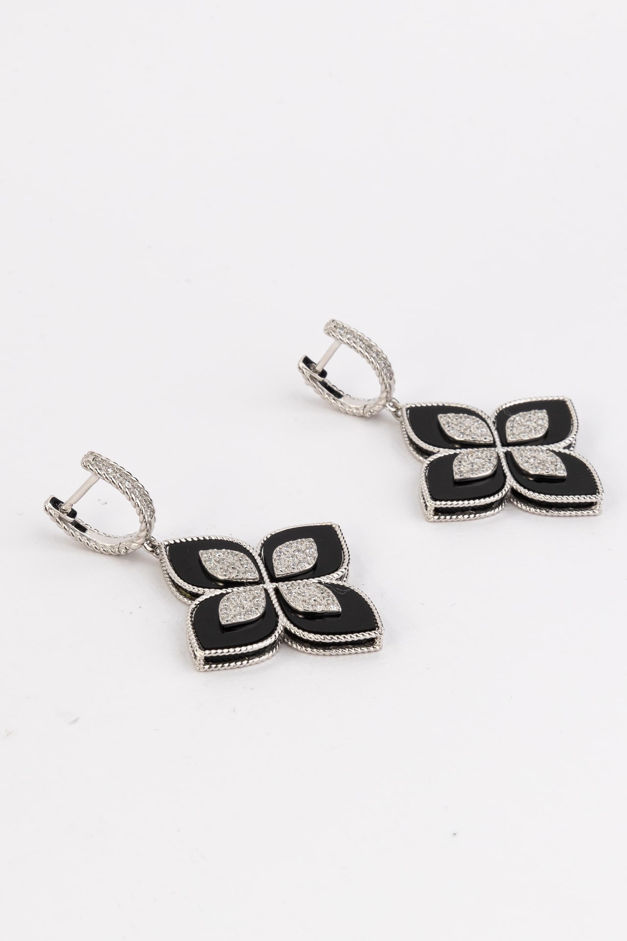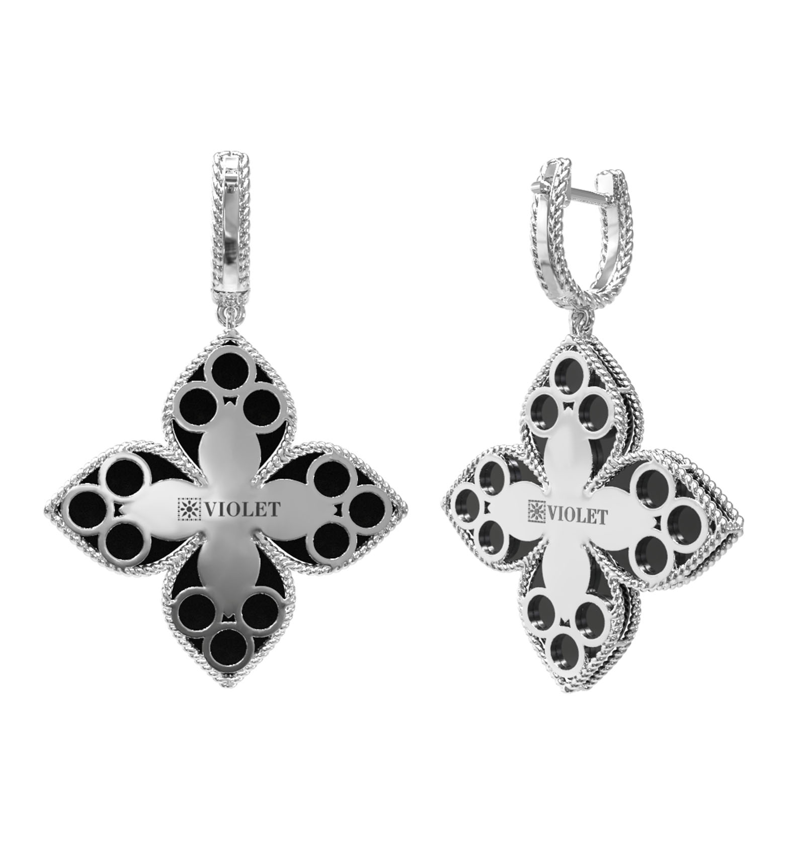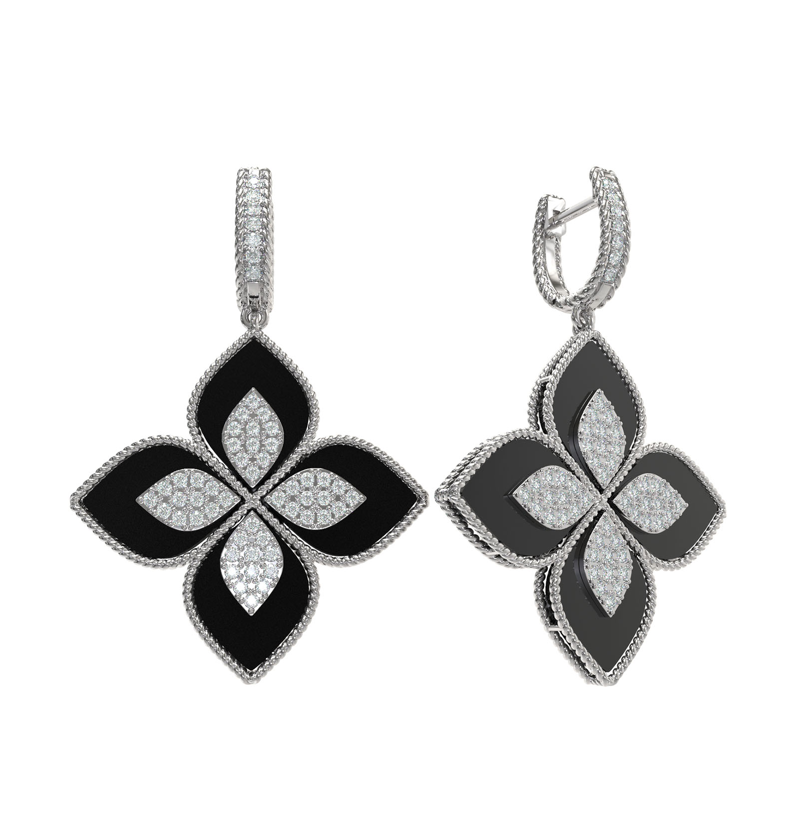 Центральным элементом композиции является искусная игра цвета: глубокий черный оттенок оникса гармонично дополняется чистотой белых вставок. Форма вставок в виде лепестка и круга создает объемный эффект, подчеркивая роскошь изделия. Всего серьги инкрустированы 118 камнями, которые ярко сияют в обрамлении белого металла. Такое сочетание делает украшение универсальным акцентом, который подойдет как для женщин, так и для мужчин, предпочитающих статусные и выразительные аксессуары.
