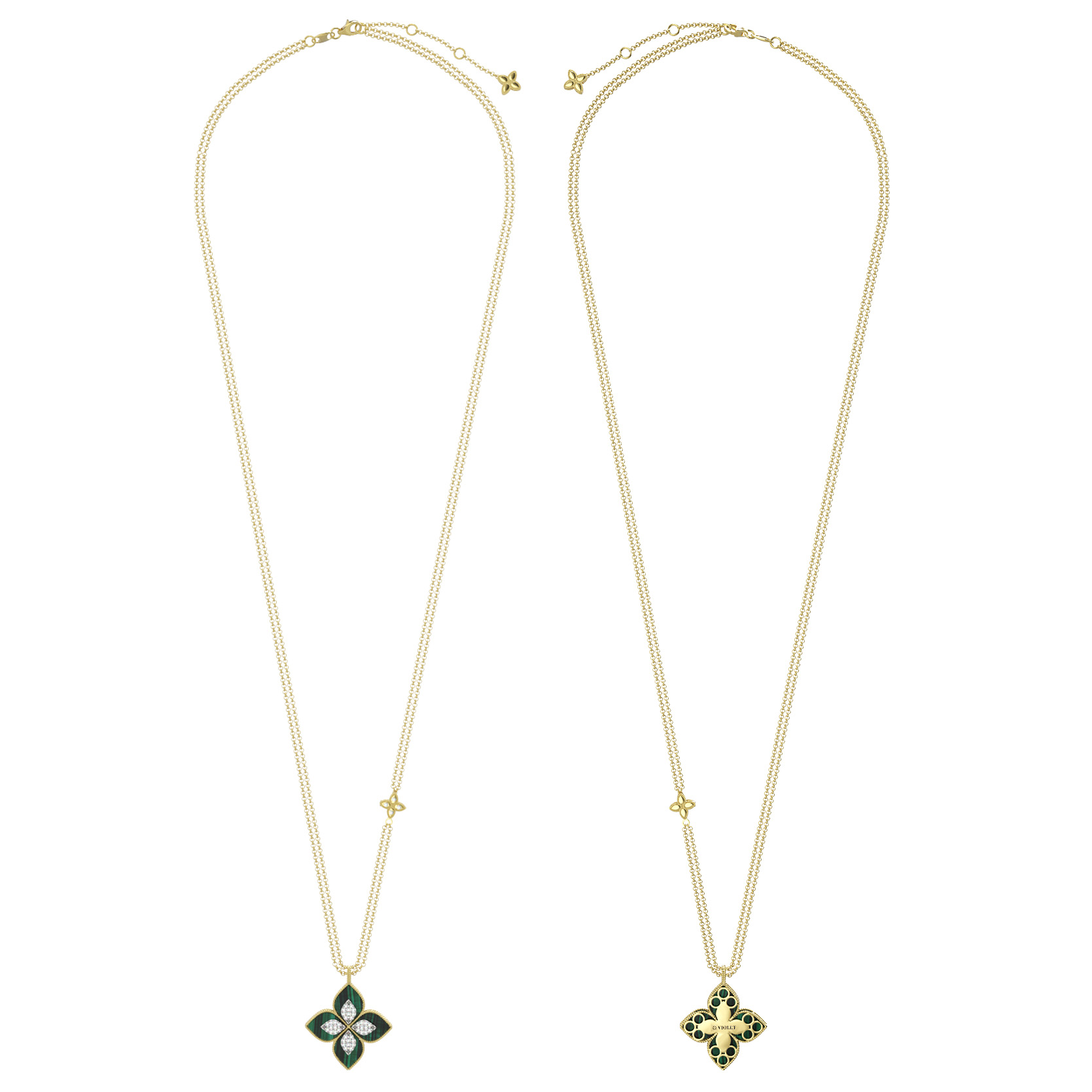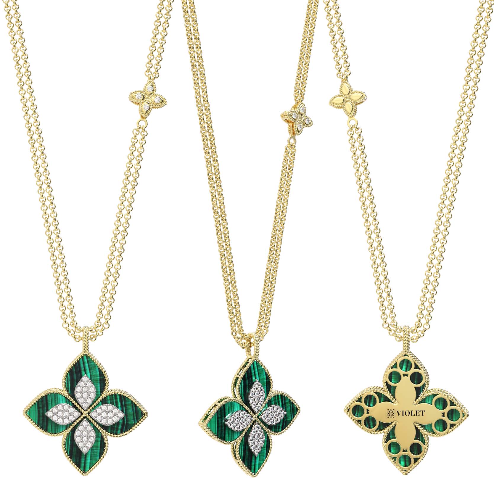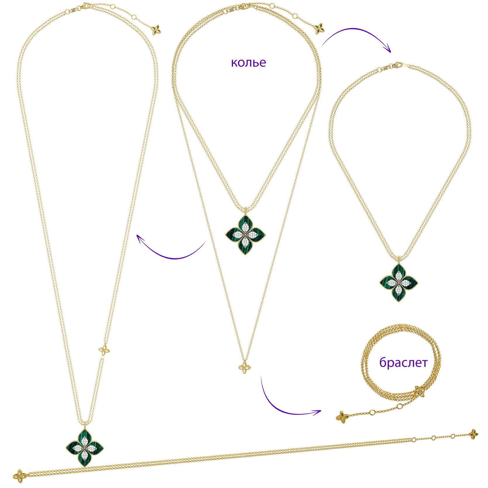 Элегантное колье из лимонного золота 585 пробы — центральный элемент коллекции De Luxe — Венецианская принцесса, созданный для тех, кто ценит утонченность и ювелирное мастерство. Дизайн изделия вдохновлен природными мотивами и воплощен в изящной форме клевера, которая придает украшению особое очарование. Глубокий, насыщенный зеленый цвет вставок из натурального малахита гармонично сочетается с теплым блеском лимонного золота, создавая благородный контраст.