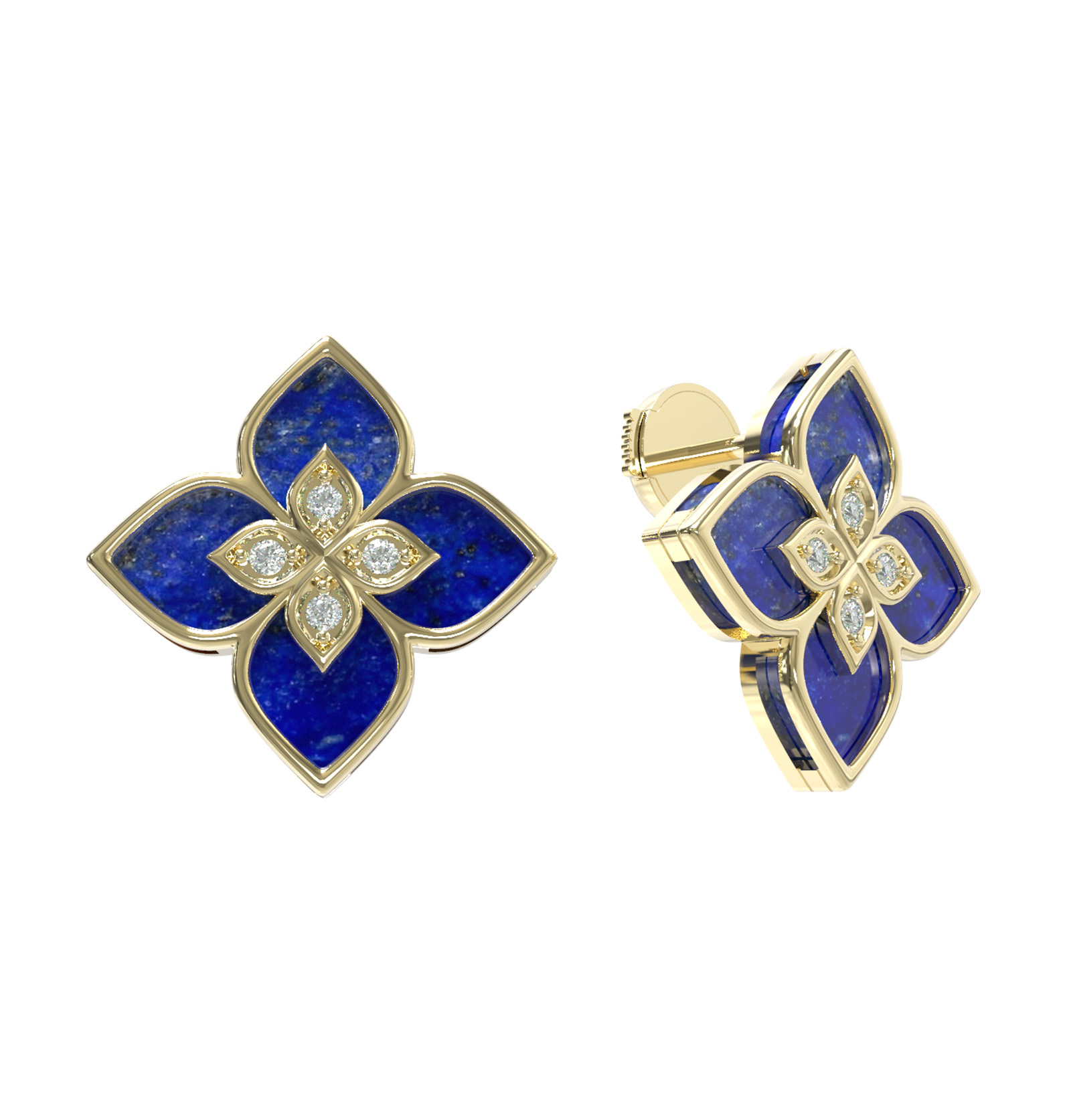 Серьги из лимонного золота 585 пробы из коллекции De Luxe — Венецианская принцесса воплощают в себе изысканность и утонченный вкус. Дизайн изделия выполнен в форме клевера, который гармонично объединяет благородный металл и яркие акценты. Основным элементом композиции является глубокий синий лазурит, чья насыщенность создает прекрасный контраст с теплым оттенком лимонного золота. В центре украшения располагаются 10 вставок: сверкающие белые бриллианты огранки круг, которые деликатно дополняют форму четырёхлистника и придают изделию роскошное сияние.