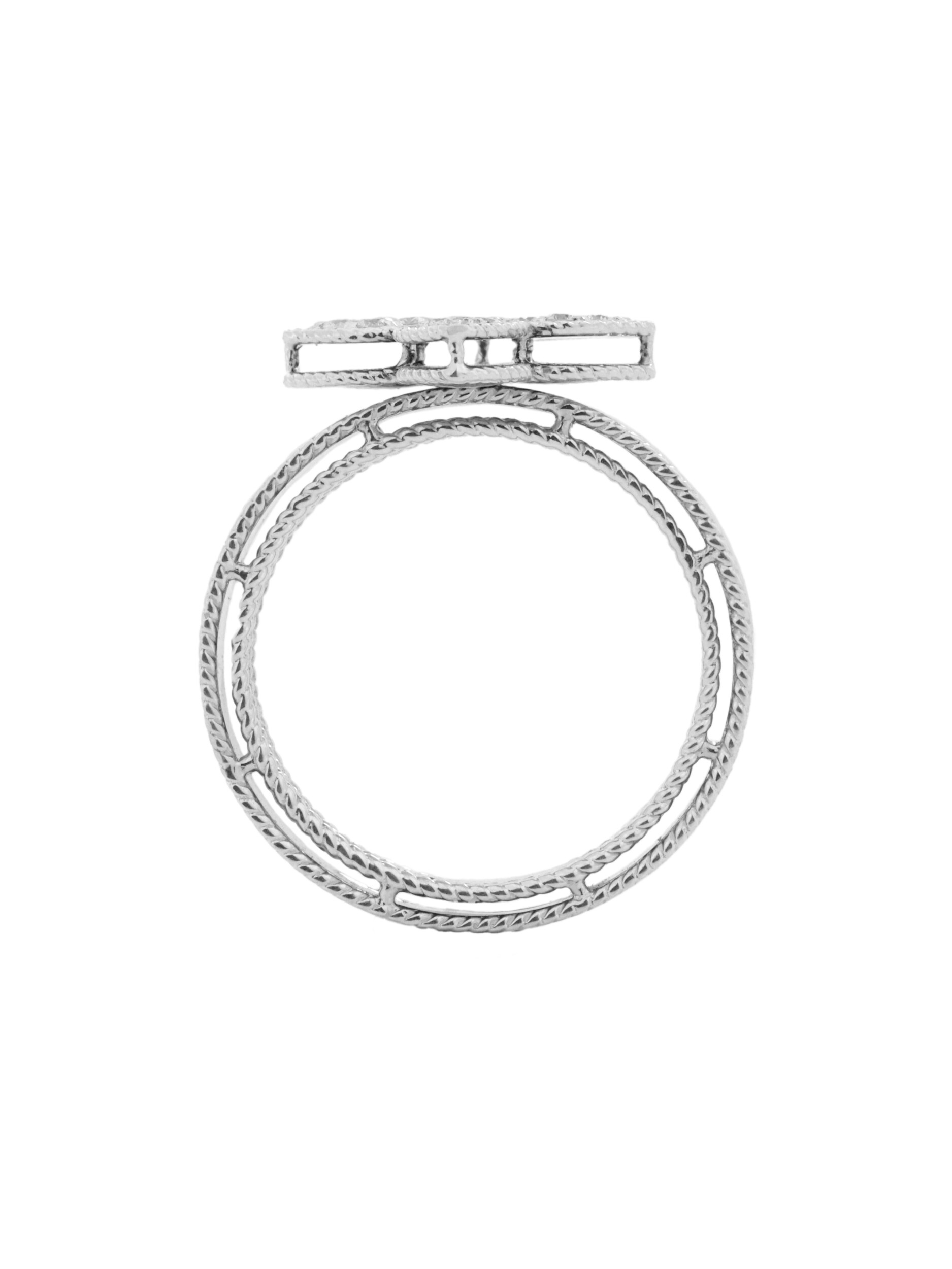 Центральным элементом композиции являются 16 сверкающих бриллиантов круглой формы, которые мягко переливаются при любом освещении. Белый цвет вставок идеально сочетается с холодным блеском металла, создавая целостное и элегантное изделие. Шинка кольца имеет фактурную отделку, что придает ему особый характер и глубину.