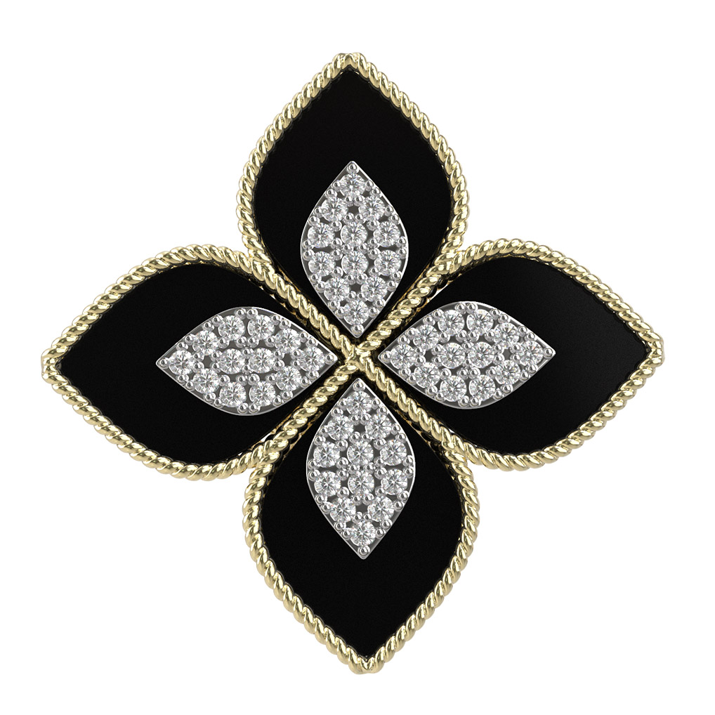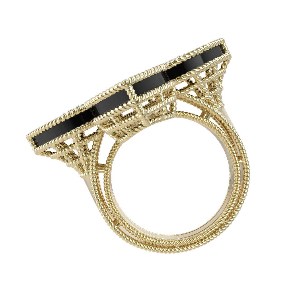Декоративная часть кольца привлекает внимание искусной работой с формой: вставки в виде лепестков создают гармоничную композицию из 52 драгоценных камней. Контраст черного и белого цвета в сочетании с теплым оттенком золота делает это украшение универсальным аксессуаром, который подойдет как для женщин, так и для мужчин. Благодаря своему статусному виду, данное кольцо отлично смотрится в составе комплектов, позволяя создавать завершенные ювелирные ансамбли.