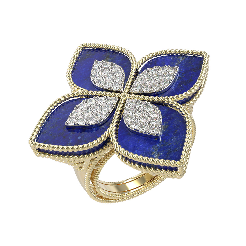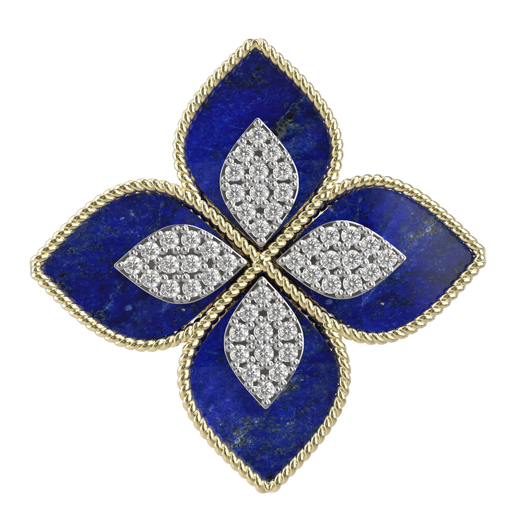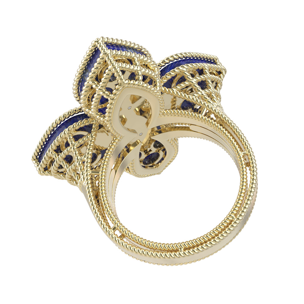 Роскошное кольцо из лимонного золота 585 пробы из коллекции De Luxe — Венецианская принцесса станет безупречным акцентом вашего образа. Это ювелирное украшение выполнено в изысканном дизайне в форме четырехлистного клевера, символизирующего удачу и благополучие. Ювелиры мастерски соединили в изделии природную глубину синего лазурита и ослепительное сияние белых бриллиантов, создав неповторимый контраст материалов.
