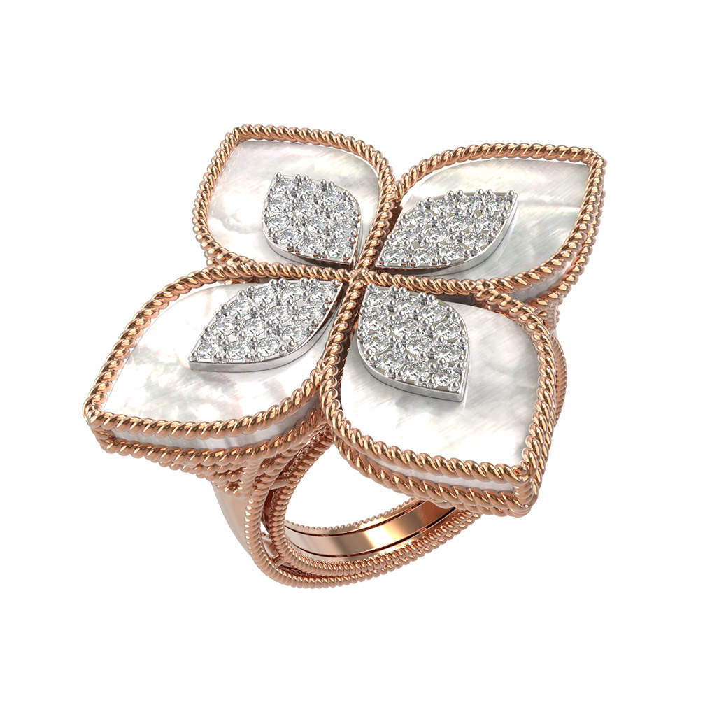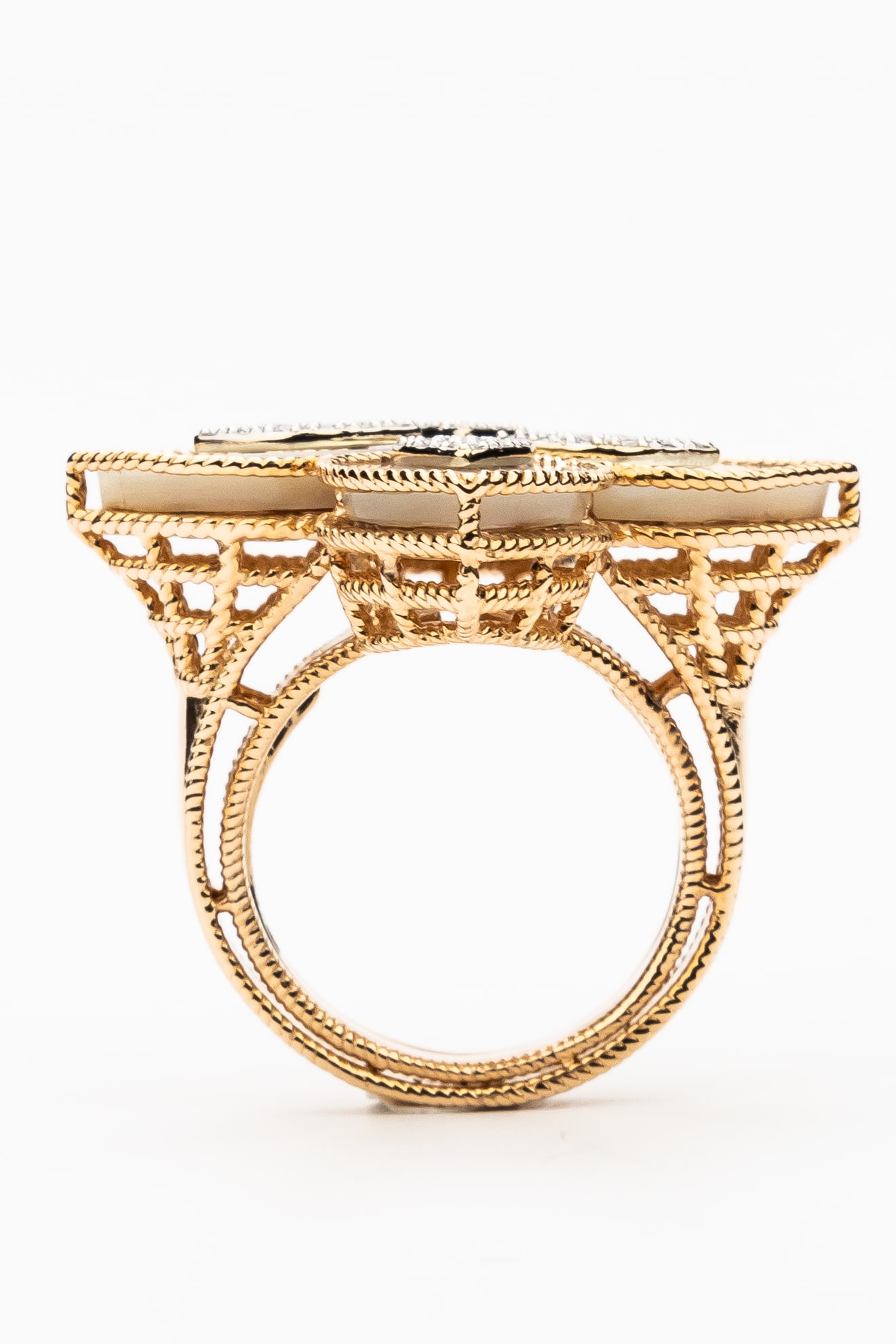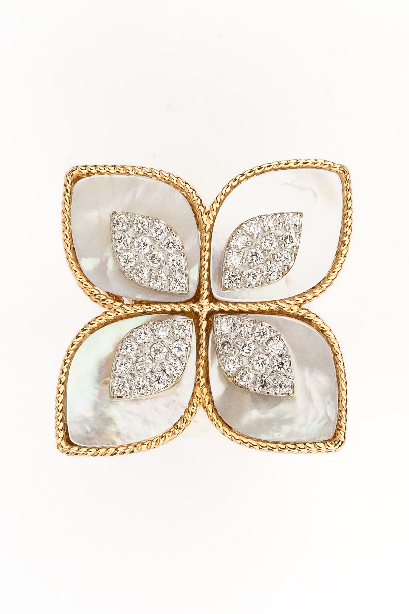 Дизайн украшения приковывает взгляд: четыре крупных лепестка из перламутра подчеркнуты филигранной окантовкой, внутри которых расположены декоративные вставки в форме лепестка с инкрустацией из 48 бриллиантов круглой огранки. Детализация каждого элемента, от витого оформления шинки до точности закрепки камней, делает это кольцо настоящим шедевром ювелирного искусства. Такое украшение идеально подходит как женщинам, так и мужчинам, предпочитающим акцентные аксессуары.