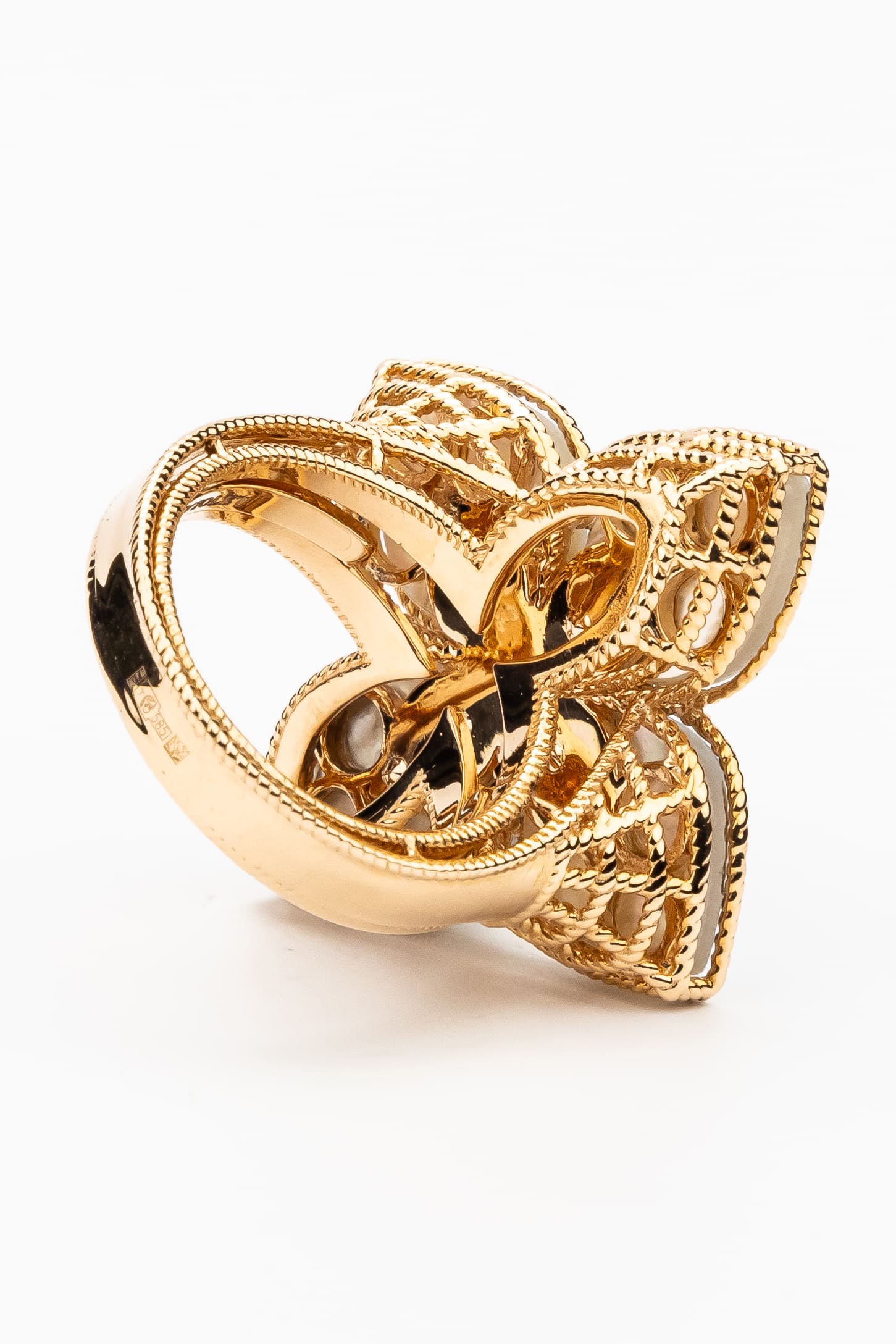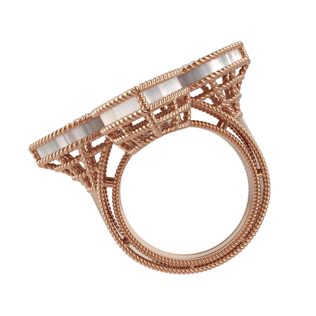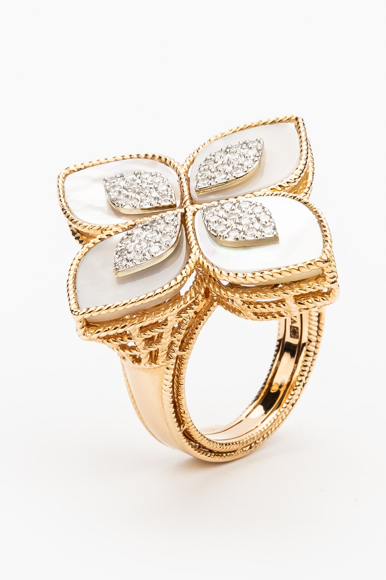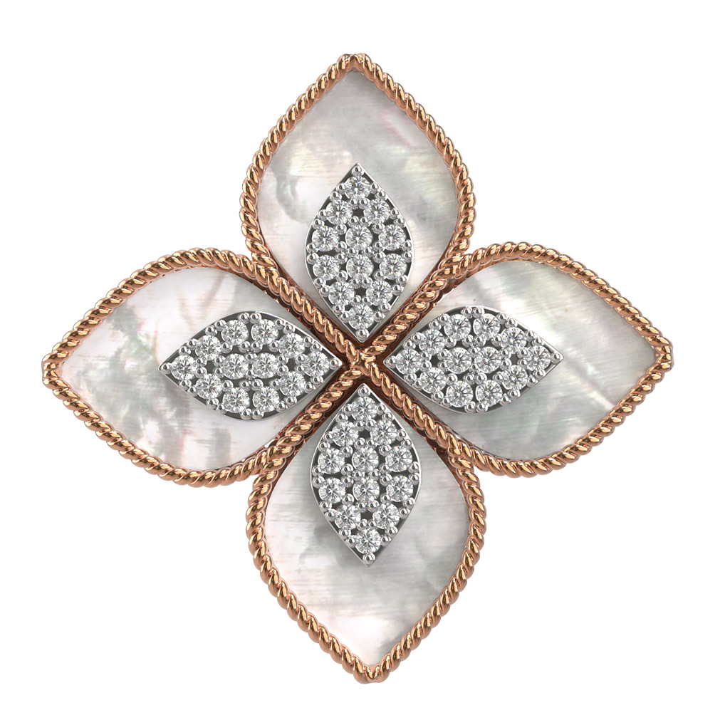 Дизайн украшения приковывает взгляд: четыре крупных лепестка из перламутра подчеркнуты филигранной окантовкой, внутри которых расположены декоративные вставки в форме лепестка с инкрустацией из 48 бриллиантов круглой огранки. Детализация каждого элемента, от витого оформления шинки до точности закрепки камней, делает это кольцо настоящим шедевром ювелирного искусства. Такое украшение идеально подходит как женщинам, так и мужчинам, предпочитающим акцентные аксессуары.