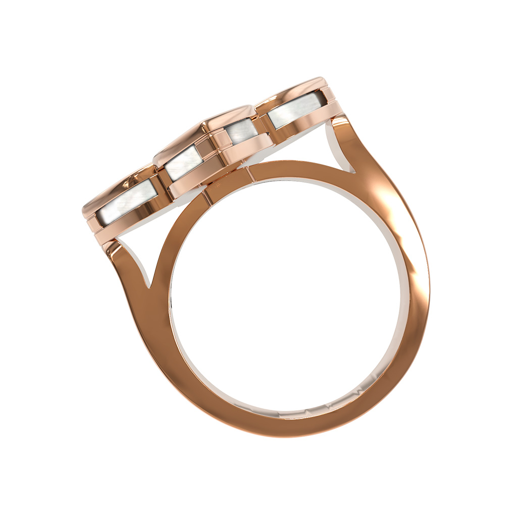 Это кольцо из коллекции De Luxe — Венецианская принцесса станет идеальным дополнением вашего ювелирного гардероба. Благодаря продуманной форме в виде клевера, изделие выглядит объемно и статусно на руке. Изысканная игра света на перламутровых вставках подчеркивает глубину красного золота, а бриллианты добавляют необходимые акценты. Данная модель универсальна: она подойдет как женщинам, так и мужчинам, предпочитающим аксессуары с выразительным характером. Украшение доступно в широком диапазоне размеров, от 15 до 19.5, что позволяет подобрать идеальную посадку.