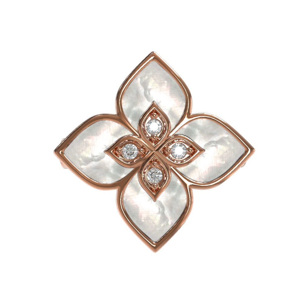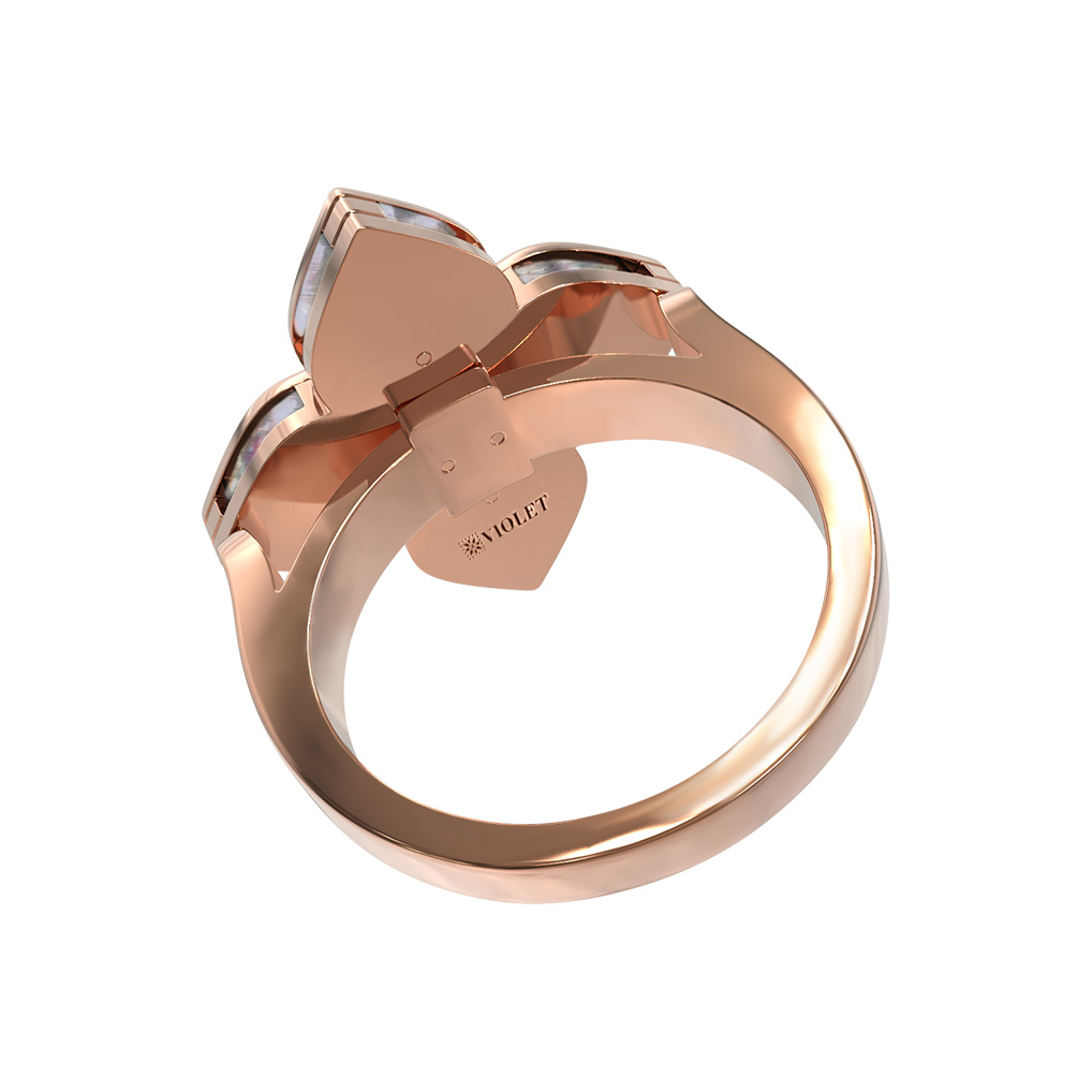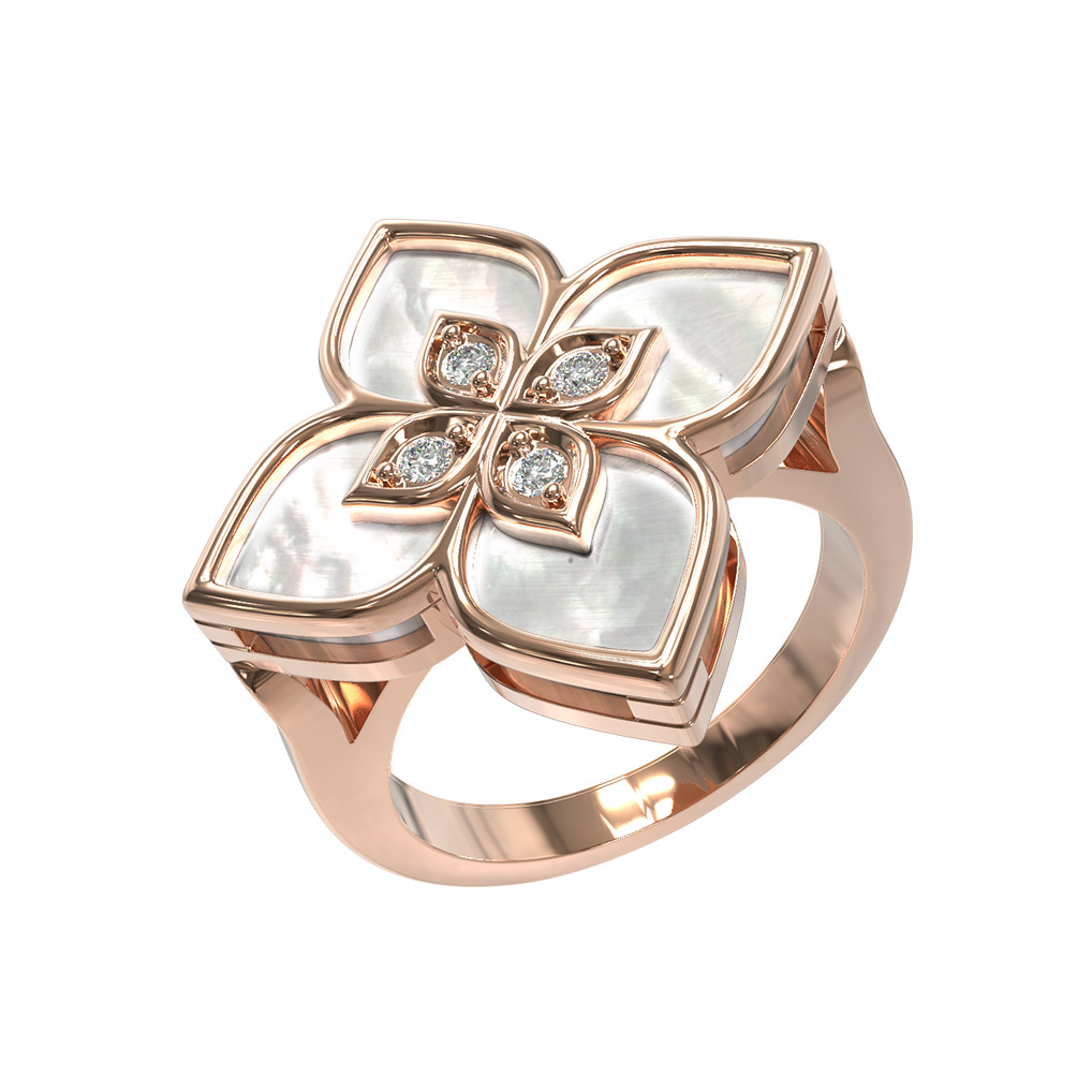 Данное кольцо может стать частью комплекта, дополнив другие украшения вашего образа. Безупречное сочетание материалов и классический, но в то же время современный дизайн, делают этот аксессуар отличным подарком или инвестицией в личную коллекцию. Ювелирное изделие из красного золота с перламутром и бриллиантами подчеркнет ваш статус и безупречный вкус, оставаясь актуальным украшением на долгие годы.