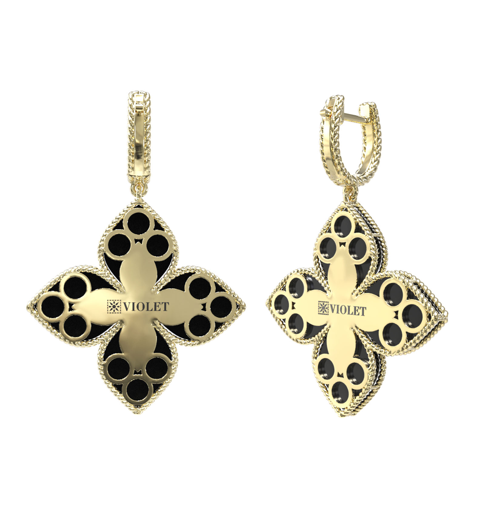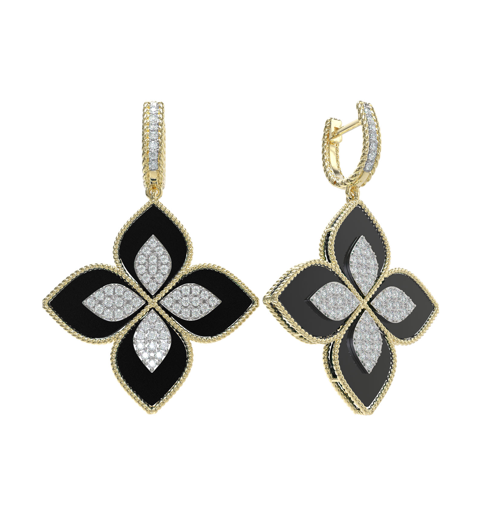 Центральным элементом композиции стали контрастные вставки: глубокий черный оникс в форме лепестков эффектно оттеняет сияние 118 бриллиантов. Белые камни круглой огранки, инкрустированные в изделие, создают завораживающую игру света при каждом движении. Общее сочетание лимонного золота, черного оникса и бриллиантового блеска делает эти серьги универсальным акцентом как для женского вечернего, так и для мужского статусного гардероба.
