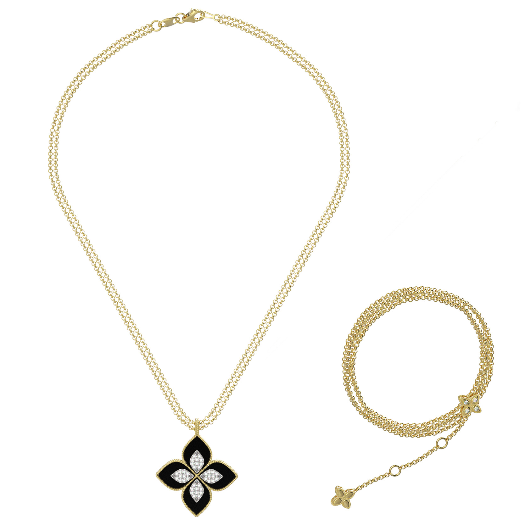 Особый шарм украшению придает контрастная игра вставок: глубокий черный оникс в форме лепестка гармонично сочетается с сияющими белыми бриллиантами круглой огранки. Всего в изделии использовано 56 драгоценных вставок, которые создают неповторимый блеск при каждом движении. Многослойная конструкция цепочки добавляет колье динамики и делает его визуально интересным.