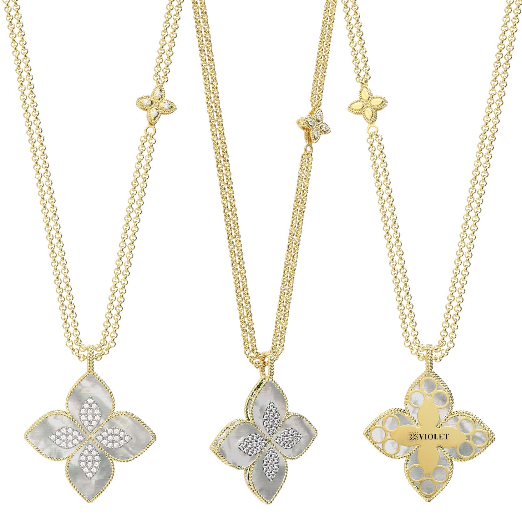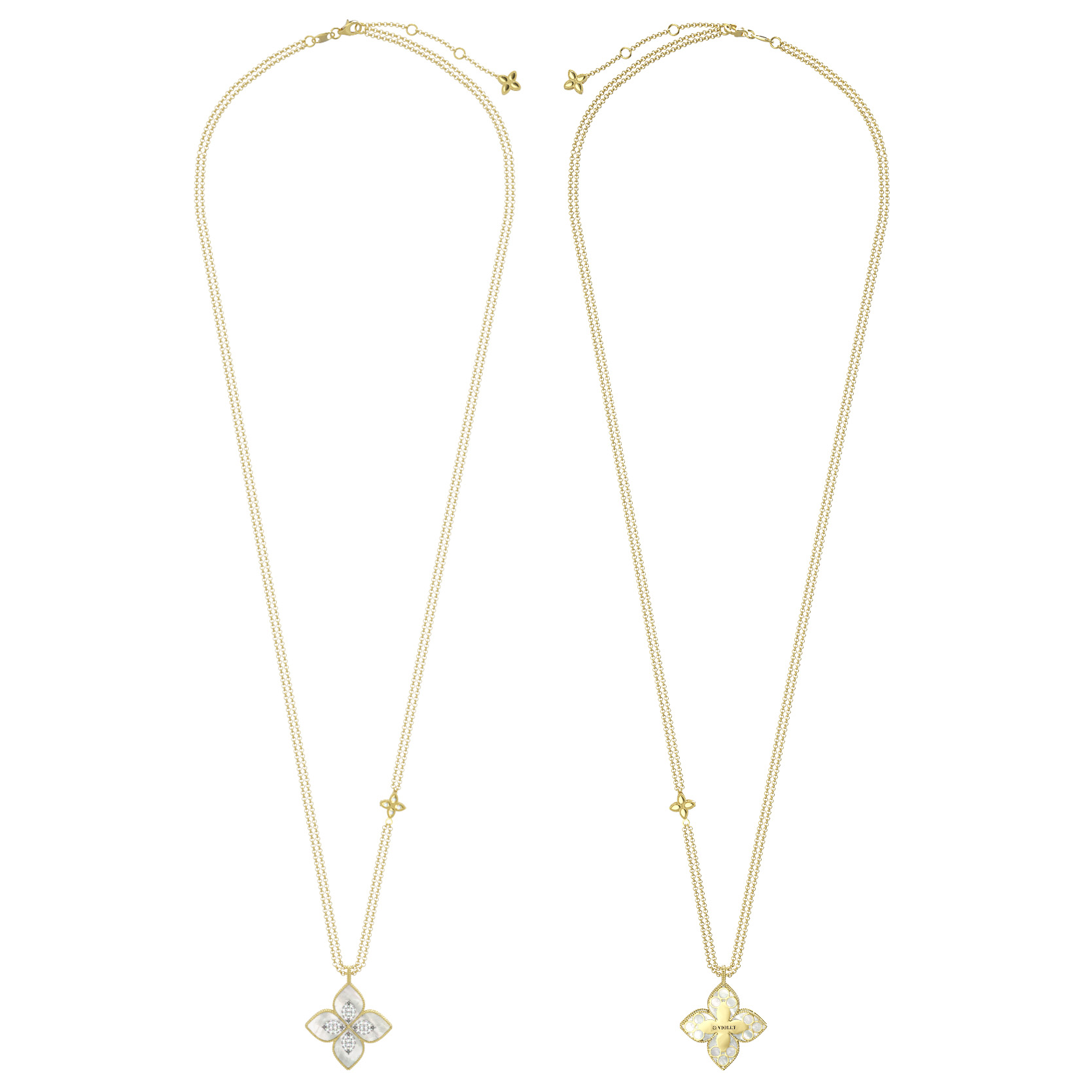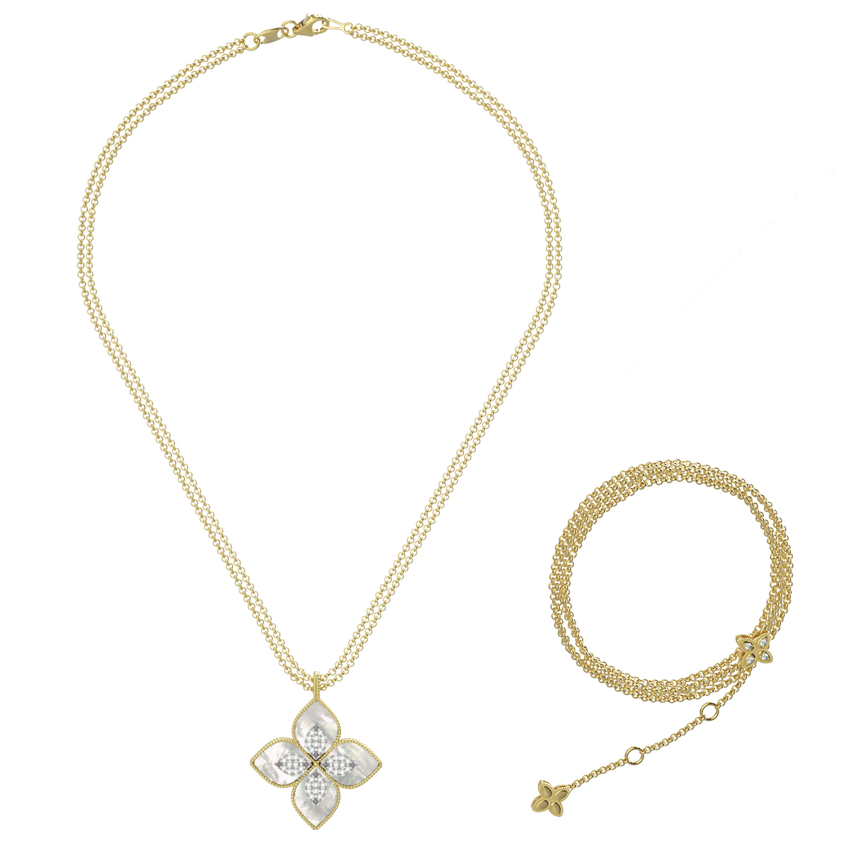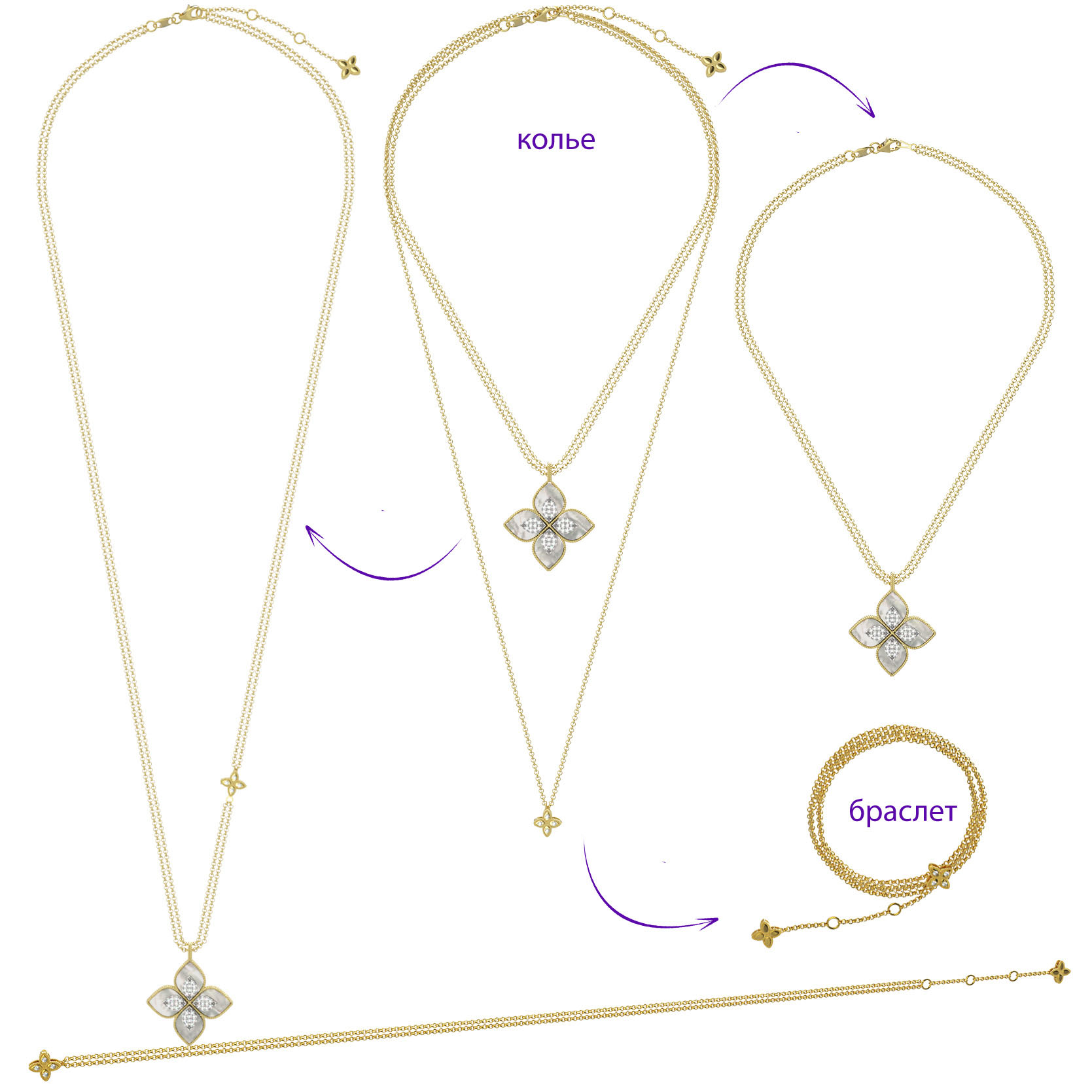 Особое очарование украшению придает контрастная игра вставок. Перламутр с его мягким внутренним свечением в форме лепестков эффектно дополнен 52 бриллиантами круглой огранки. Белый цвет камней и перламутра безупречно сочетается с лимонным золотом, рождая гармоничный союз роскоши и природной красоты. Универсальность дизайна позволяет носить это колье как женщинам, так и мужчинам, предпочитающим утонченные аксессуары.