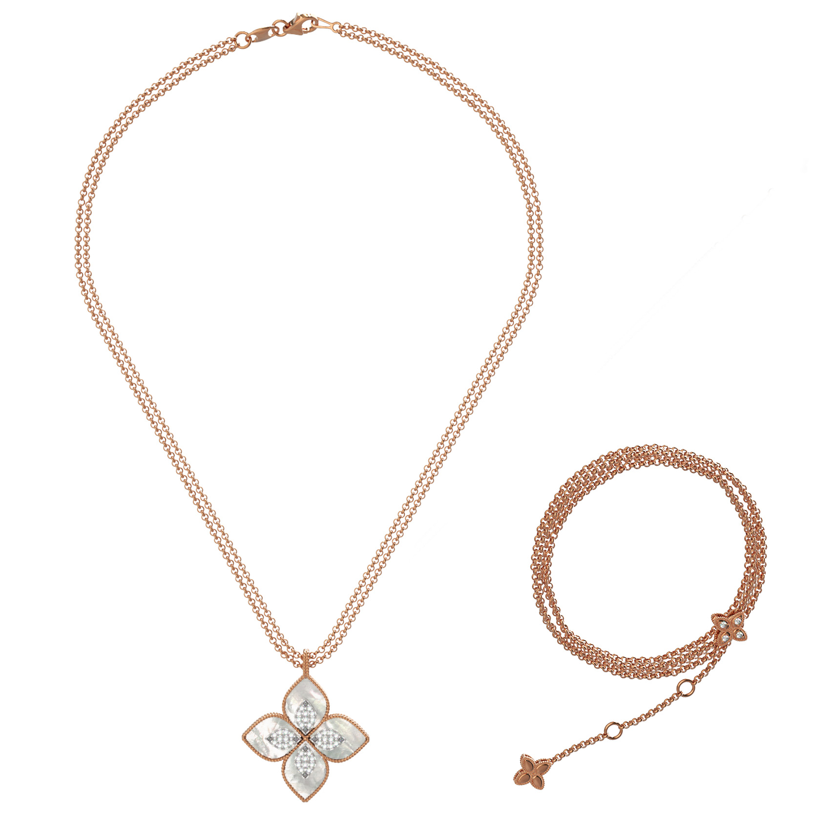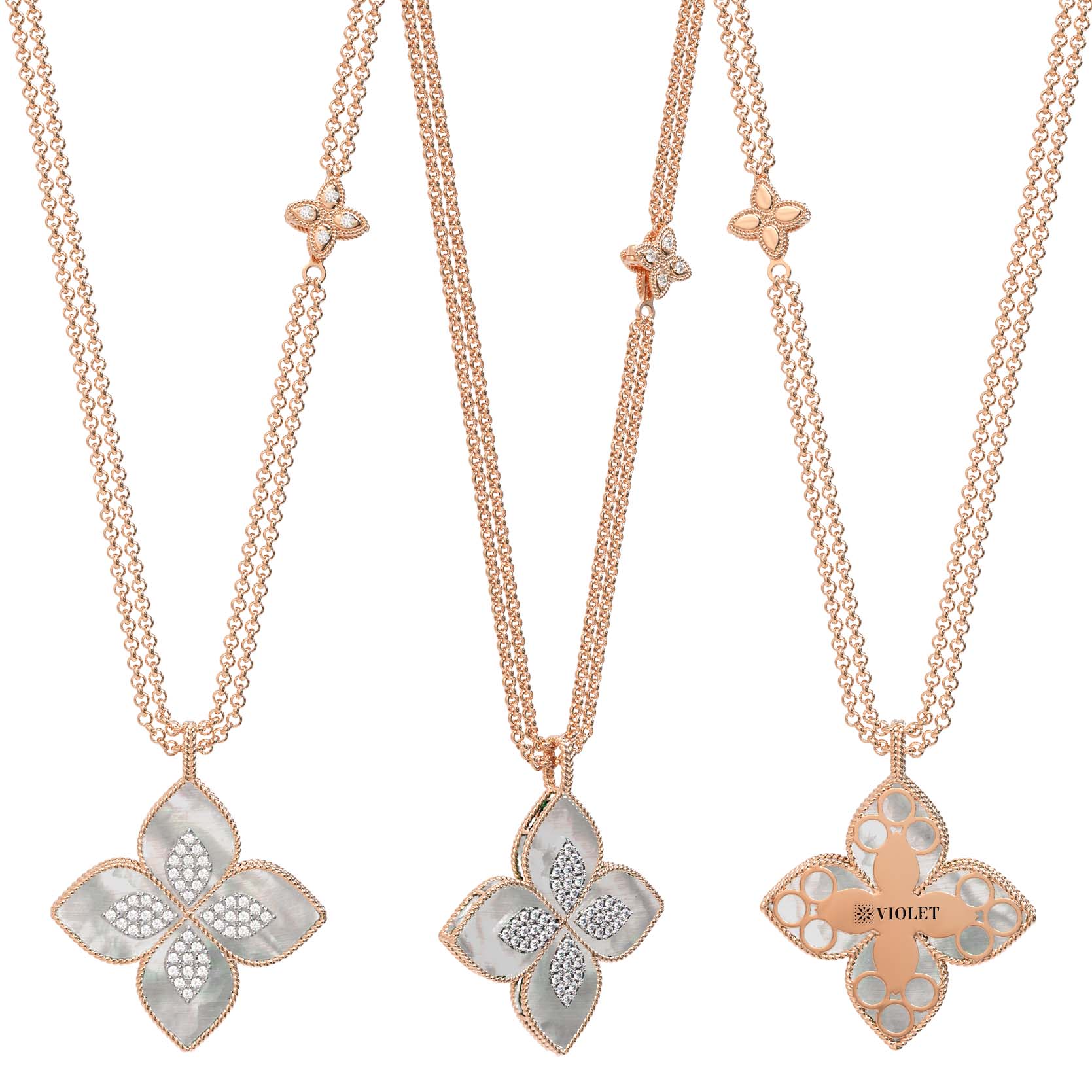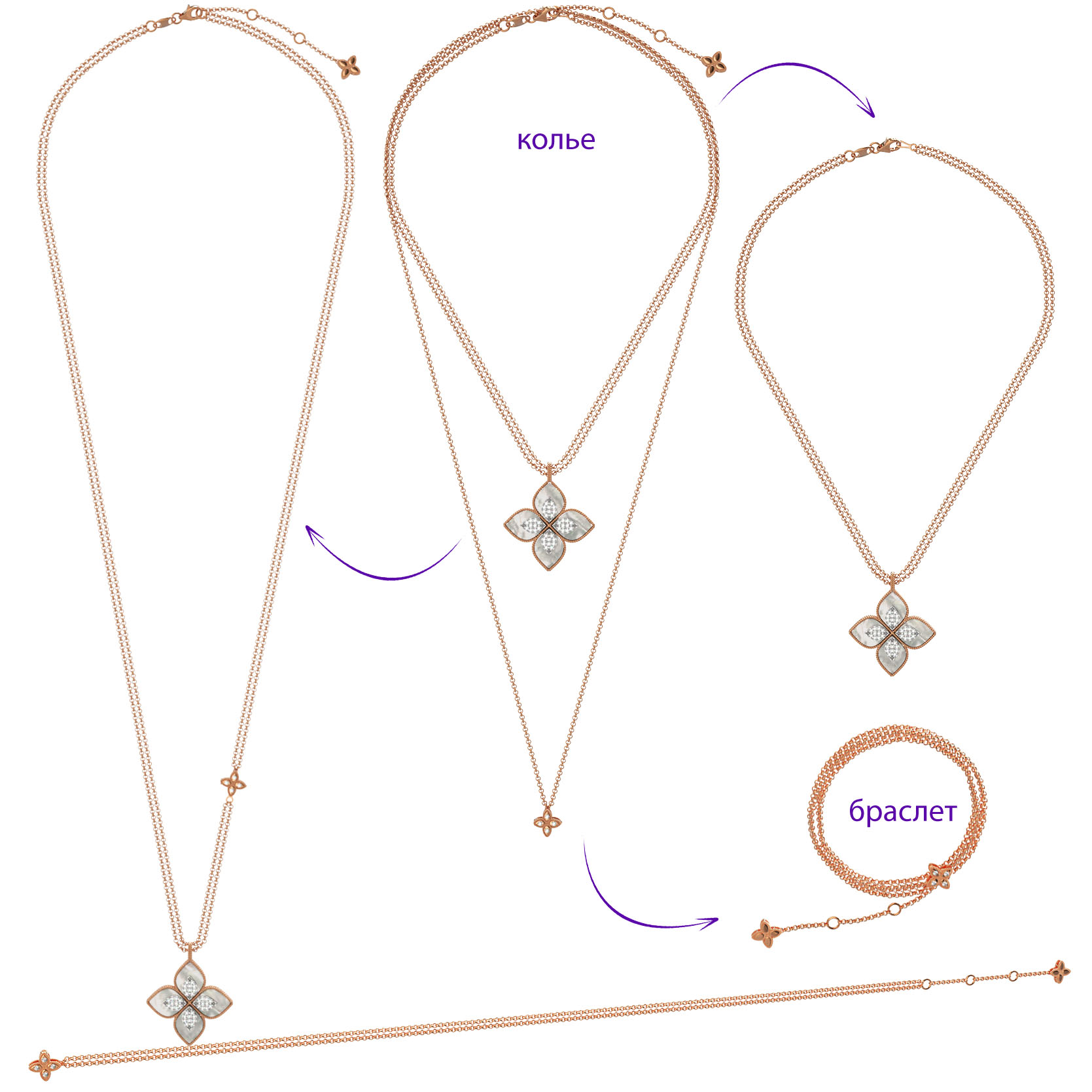 Колье из красного золота 585 пробы из коллекции De Luxe — Венецианская принцесса станет безупречным акцентом вашего образа. Дизайн в форме клевера воплощает в себе грацию и утонченность, привлекая внимание гармоничным сочетанием драгоценных материалов. Ювелирное изделие выполнено из благородного красного золота, теплое сияние которого идеально подчеркивает красоту вставок.
