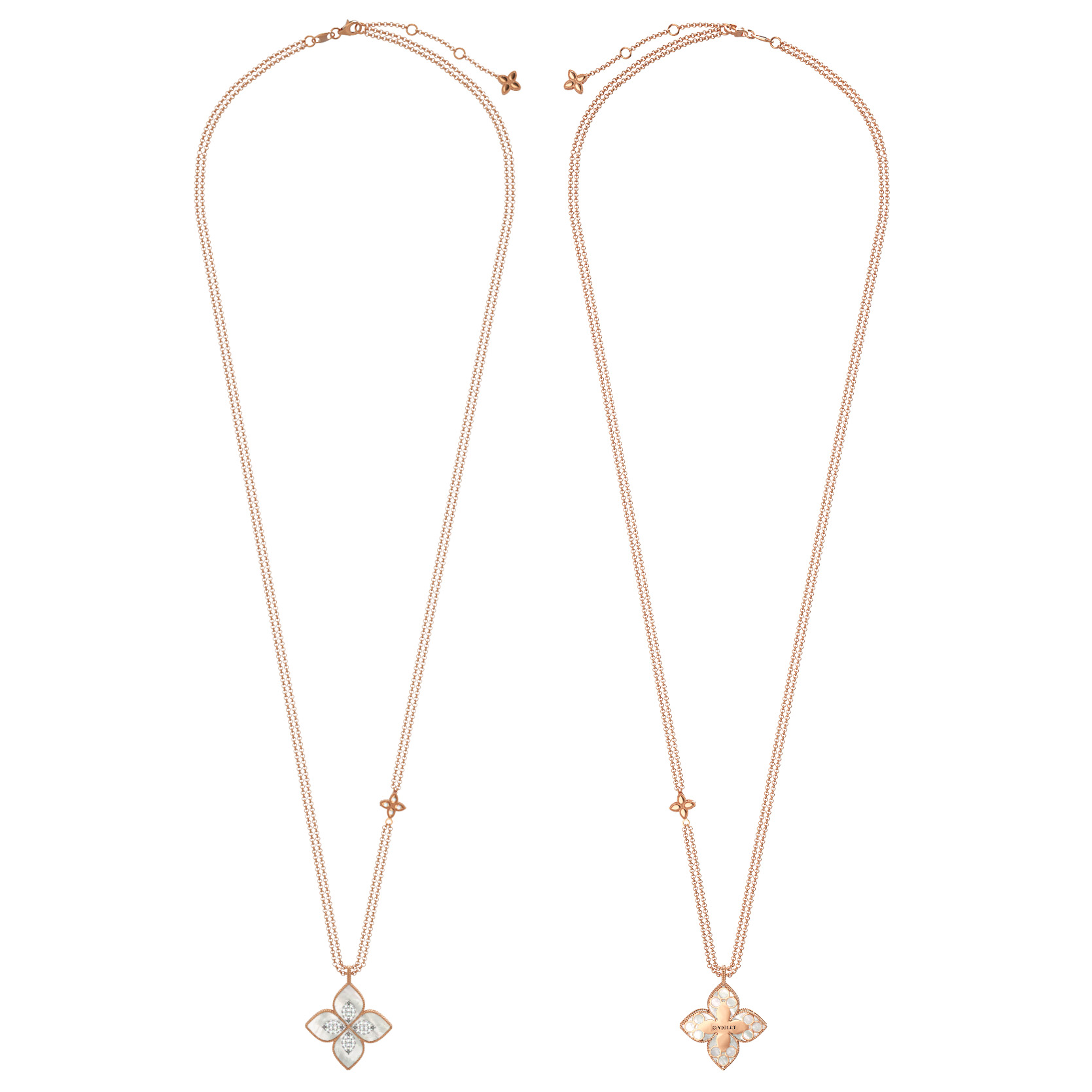Центральным элементом композиции является изысканная подвеска, инкрустированная перламутром в форме лепестка и сверкающими бриллиантами круглой формы. Общее количество вставок составляет 52 штуки, что придает украшению исключительное сияние и визуальную глубину. Белый цвет вставок эффектно контрастирует с нежным переливом перламутра, создавая завершенную и роскошную эстетику.