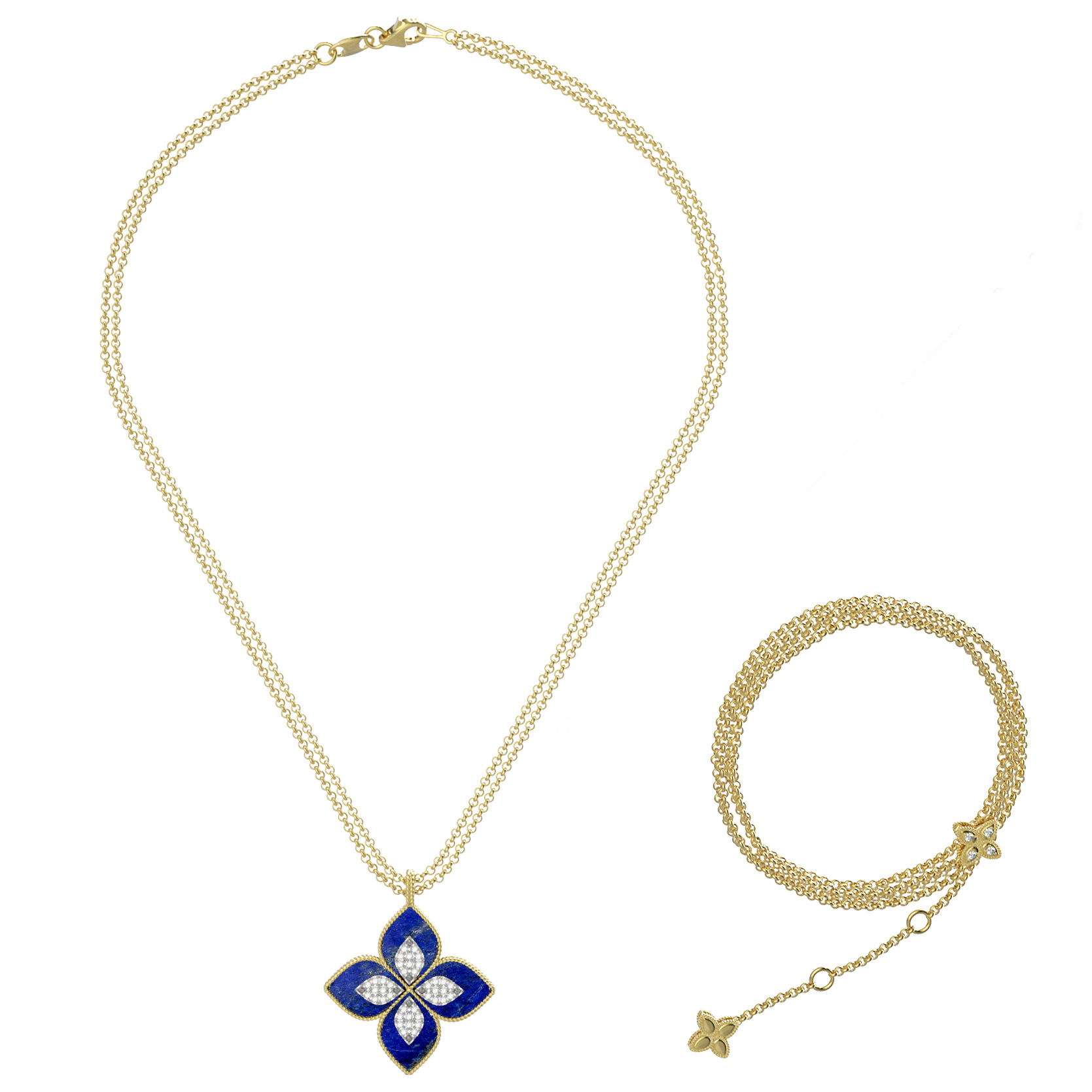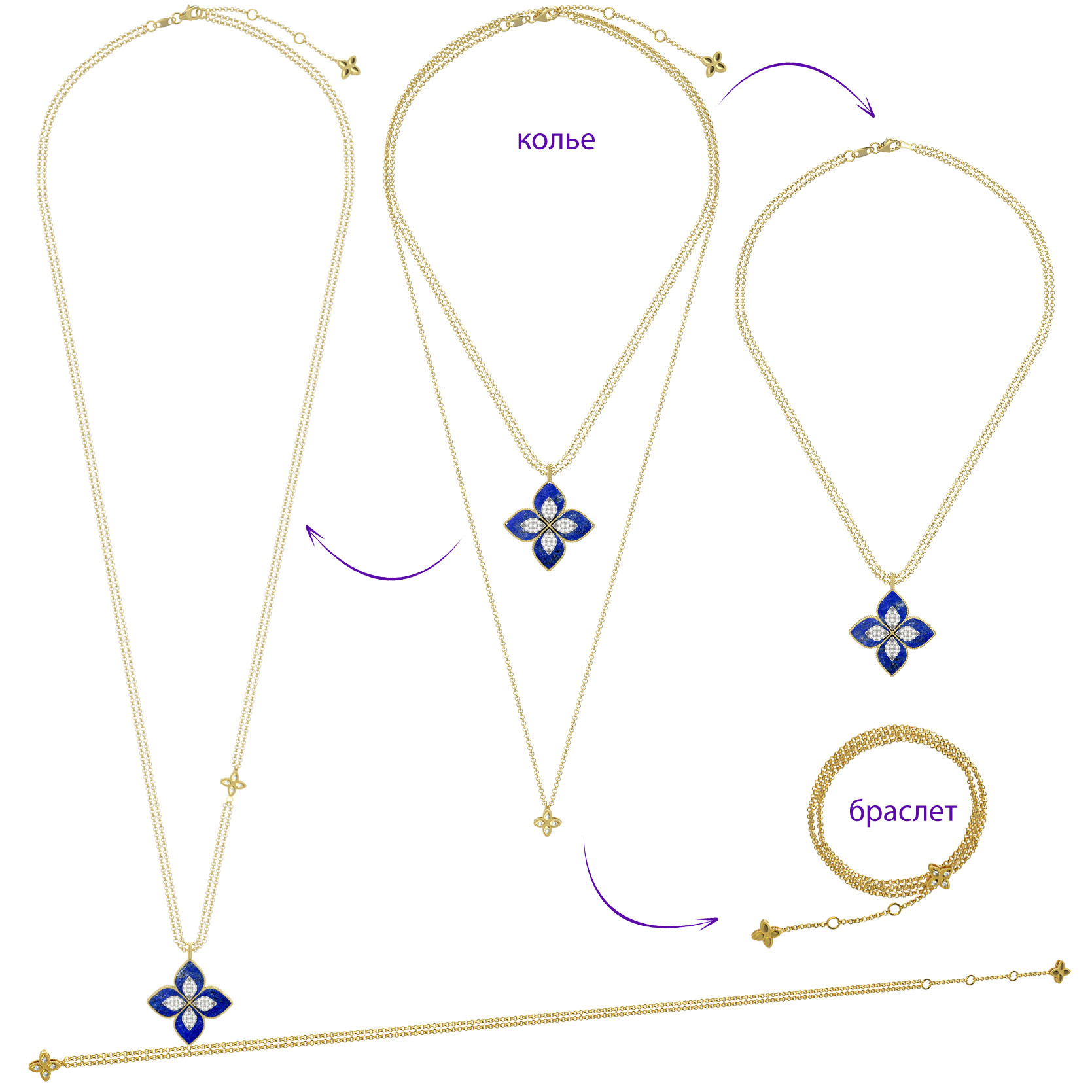 Роскошное колье из лимонного золота 585 пробы — воплощение ювелирного искусства, вдохновленное эстетикой De Luxe — Венецианская принцесса. Этот изысканный аксессуар сочетает в себе благородный оттенок драгоценного металла с глубоким, насыщенным цветом натурального лазурита. Центральный элемент дизайна выполнен в форме нежного клевера, лепестки которого создают гармоничный контраст синего цвета вставки и сияния 56 бриллиантов.