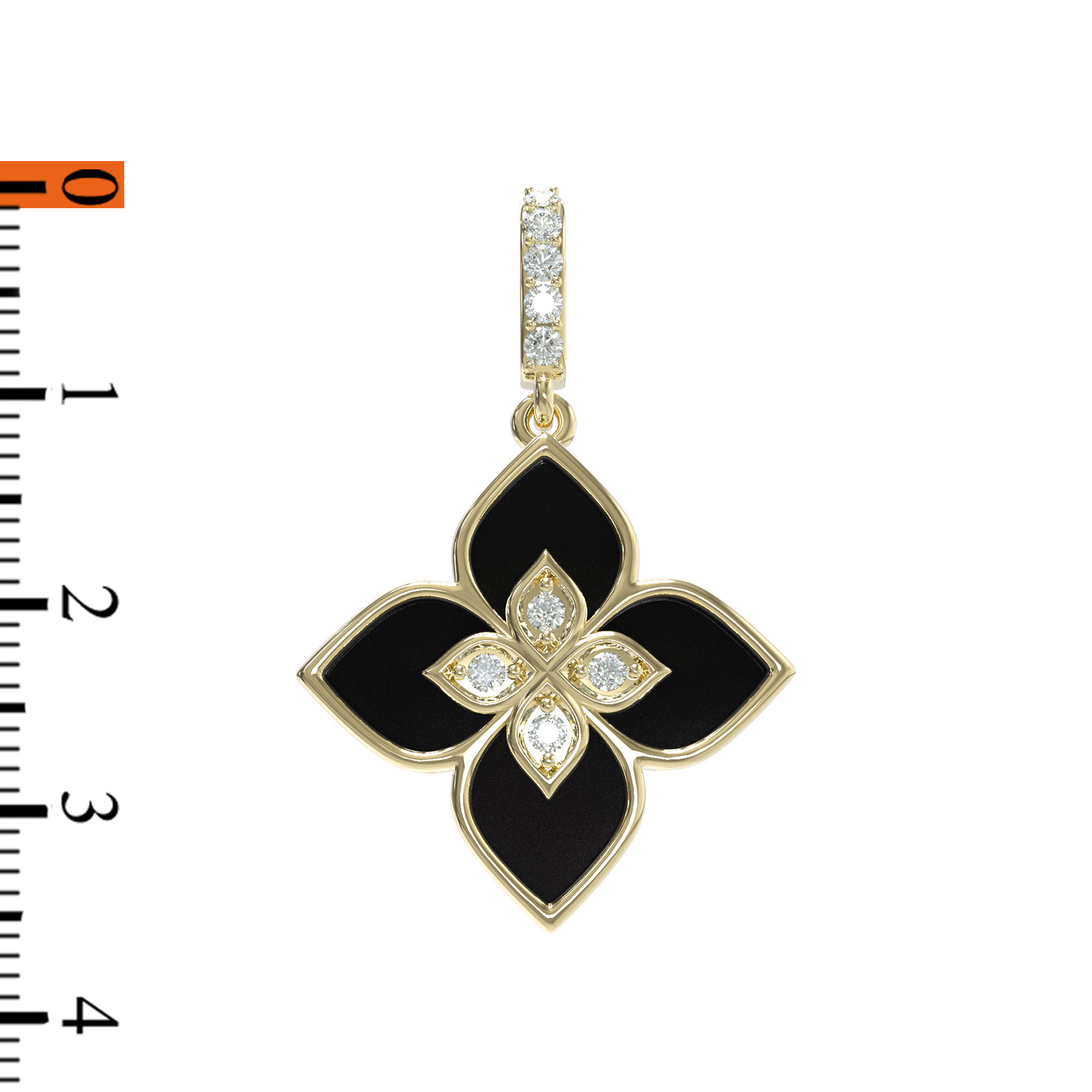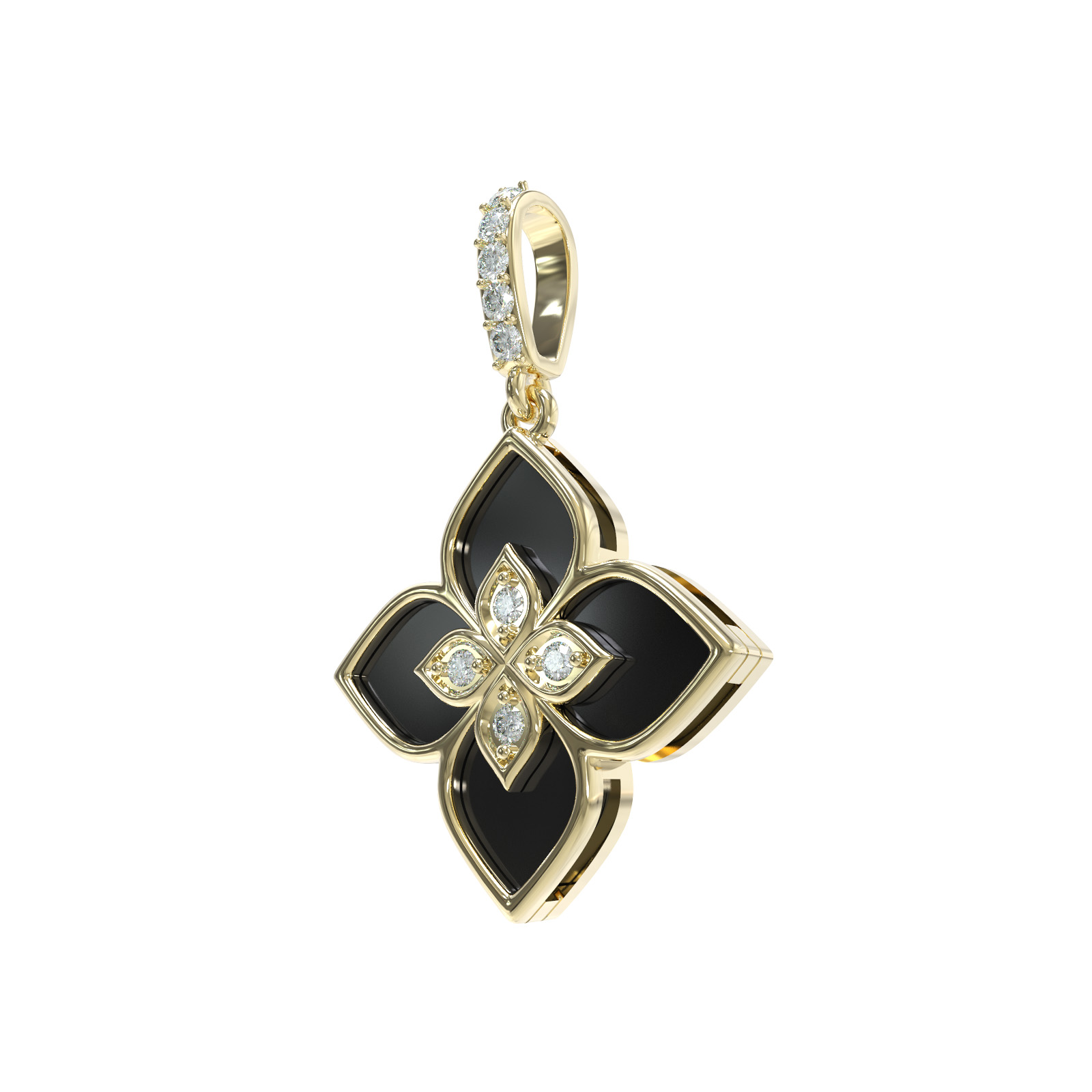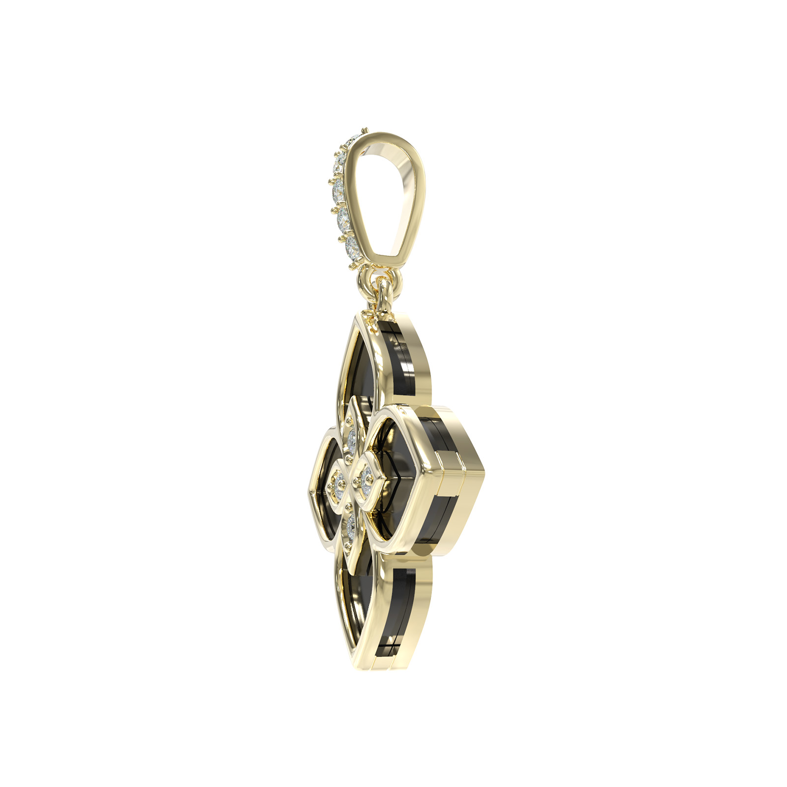 В центре композиции и на изящном креплении расположены 10 вставок, среди которых сияющие бриллианты круглой формы. Белый блеск драгоценных камней подчеркивает строгость черных вставок оникса, формируя сложный и гармоничный узор. Подвеска выполнена с мастерским вниманием к деталям, что делает ее универсальным украшением, подходящим как для женщин, так и для мужчин, предпочитающих премиальные аксессуары.