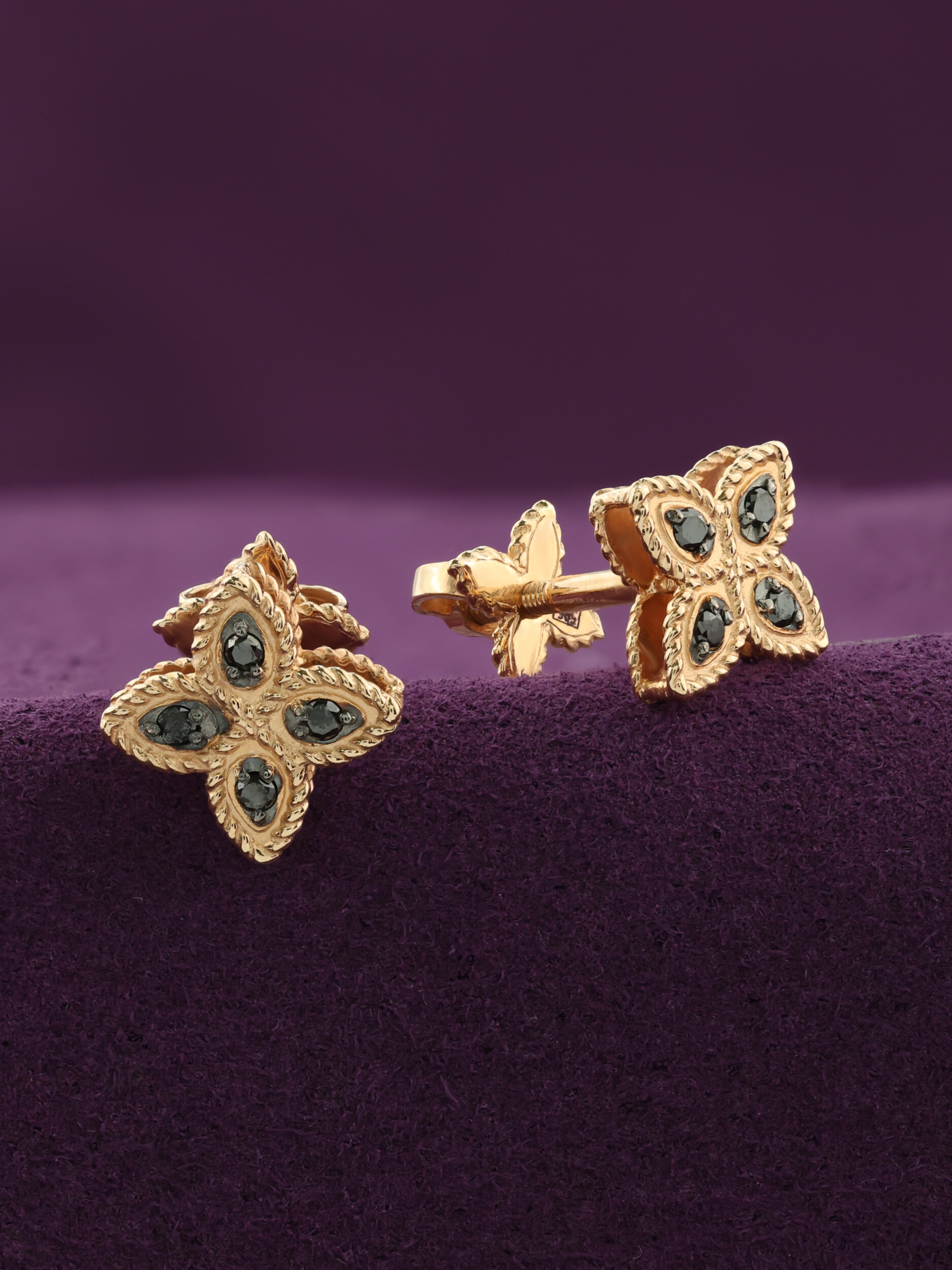 Центральным элементом композиции выступают черные бриллианты, которые создают завораживающий контраст с красным золотом. В каждой серьге гармонично расположились вставки круглой формы — всего изделие украшают 8 бриллиантов, которые притягивают взгляд своим глубоким и таинственным сиянием. Такая игра света и цвета делает эти серьги универсальным аксессуаром, способным дополнить как повседневный деловой образ, так и вечерний наряд.