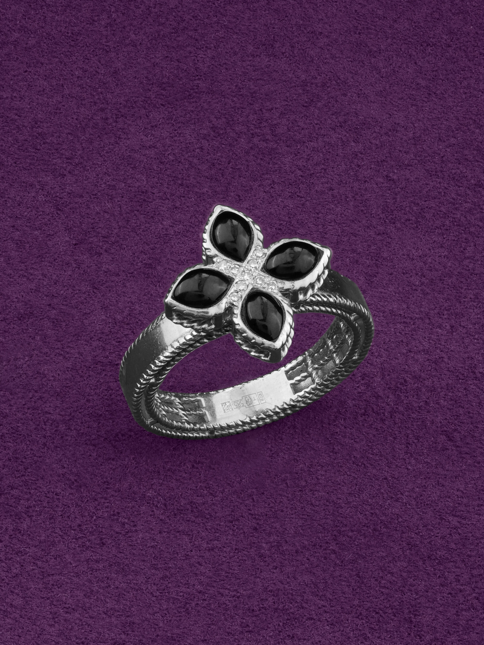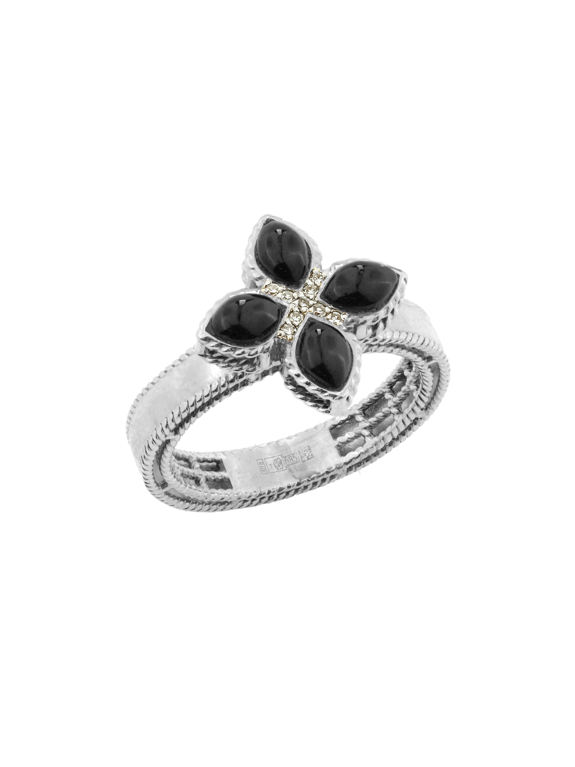 Элегантное кольцо из белого золота 585 пробы из коллекции De Luxe — Венецианская принцесса станет безупречным акцентом вашего образа. Дизайн украшения выполнен в форме клевера, который притягивает взгляд своей утонченной геометрией. Ювелирная композиция сочетает в себе благородство белого металла и контрастное сочетание вставок: глубокий черный оникс в форме лепестка эффектно обрамлен сверкающими круглыми бриллиантами. Всего в изделии использовано 13 вставок, создающих гармоничный дуэт белого и черного цветов.