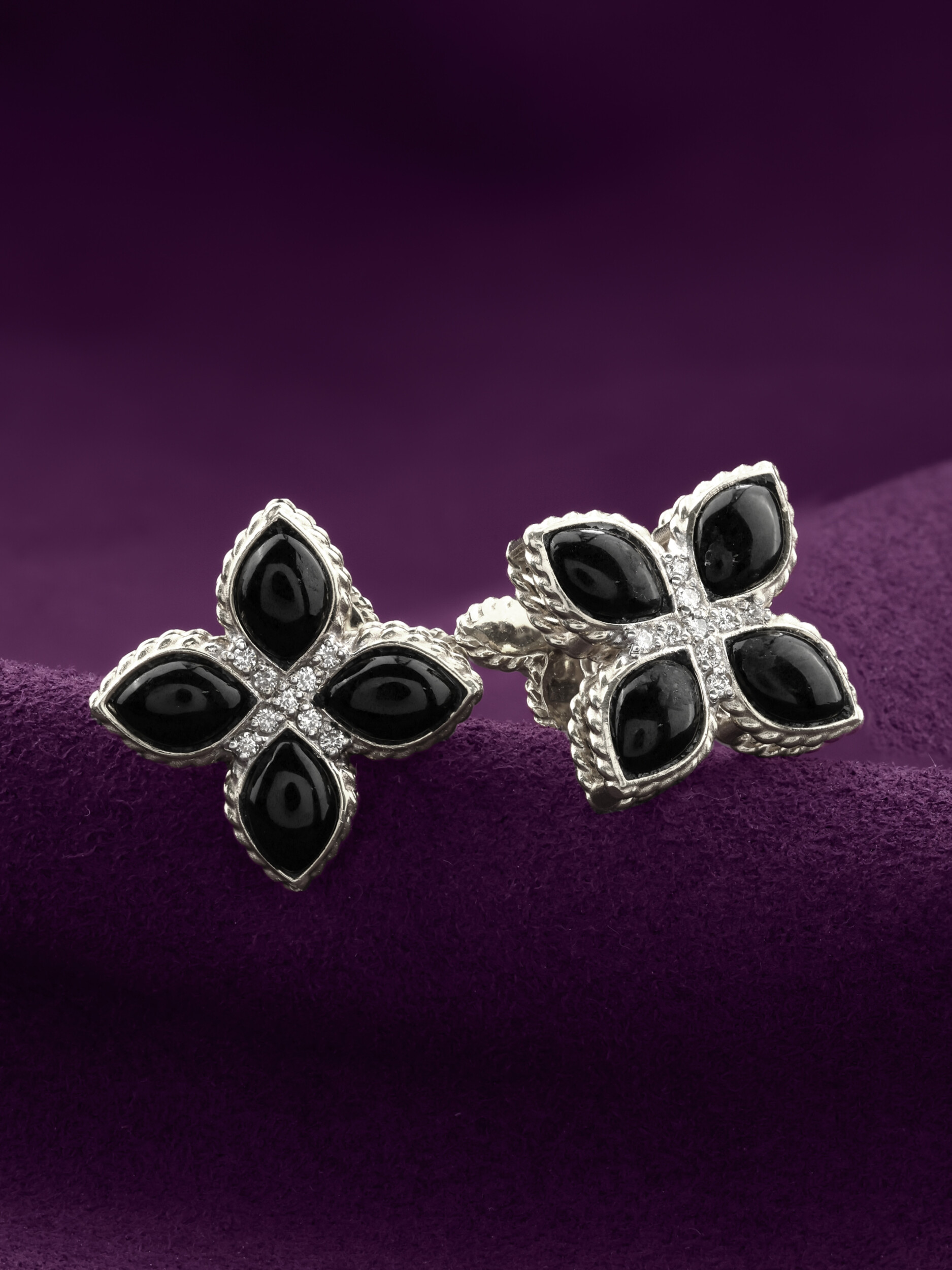 Всего в изделии предусмотрено 26 вставок, каждая из которых подчеркивает безупречное мастерство исполнения. Оникс огранен в форме лепестка, что добавляет мягкости строгой геометрии цветка. Белое золото идеально обрамляет вставки, создавая эффектное сияние. Эти серьги подойдут как для женщин, так и для мужчин, предпочитающих статусные аксессуары с глубоким смыслом. Лаконичный, но эффектный дизайн позволяет сочетать их с другими украшениями, создавая гармоничные комплекты для торжественных выходов или особых случаев.