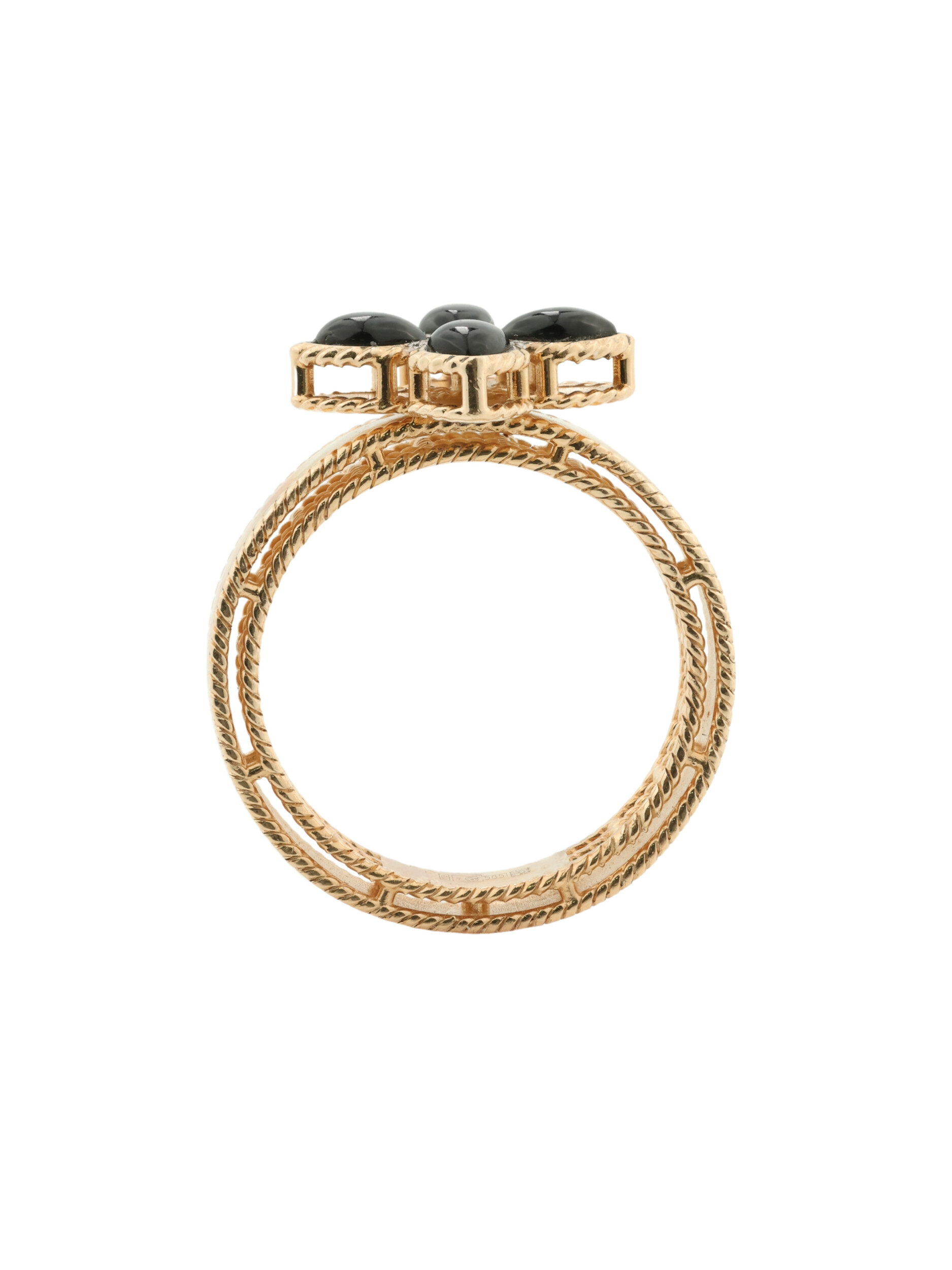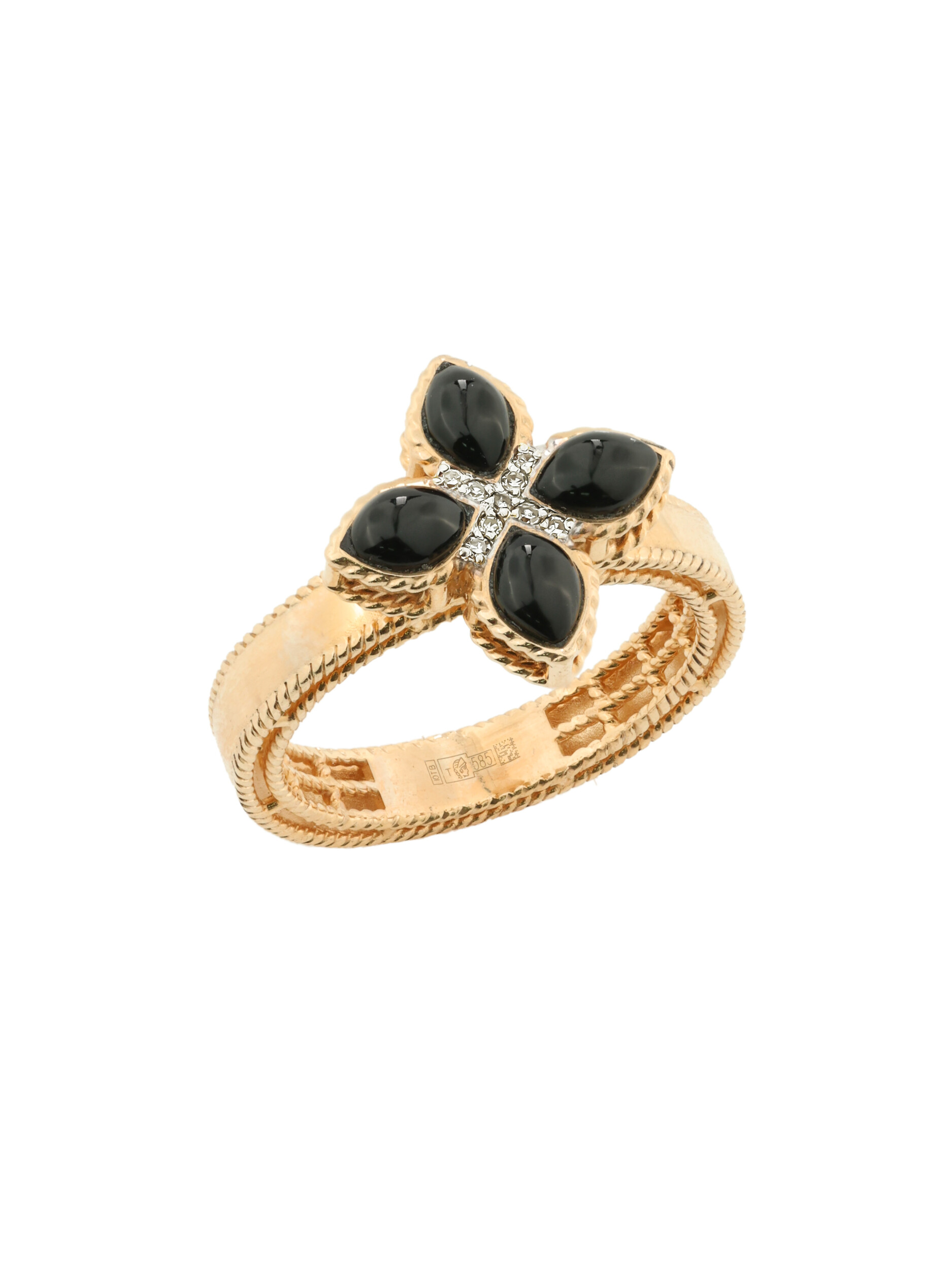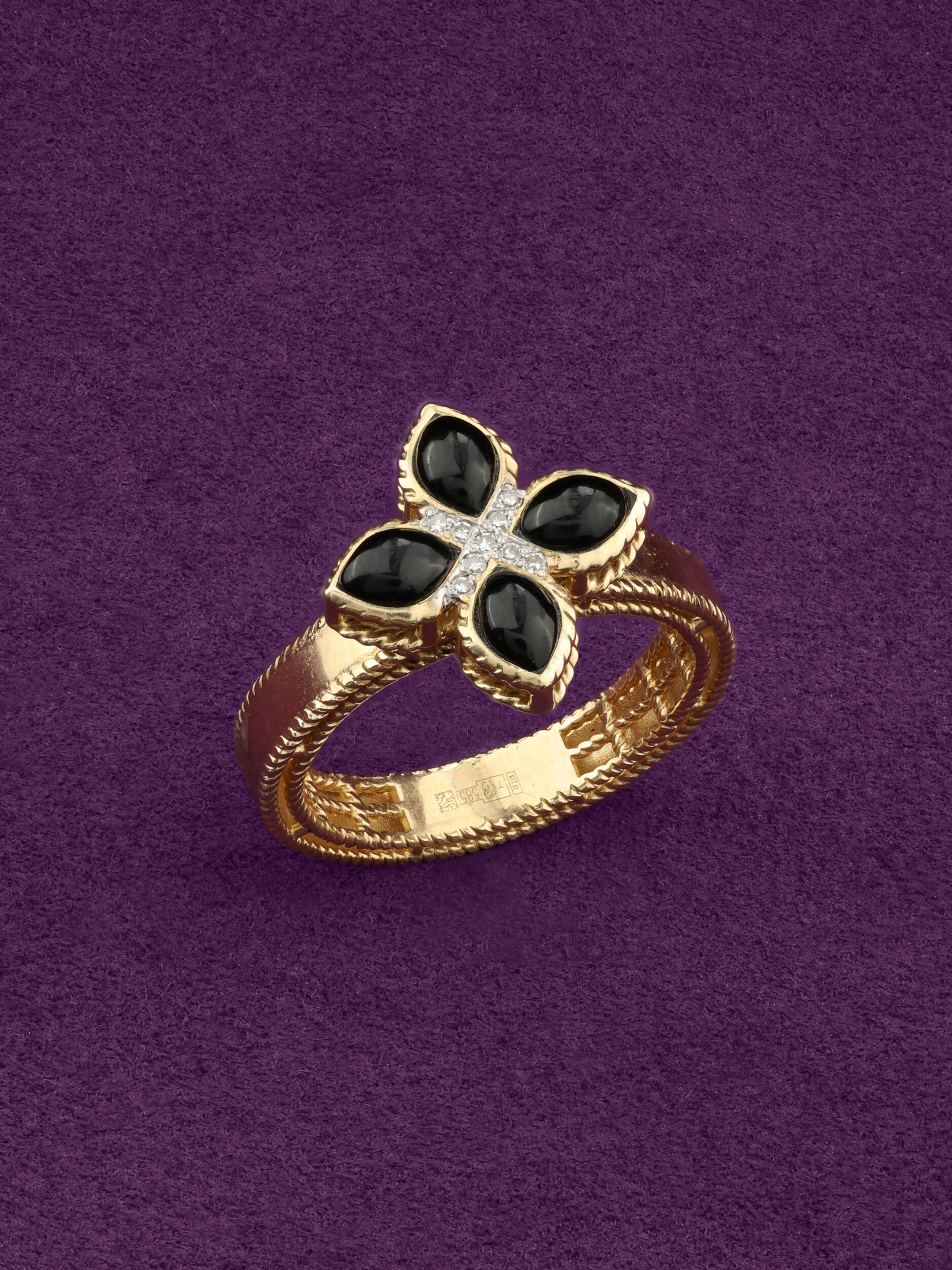 Изысканное кольцо из красного золота 585 пробы станет утонченным дополнением вашего образа. Это украшение из коллекции De Luxe — Венецианская принцесса выполнено в стиле клевер, который давно стал символом элегантности и безупречного вкуса. В центре композиции расположены четыре вставки в форме лепестка из глубокого черного оникса, гармонично сочетающиеся с блеском 13 вставок из прозрачных бриллиантов круглой огранки.