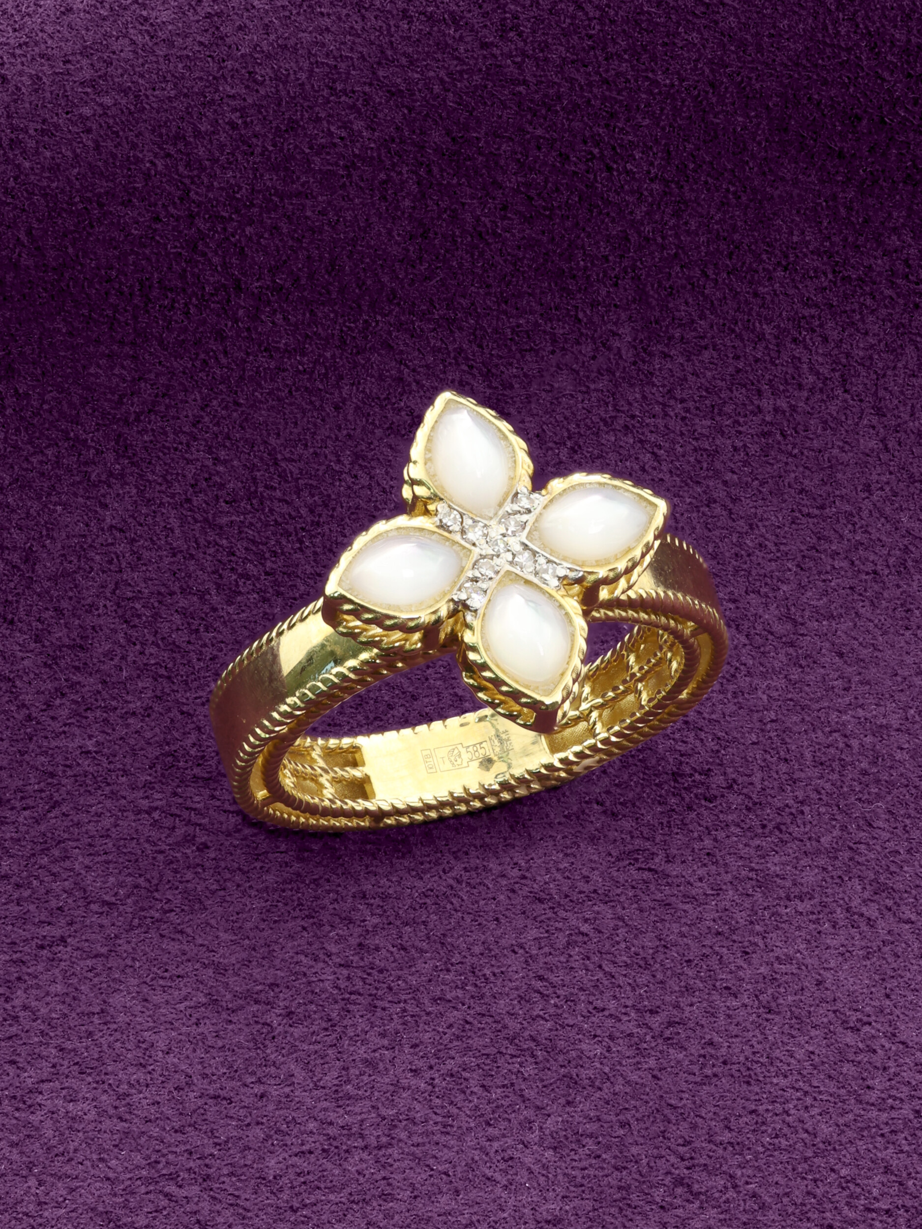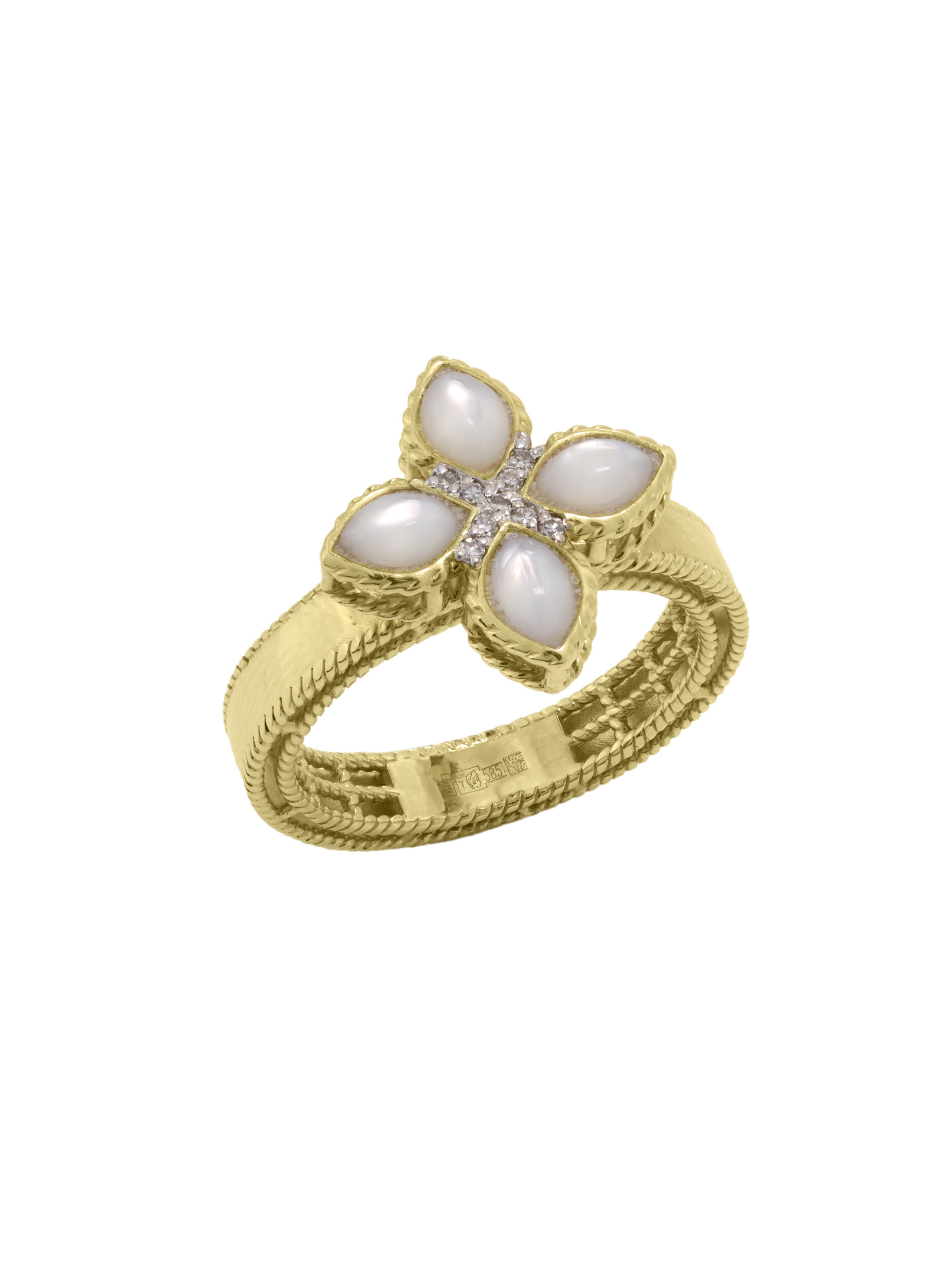 Элегантное кольцо из лимонного золота 585 пробы из коллекции De Luxe — Венецианская принцесса станет безупречным акцентом вашего образа. Дизайн украшения выполнен в форме клевера, который традиционно считается символом удачи и гармонии. Центральная композиция объединяет благородный блеск металла и нежное сияние вставок: четыре лепестка из натурального перламутра дополнены сверкающими бриллиантами в центре. Всего в изделии использовано 9 вставок, создающих изысканный контраст между белым перламутровым переливом и бриллиантовым блеском.