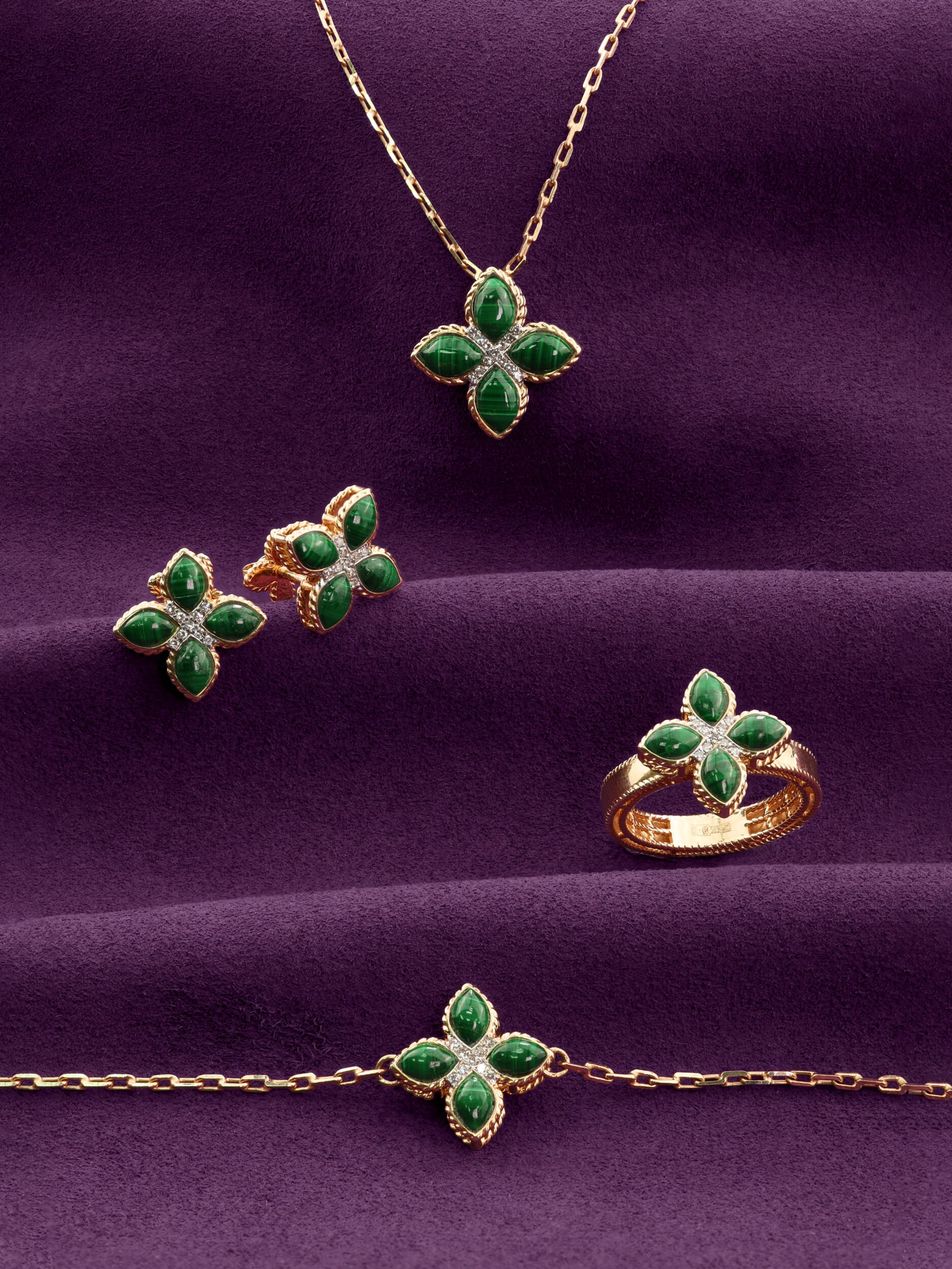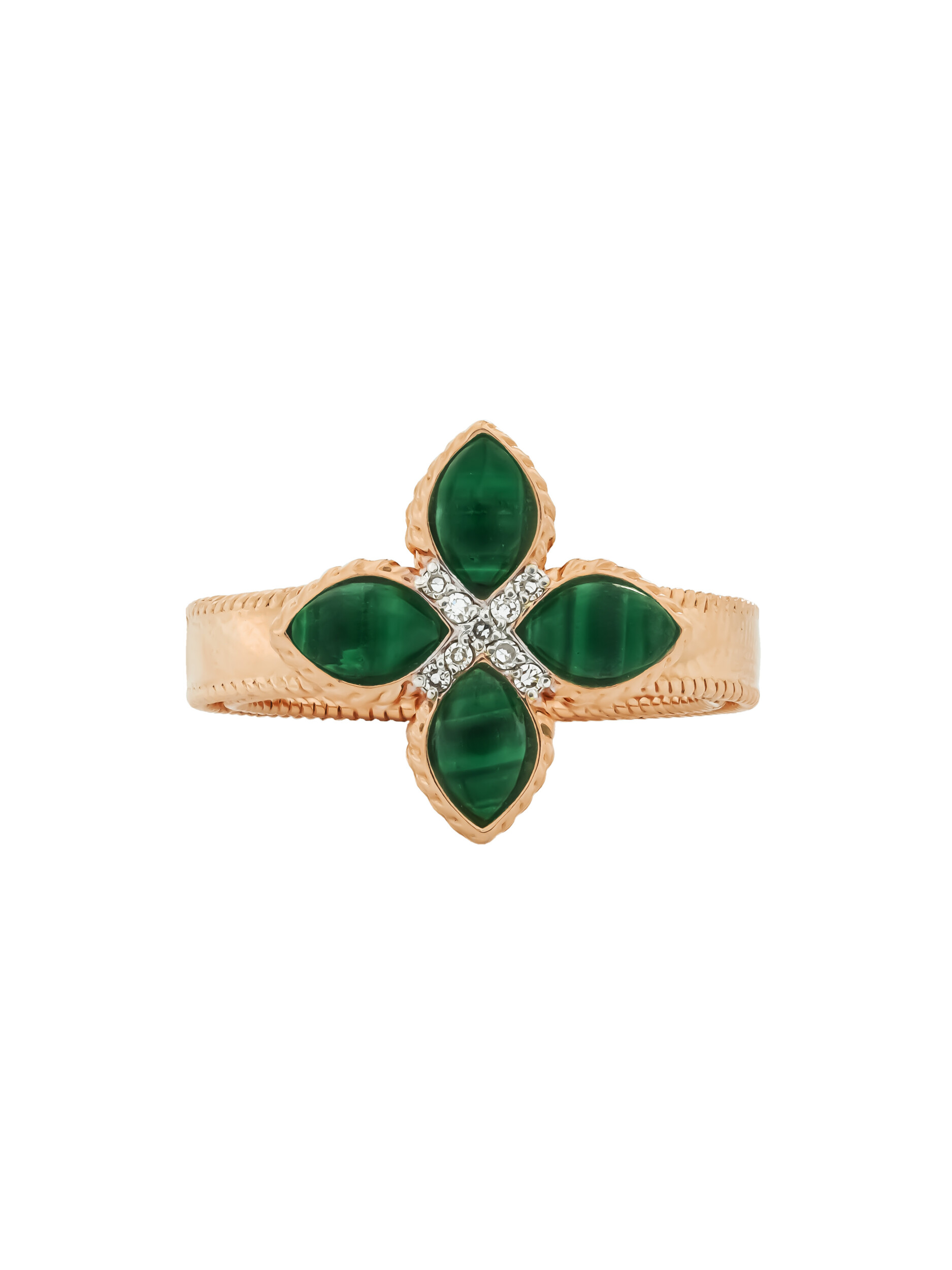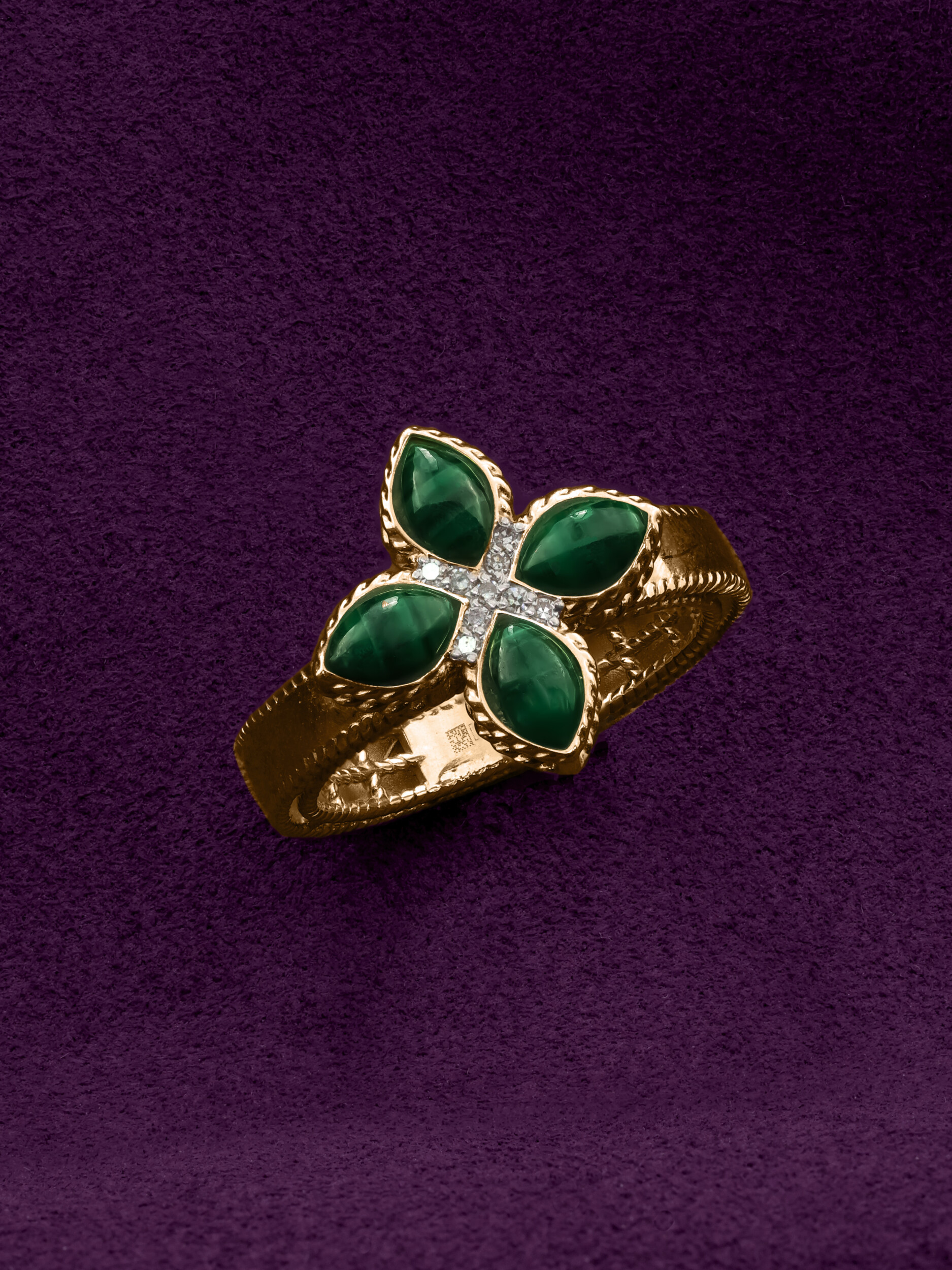 Кольцо из красного золота 585 пробы из коллекции De Luxe — Венецианская принцесса станет безупречным акцентом вашего образа. Дизайн изделия воплощает эстетику классического клевера, где природная красота камней сочетается с благородным металлом. Центральным элементом композиции является искусная инкрустация: насыщенный зеленый малахит в форме лепестка подчеркивает глубину оттенка красного золота, а сверкающие белые бриллианты круглой огранки добавляют украшению роскошного сияния. Всего в изделии использовано 13 вставок, создающих гармоничный и выразительный ансамбль.