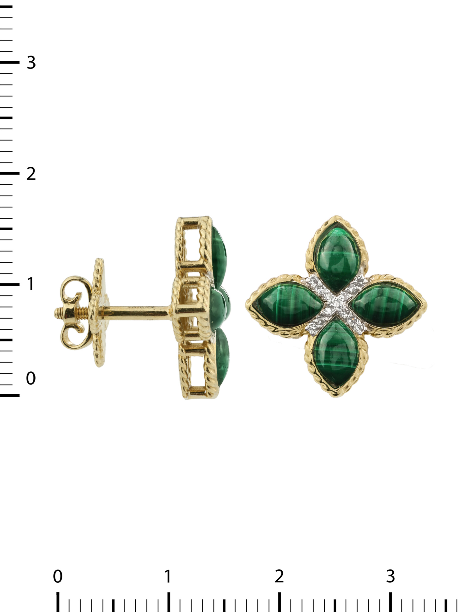 Роскошные серьги из лимонного золота 585 пробы из коллекции De Luxe — Венецианская принцесса станут ярким акцентом в вашем образе. Дизайн изделия выполнен в форме клевера, который притягивает взгляд и символизирует удачу. Центральная часть композиции украшена глубоким зеленым малахитом формы лепесток, цвет которого гармонично дополняется блеском белых бриллиантов круглой формы. Всего в изделии использовано 26 вставок, что придает ему особенный шарм и изысканность.